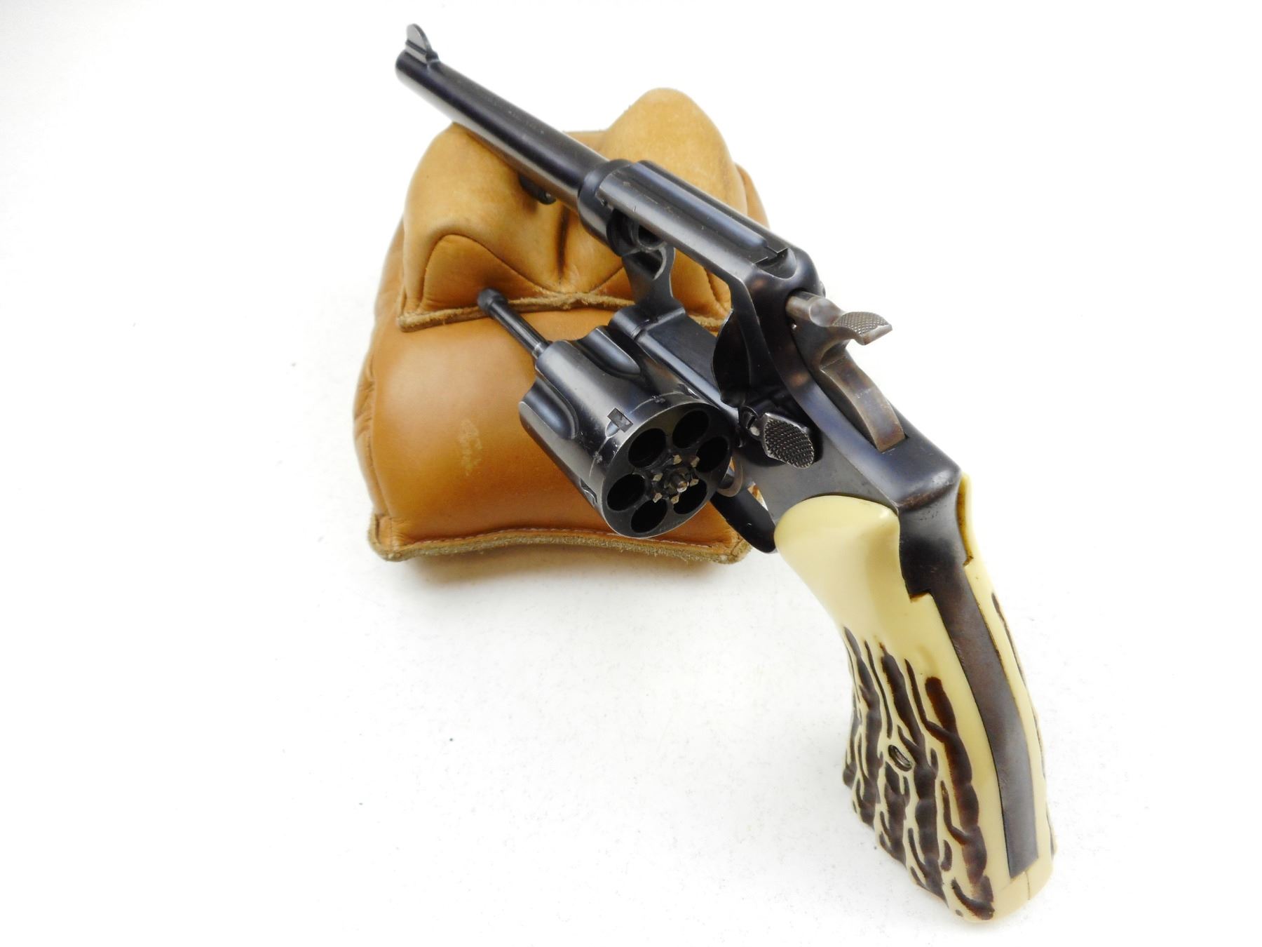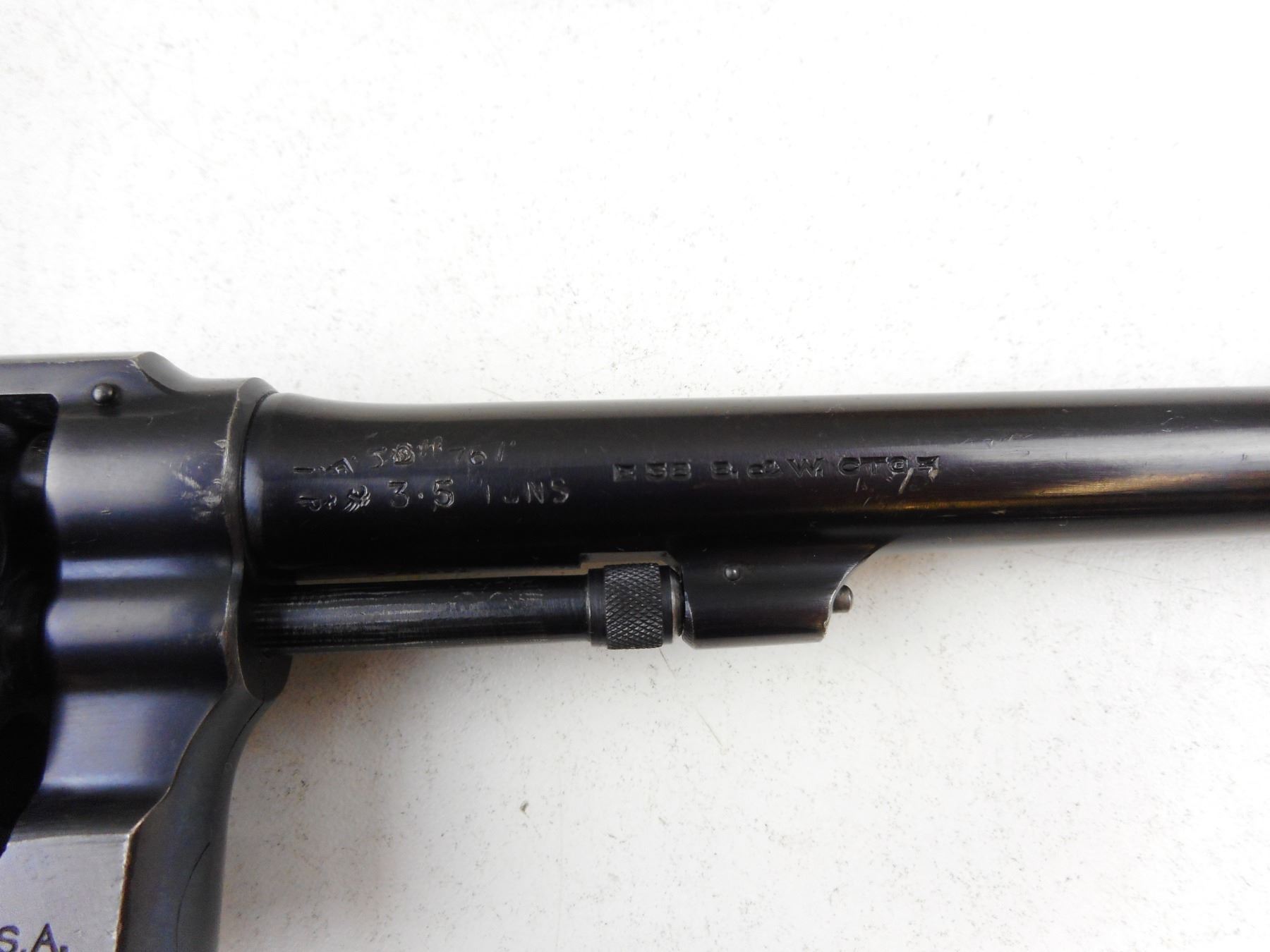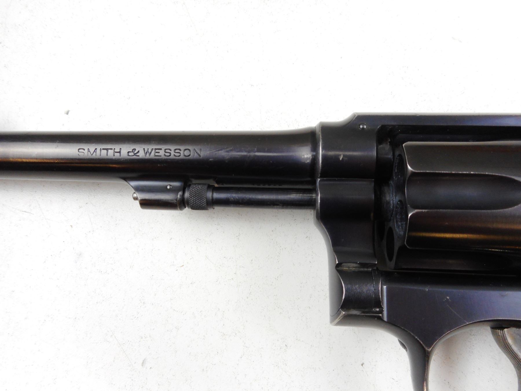 SMITH & WESSON , MODEL: 38/200 BRITISH SERVICE , CALIBER: 38S&W , REPLACEMENT PLASTIC GRIPS, NO LANYARD LOOP, BLUE FINISH WITH WEAR SHOWING ON GRIP STRAPS AND MUZZLE, EXCELLENT BORE, LOCKS UP AND INDEXES WELL, NOTCH & BLADE SIGHTS , ACTION: REVOLVER , BARREL LENGTH: 152MM , CONDITION: 7/10 , STOCK # R2968 , SERIAL # 725608 , CLASS: CANADIAN RESTRICTED CLASS