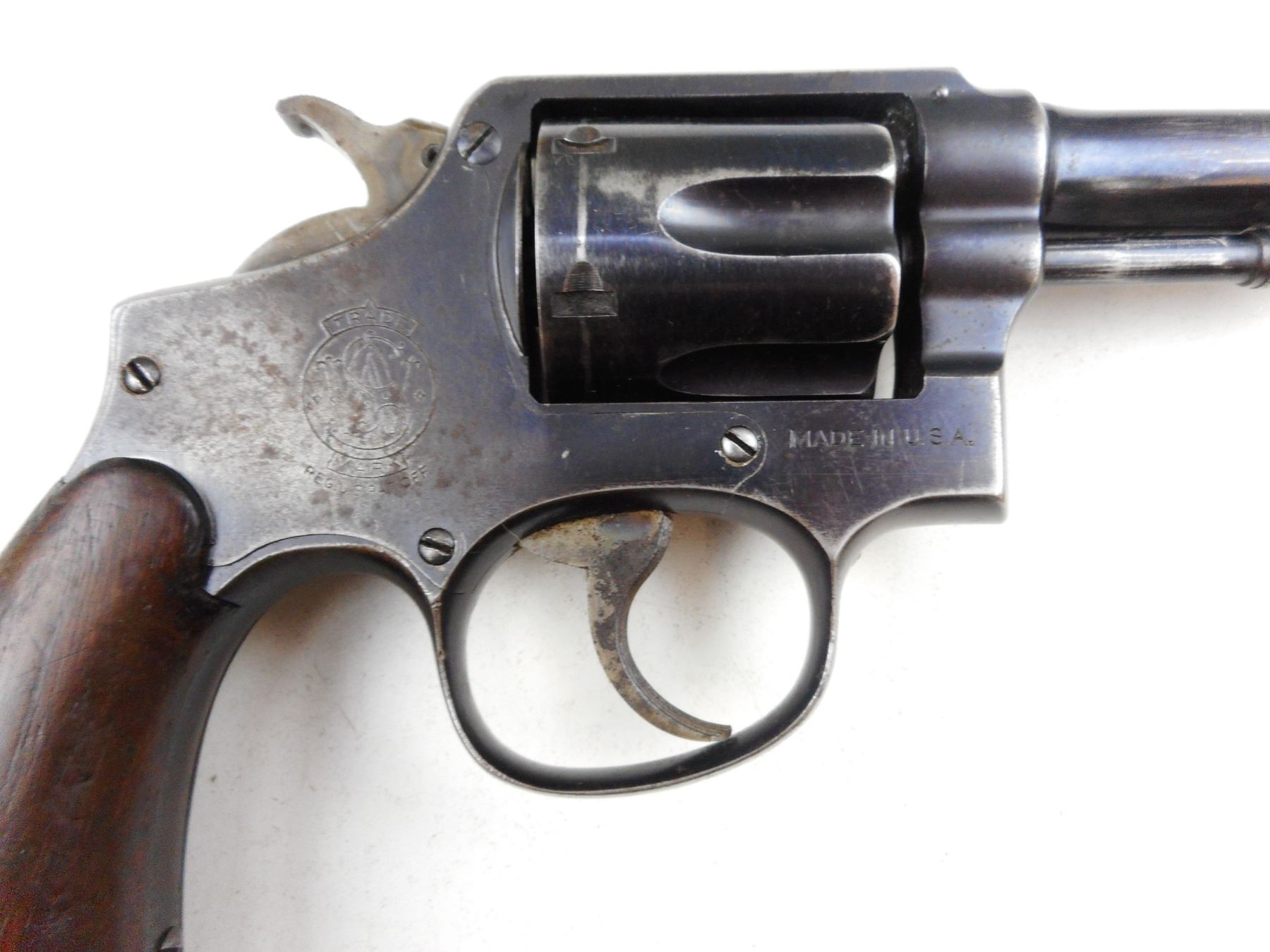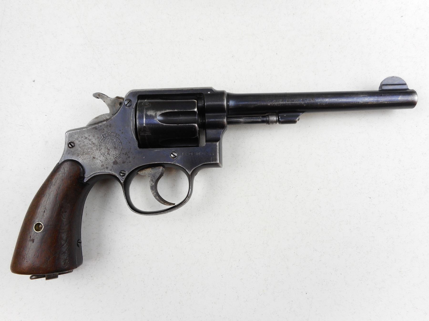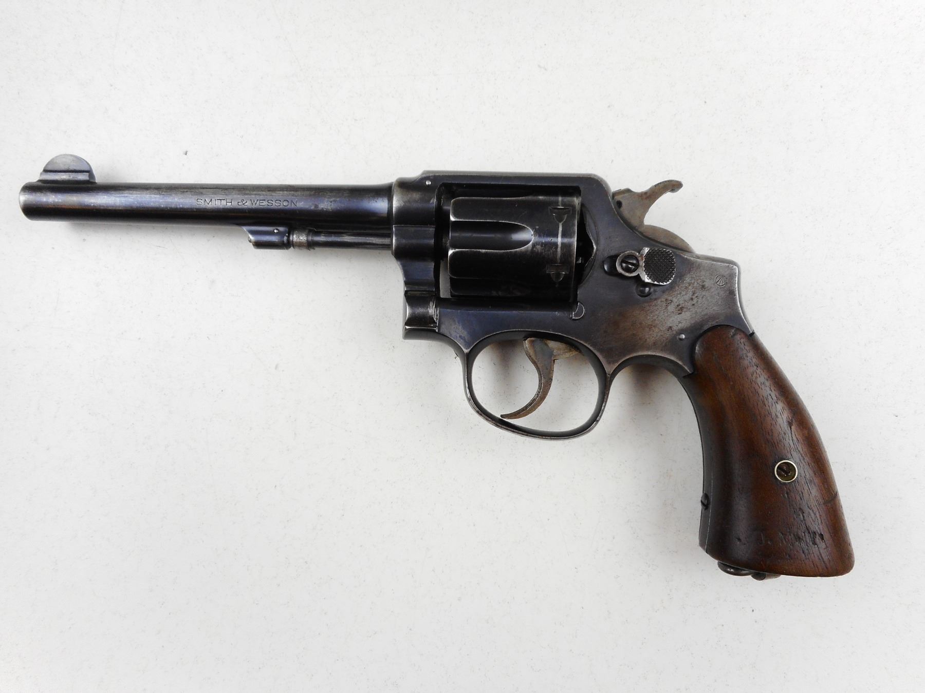SMITH & WESSON , MODEL: H.E. 38 M&P MOD. 3 OF 1905 CHG. 4 , CALIBER: 38S&W , BLUE FINISH WITH WEAR AND MINOR SCRATCHES, SMOOTH WOODEN GRIPS, LANYARD LOOP, EXCELLENT BORE, LOCKS UP AND INDEXES WELL. CND. BROADARROW MARKED. , ACTION: REVOLVER , BARREL LENGTH: 152MM , CONDITION: 7/10 , STOCK # R2969 , SERIAL # 733706 , CLASS: CANADIAN RESTRICTED CLASS