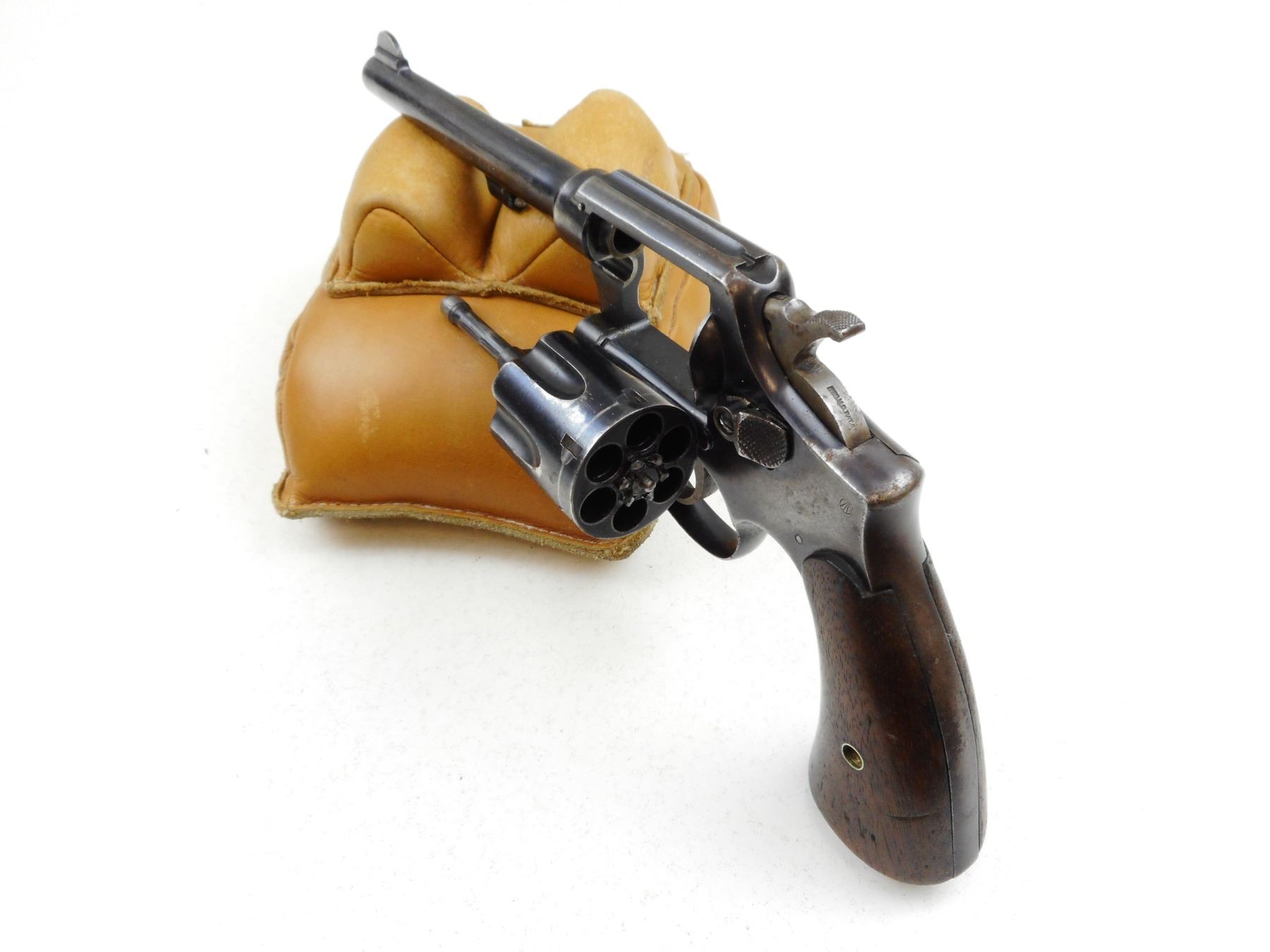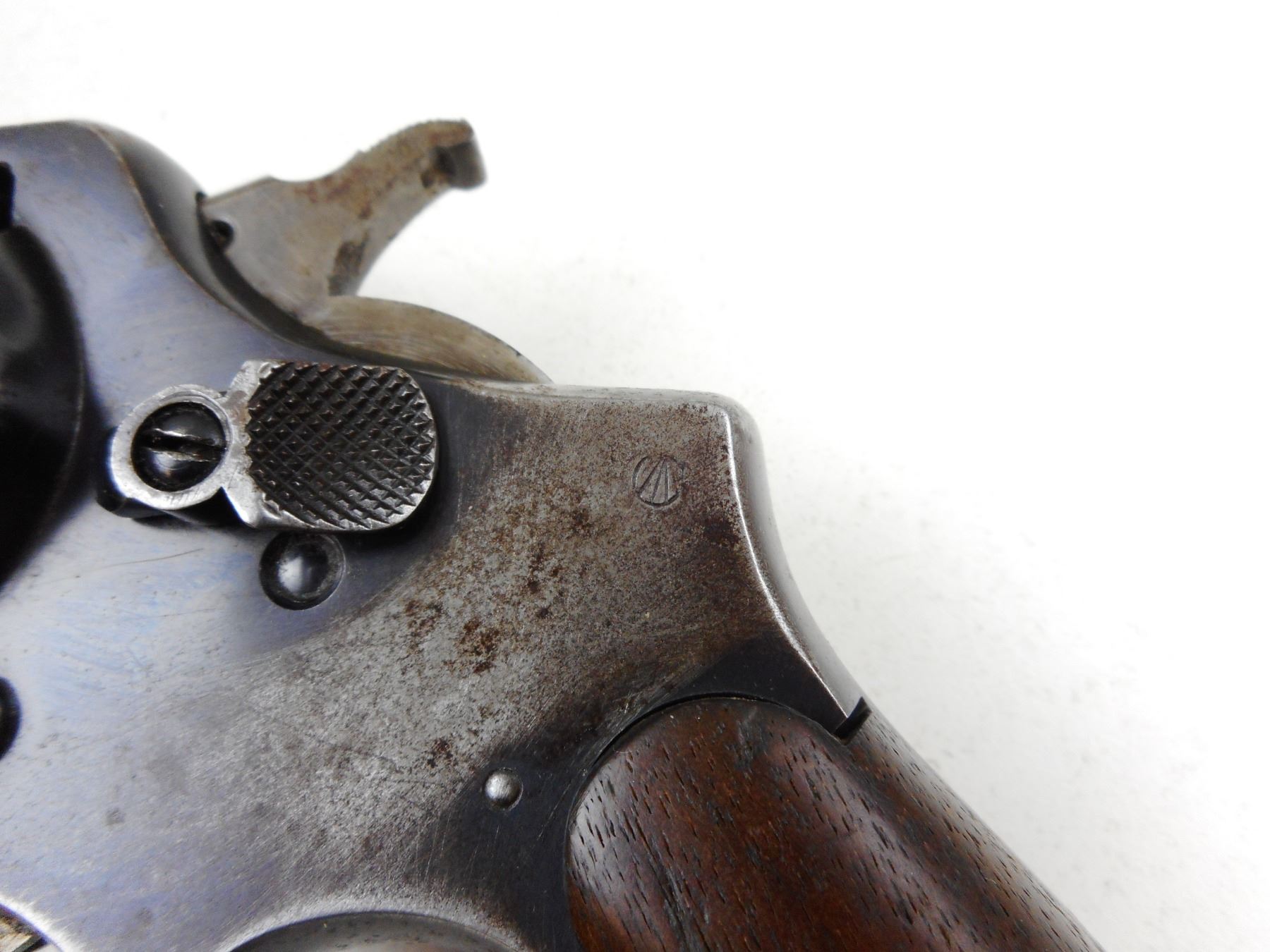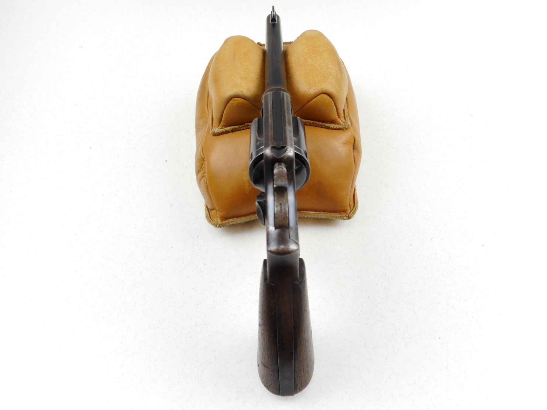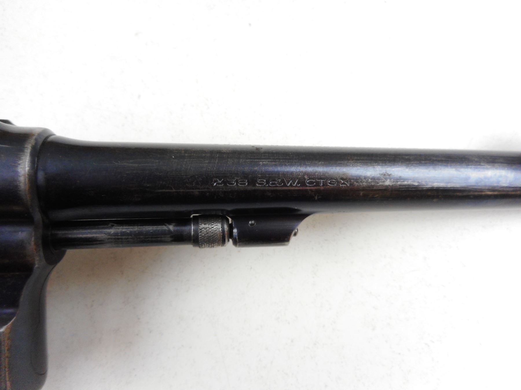 SMITH & WESSON , MODEL: H.E. 38 M&P MOD. 3 OF 1905 CHG. 4 , CALIBER: 38S&W , BLUE FINISH WITH WEAR AND MINOR SCRATCHES, SMOOTH WOODEN GRIPS, LANYARD LOOP, EXCELLENT BORE, LOCKS UP AND INDEXES WELL. CND. BROADARROW MARKED. , ACTION: REVOLVER , BARREL LENGTH: 152MM , CONDITION: 7/10 , STOCK # R2969 , SERIAL # 733706 , CLASS: CANADIAN RESTRICTED CLASS