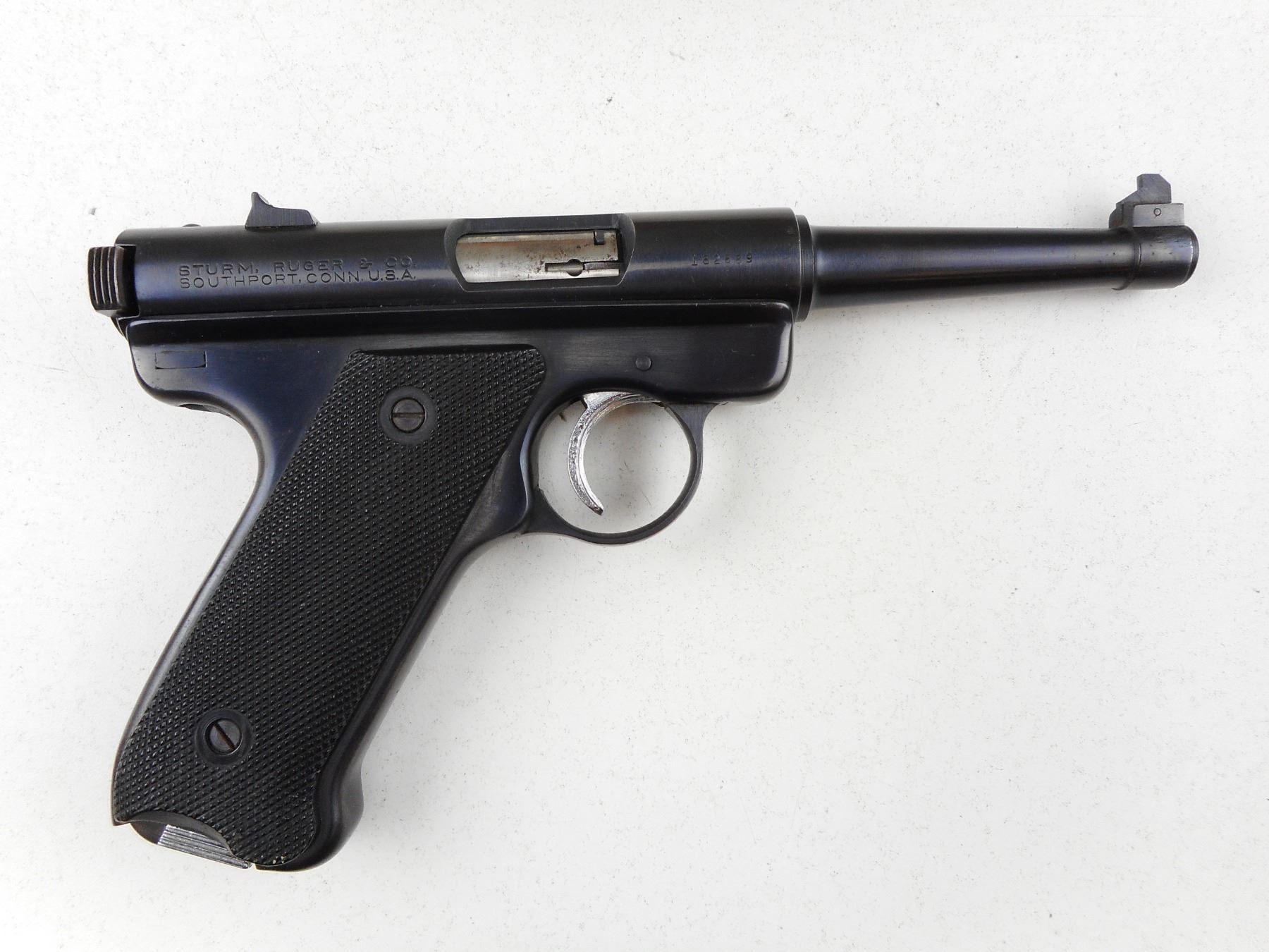 RUGER , MODEL: STANDARD , CALIBER: 22 LR , COMES WITH A MAGAZINE, 9 SHOT CAPACITY, BLADE FRONT AND FIXED REAR SIGHTS, BORE IS VERY GOOD, CHECKERED PLASTIC GRIP PANELS, SHOWS SOME HANDLING MARKS , ACTION: SEMI AUTOMATIC HANDGUN , BARREL LENGTH: 121MM , CONDITION: 6/10 , STOCK # R2991 , SERIAL # 162889 , CLASS: CANADIAN RESTRICTED CLASS