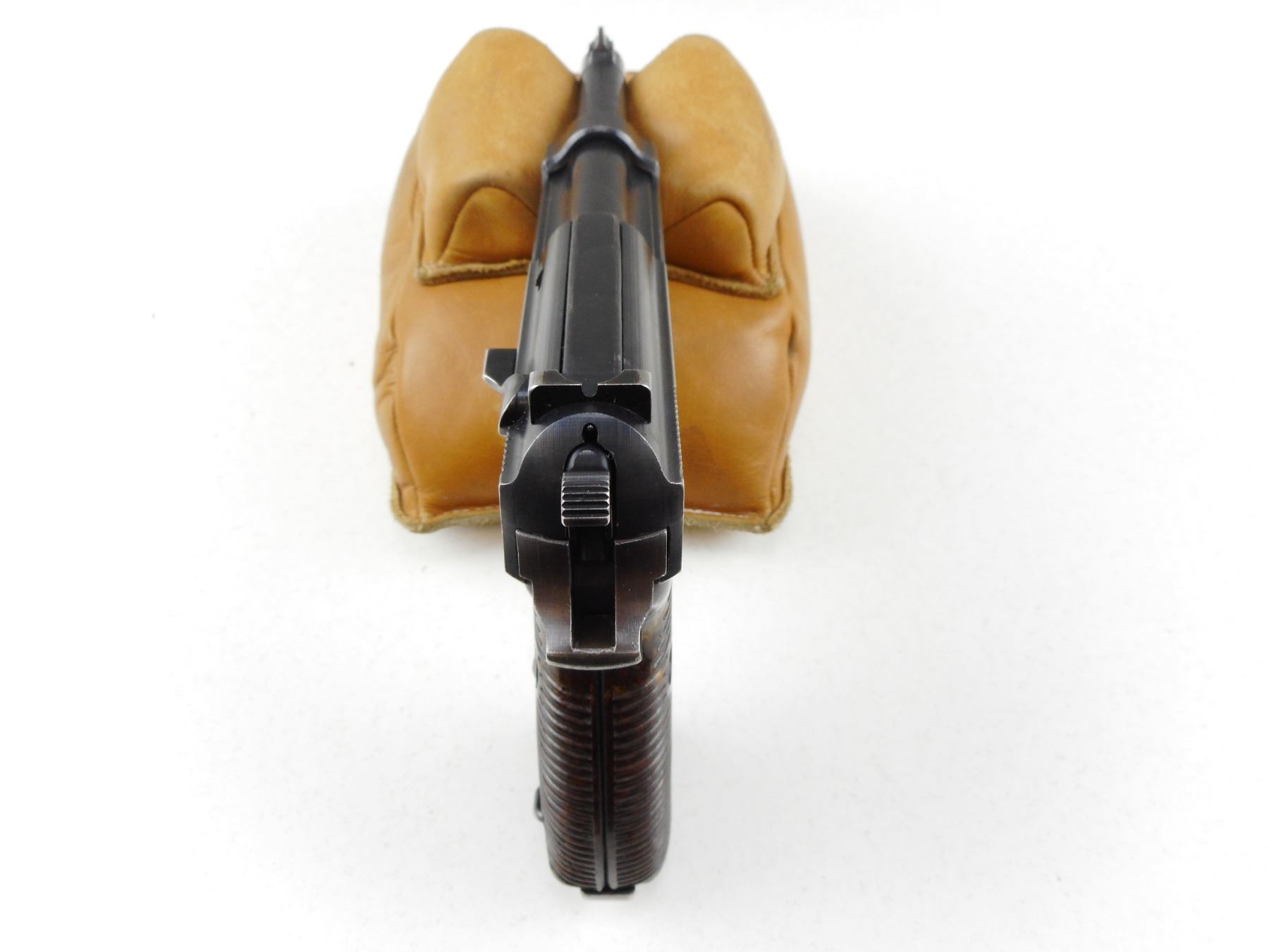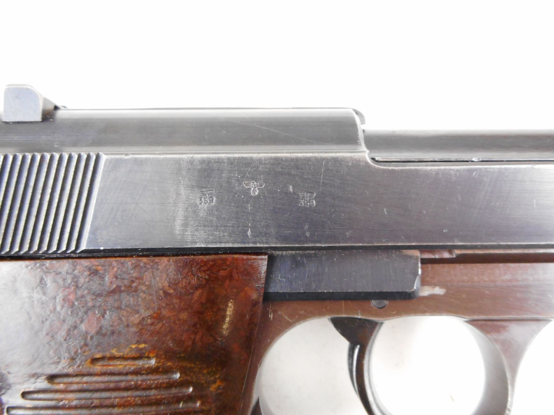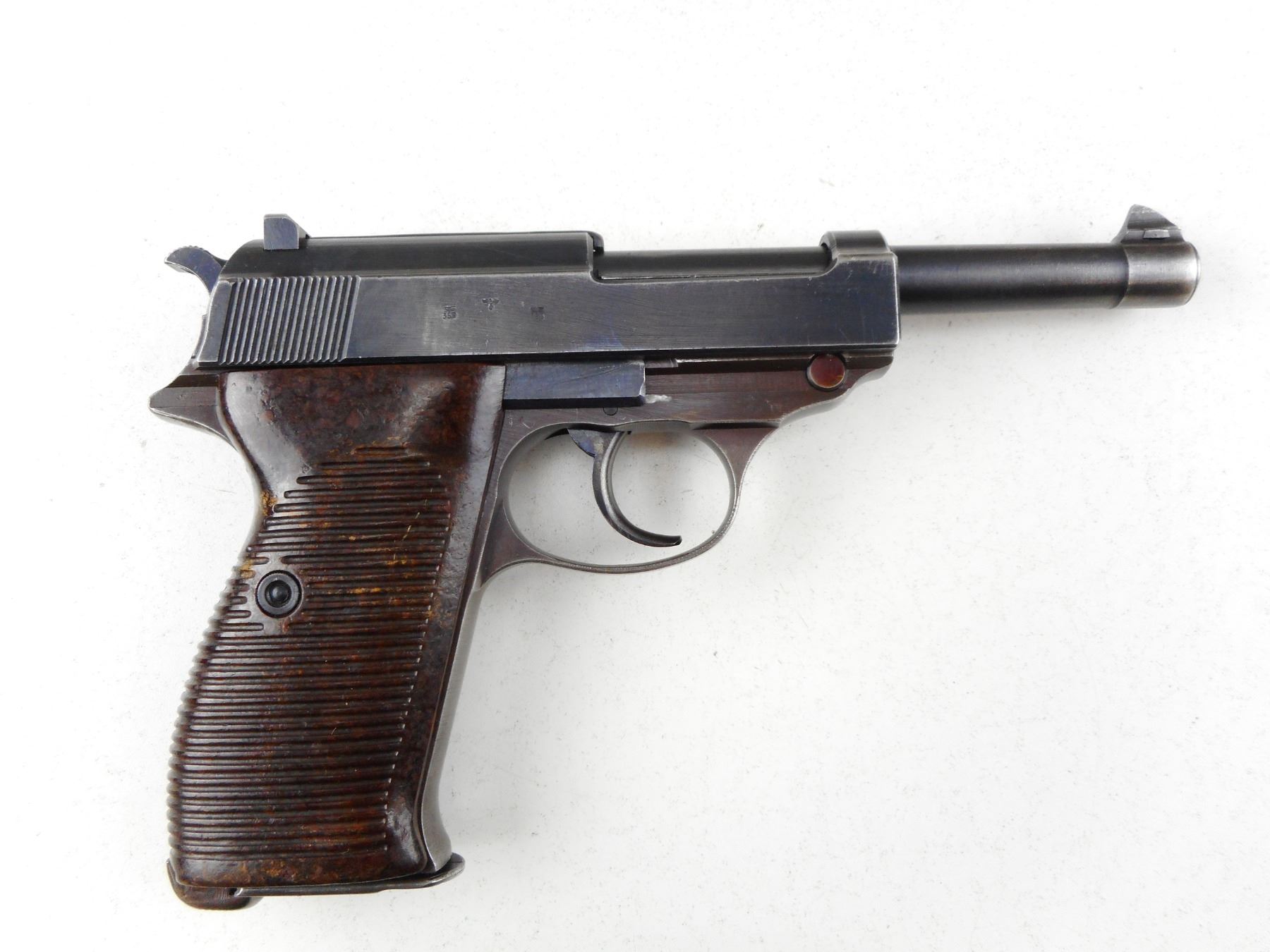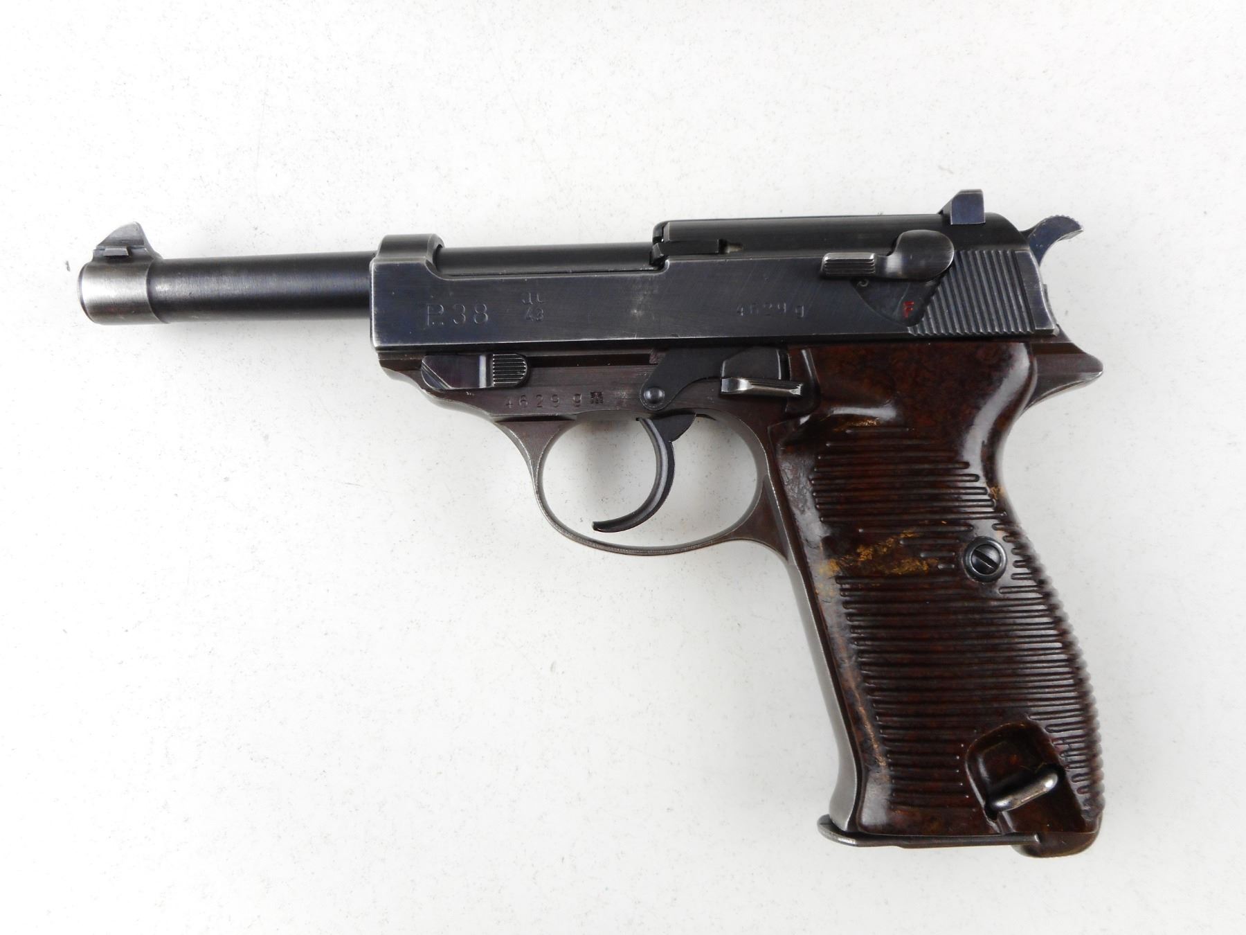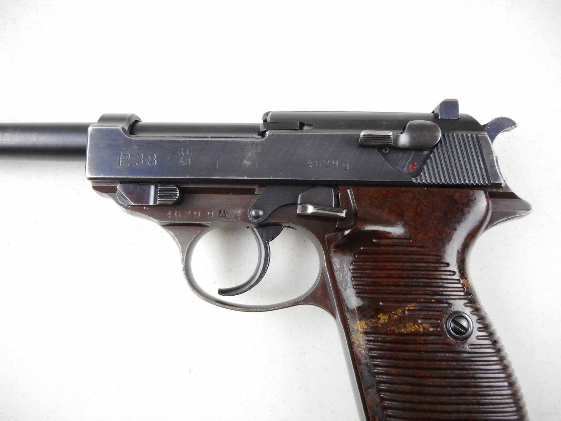 WWII ERA, WALTHER , MODEL: P38 , CALIBER: 9MM LUGER , COMES WITH MAGAZINE, 8 SHOT CAPACITY, BLADE FRONT AND FIXED REAR SIGHTS, VERY GOOD BORE, NUMEROUS GERMAN MILITARY MARKINGS, DATED 1943, SHOWS SOME HANDLING MARKS , ACTION: SEMI-AUTOMATIC HANDGUN , BARREL LENGTH: 121MM , CONDITION: 7/10 , STOCK # R3009 , SERIAL # 4629G , CLASS: CANADIAN RESTRICTED CLASS