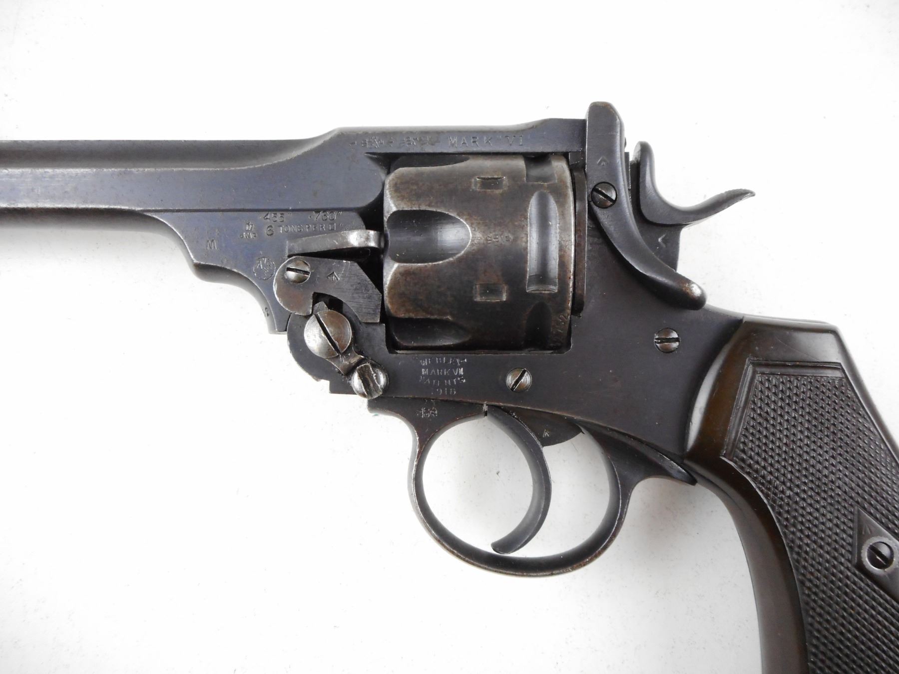 WWI ERA, WEBLEY , MODEL: MARK VI 1918 , CALIBER: 455 REV , DATED 1918, BRD ARROW MARKED, 6 SHOT CAPACITY, BLADE FRONT AND FIXED REAR SIGHT, FLUTED BARREL, EXCELLENT BORE, CHECKERED PLASTIC GRIP PANELS, MISSING THE LANYARD LOOP , ACTION: REVOLVER , BARREL LENGTH: 152MM , CONDITION: 6/10 , STOCK # R3011 , SERIAL # 342752 , CLASS: CANADIAN RESTRICTED CLASS