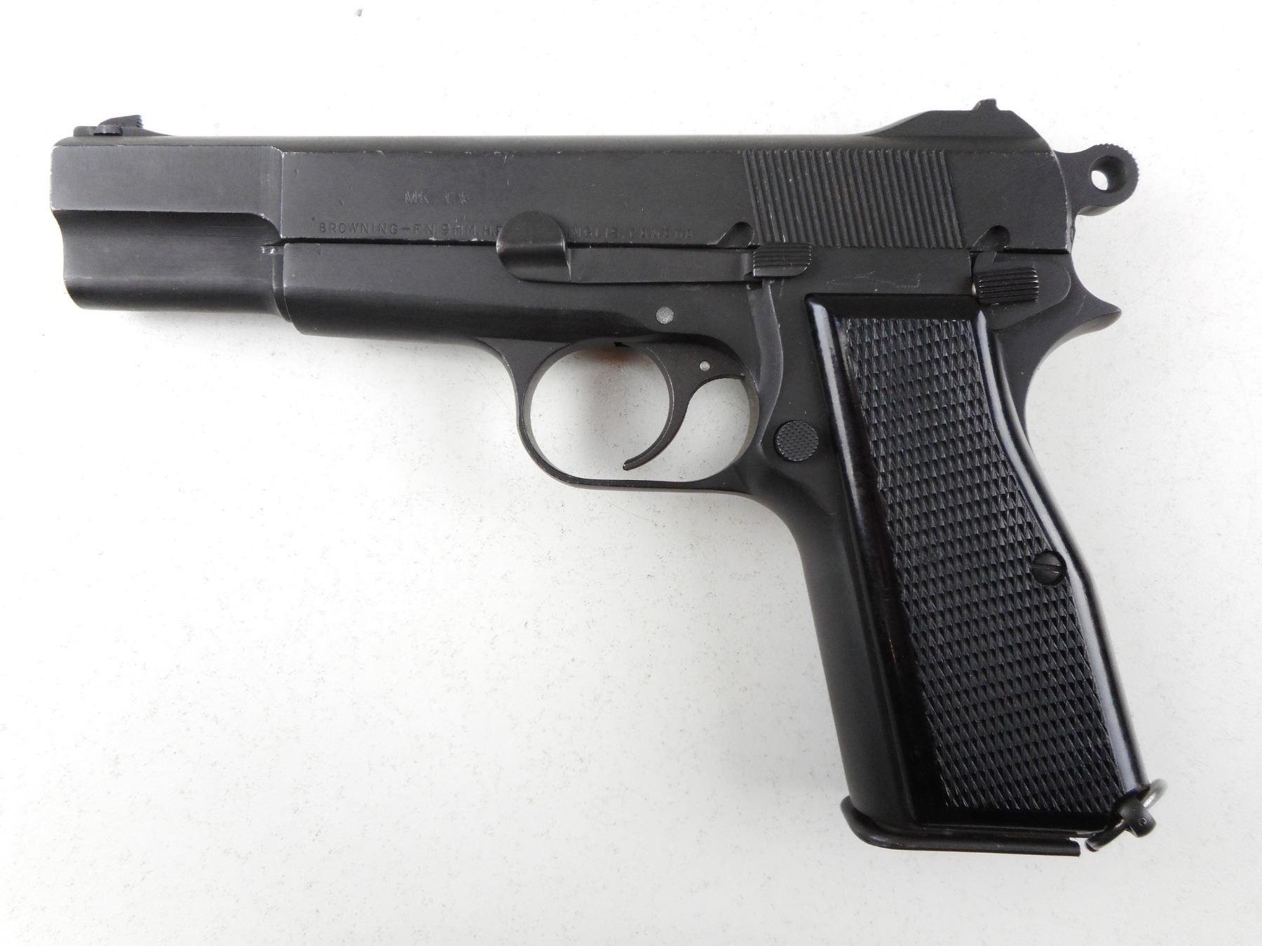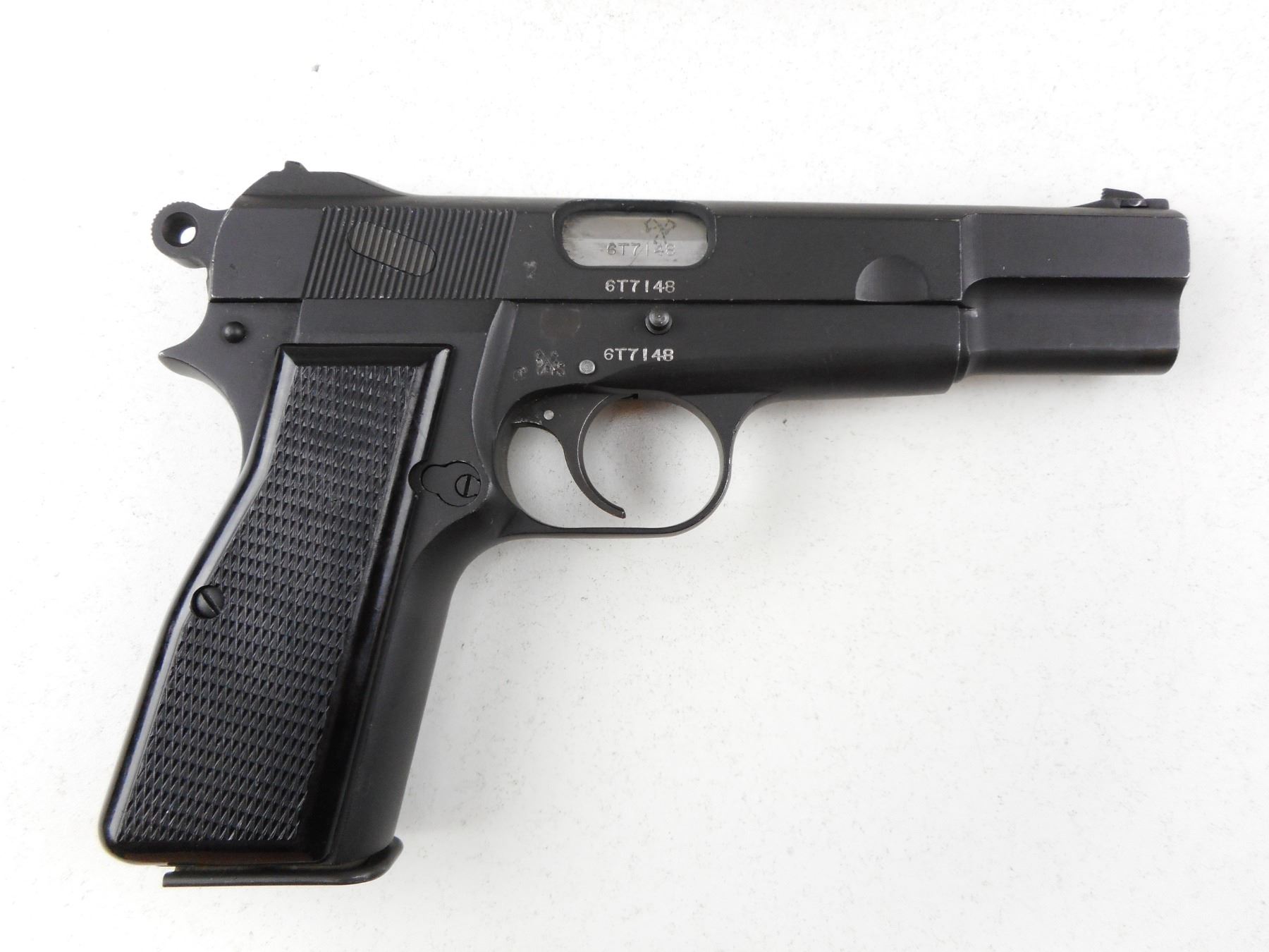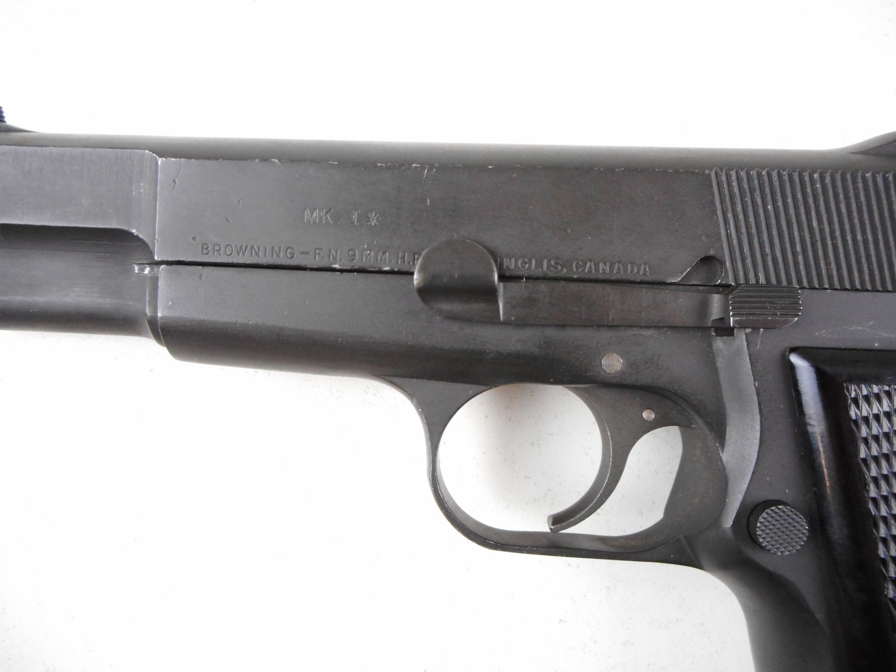 WWII ERA, BROWNING , MODEL: 1935 HIGH POWER NO 2 MARK 1* , CALIBER: 9MM LUGER , COMES WITH MAGAZINE, 10 SHOT CAPACITY, SLIDE BARREL AND RECEIVER ARE ALL MATCHING BY SERIAL #, MILITARY MARKINGS CND ACCEPTANCE MARK, MANUFACTURED BETWEEN 1944-1945, BORE IS FAIR, BLACK PLASTIC CHECKERED GRIP PANELS, LANYARD LOOP, SHOWS SOME HANDLING MARKS, BLADE FRONT AND FIXED REAR SIGHTS , ACTION: SEMI-AUTOMATIC HANDGUN , BARREL LENGTH: 118MM , CONDITION: 7/10 , STOCK # R3014 , SERIAL # 6T7148 , CLASS: CANADIAN RESTRICTED CLASS