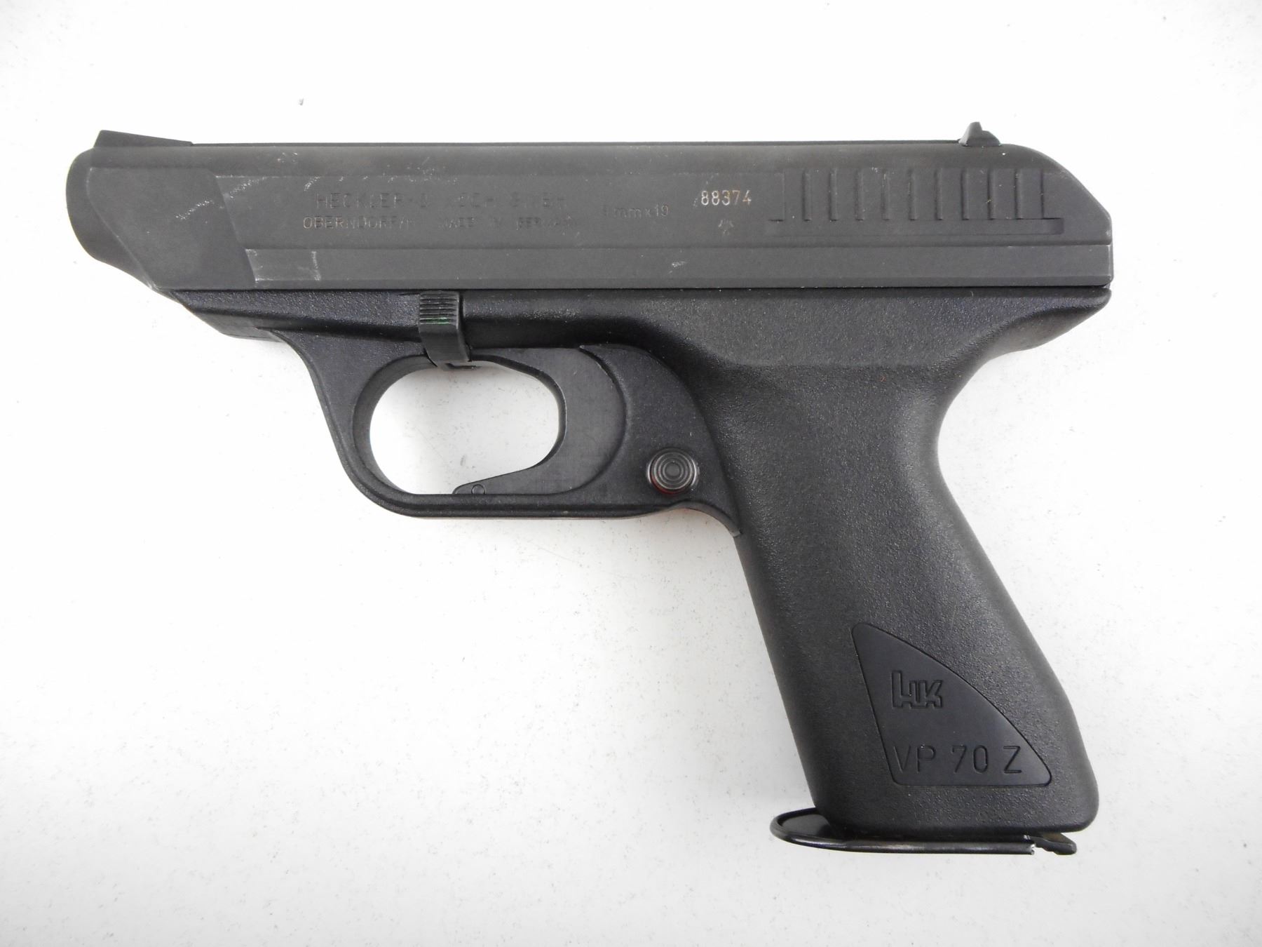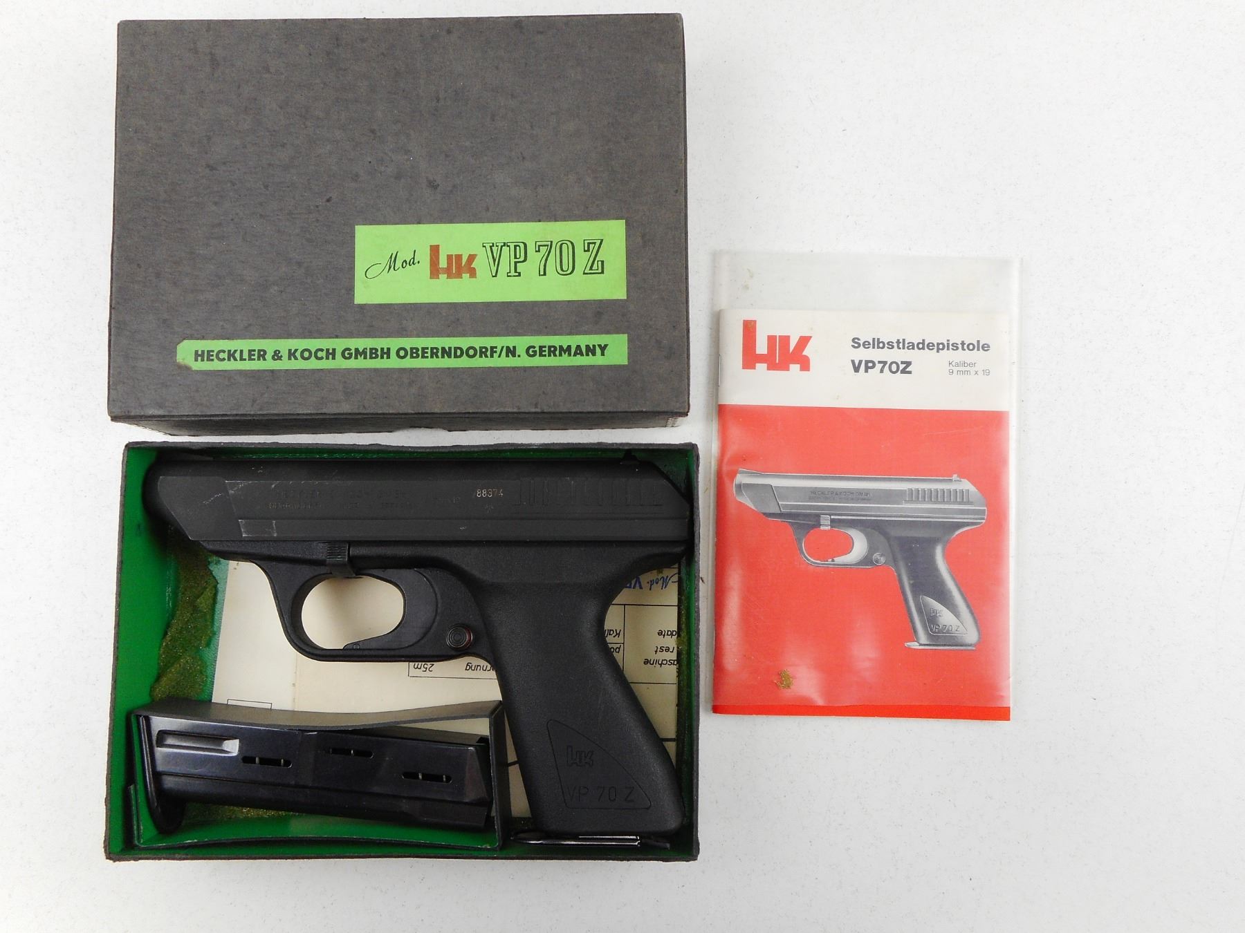 HECKLER & KOCH , MODEL: VP70Z , CALIBER: 9MM LUGER , COMES WITH BOX, 2 MAGAZINES, AND MANUAL, RAMP FRONT AND FIXED REAR SIGHTS, TEXTURED METAL GRIPS, SHOWS VERY LITTLE HANDLING MARKS, BORE IS EXCELLENT , ACTION: SEMI-AUTOMATIC HANDGUN , BARREL LENGTH: 116MM , CONDITION: 8/10 , STOCK # R3030 , SERIAL # 88374 , CLASS: CANADIAN RESTRICTED CLASS