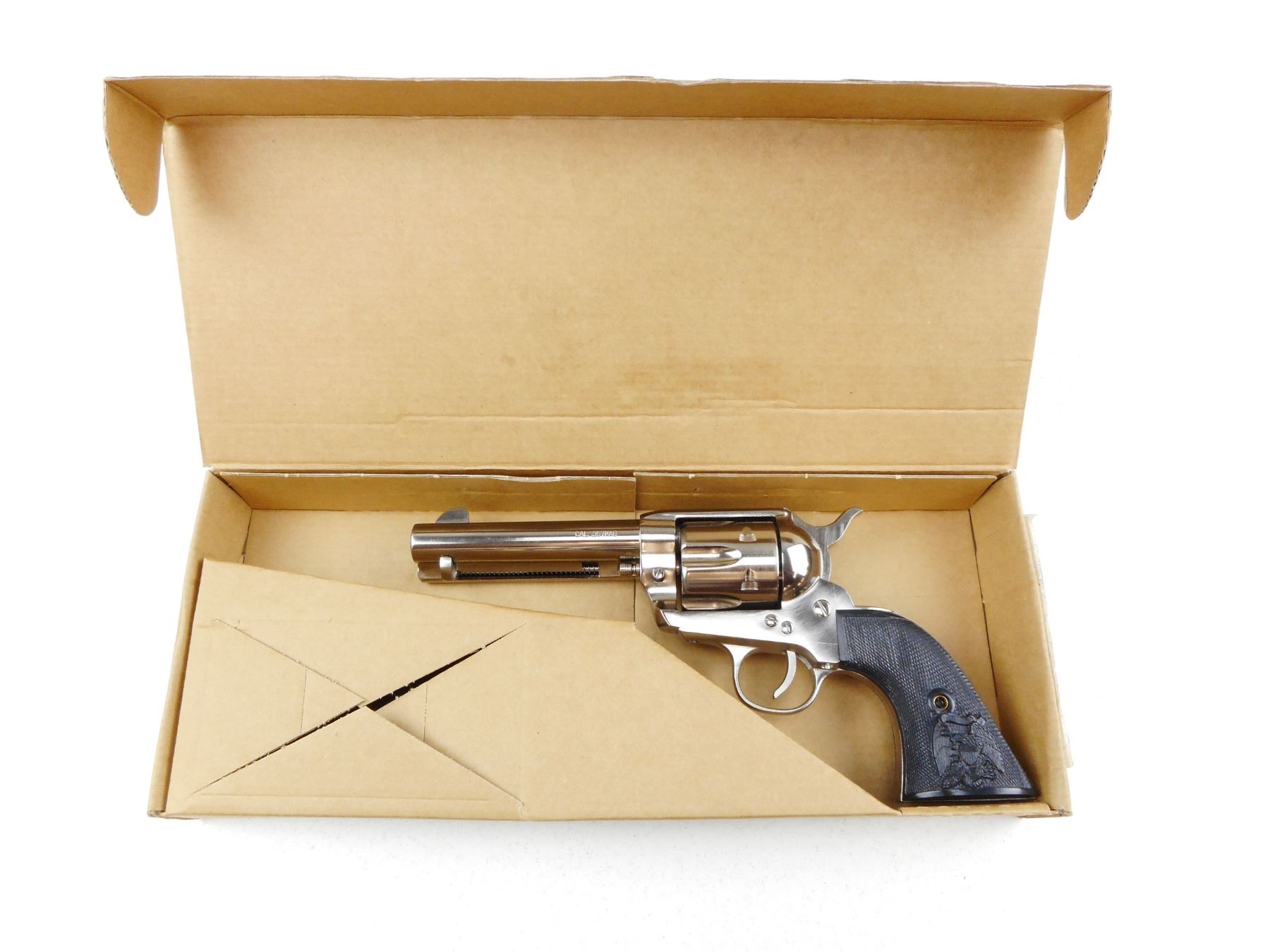 PIETTA , MODEL: COLT 1873 SINGLE ACTION ARMY REPRODUCTION , CALIBER: 357 MAGNUM , COMES WITH BOX, 6 SHOT CAPACITY, BLADE FRONT AND NOTCH REAR SIGHTS, NICKEL FINISH, CHECKERED BLACK PLASTIC GRIPS WITH EAGLE AND SHIELD MOTIF, SHOWS VERY LITTLE HANDLING MARKS, EXCELLENT BORE , ACTION: REVOLVER , BARREL LENGTH: 121MM , CONDITION: 9/10 , STOCK # R3033 , SERIAL # E48258 , CLASS: CANADIAN RESTRICTED CLASS