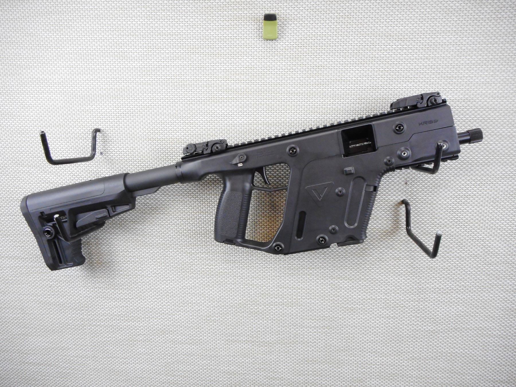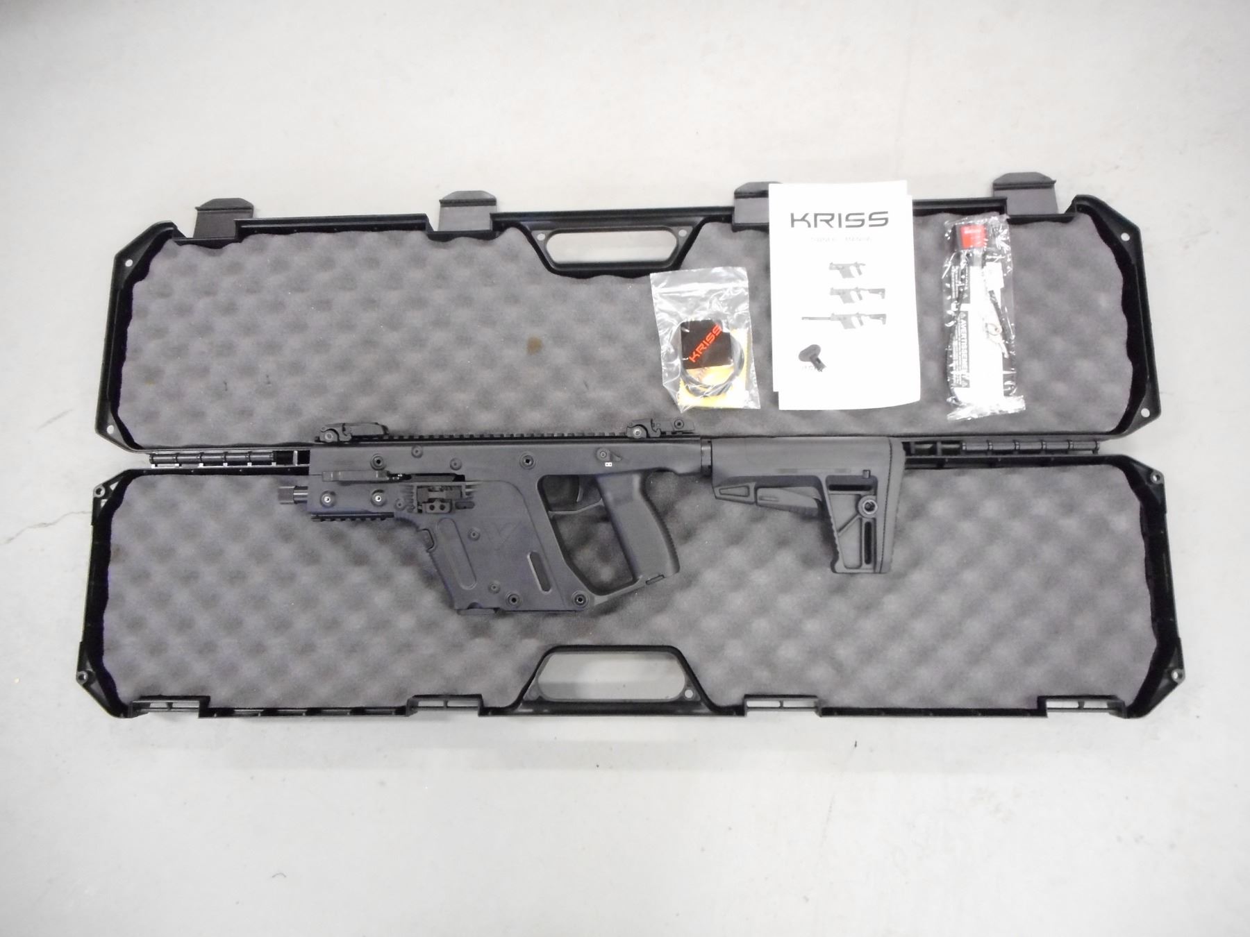 KRISS , MODEL: KRISS VECTOR CRB , CALIBER: 9MM LUGER , COMES WITH CASE, MAGAZINE, MANUAL AND ACCESSORIES, 10 SHOT CAPACITY, EXCELLENT BORE, FOLDING FRONT AND REAR ADJUSTABLE SIGHTS ON FULL LENGTH RAIL, STIPPLED PISTOL GRIP WITH COLLAPSABLE BUTT STOCK, SHOWS VERY LITTLE HANDLING MARKS, BLACK SYNTHETIC FINISH , ACTION: SEMI-AUTOMATIC RIFLE , BARREL LENGTH: 140mm , CONDITION: 9/10 , STOCK # R3058 , SERIAL # 919R001427 , CLASS: CANADIAN RESTRICTED CLASS