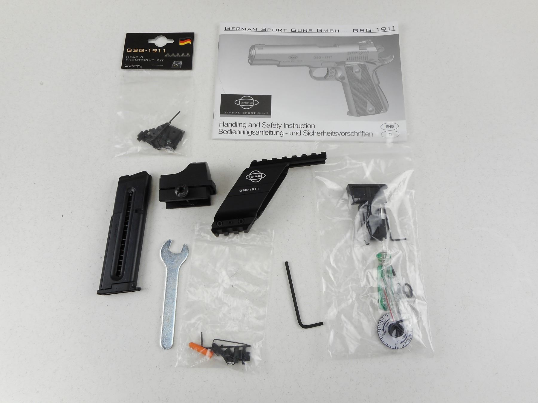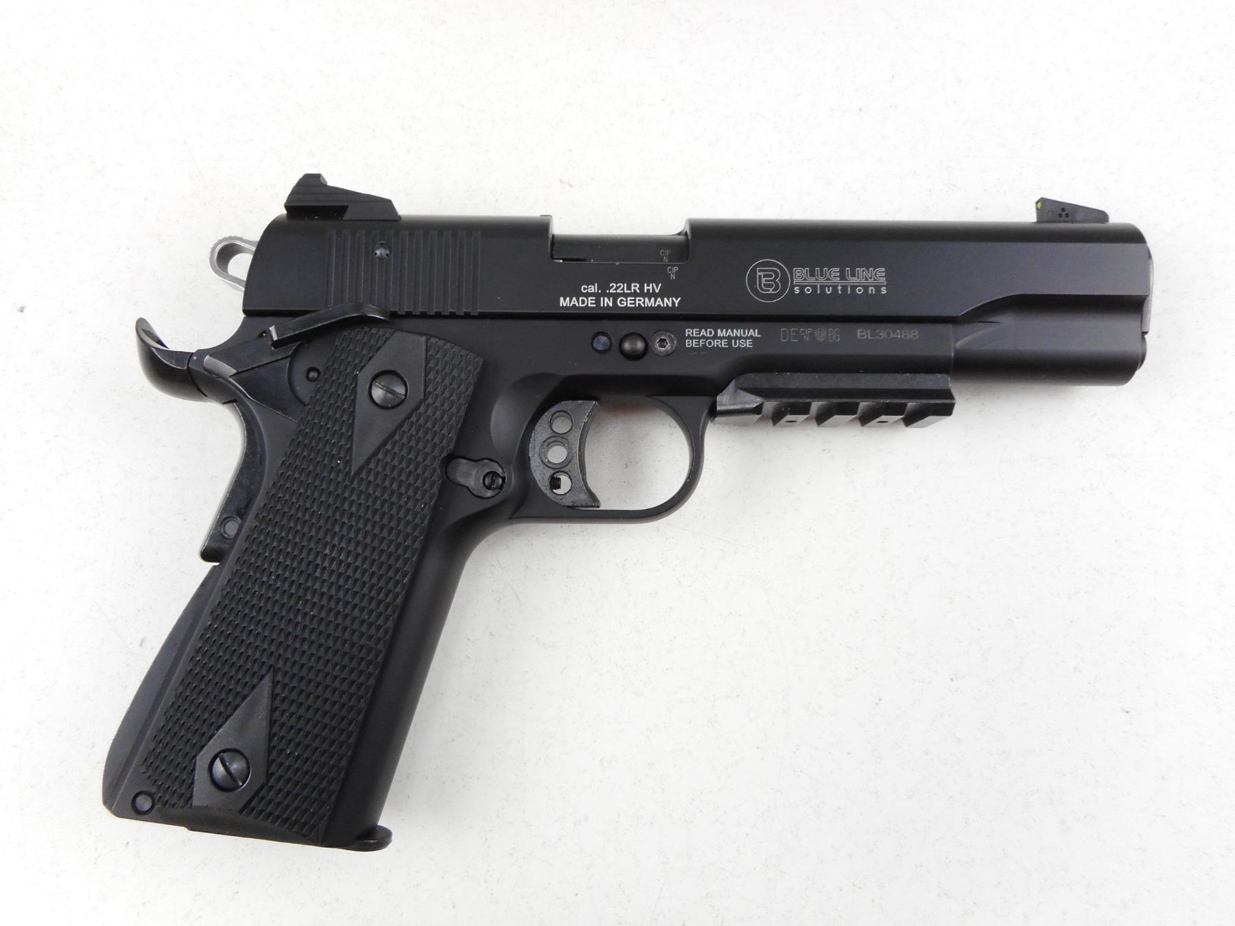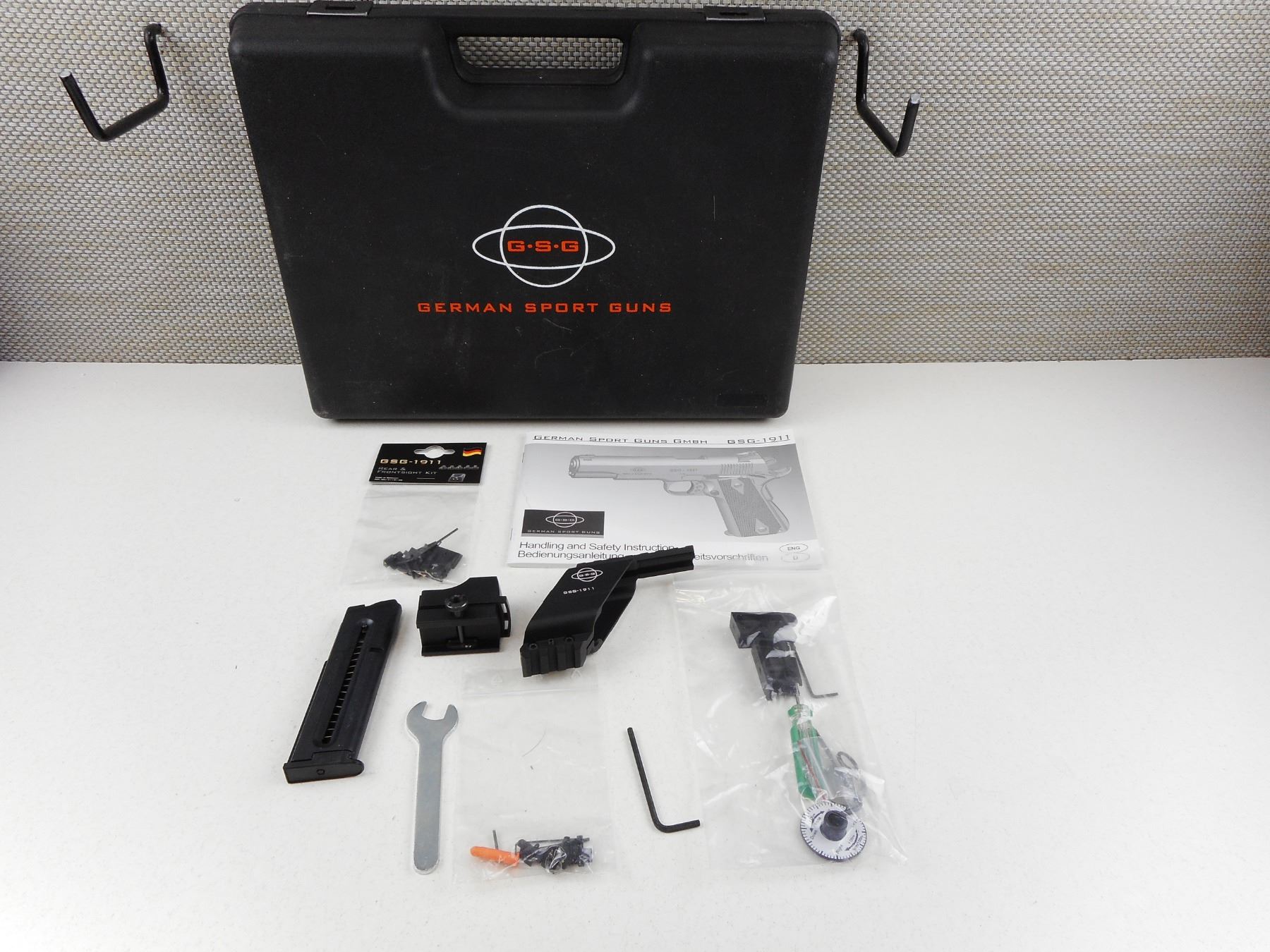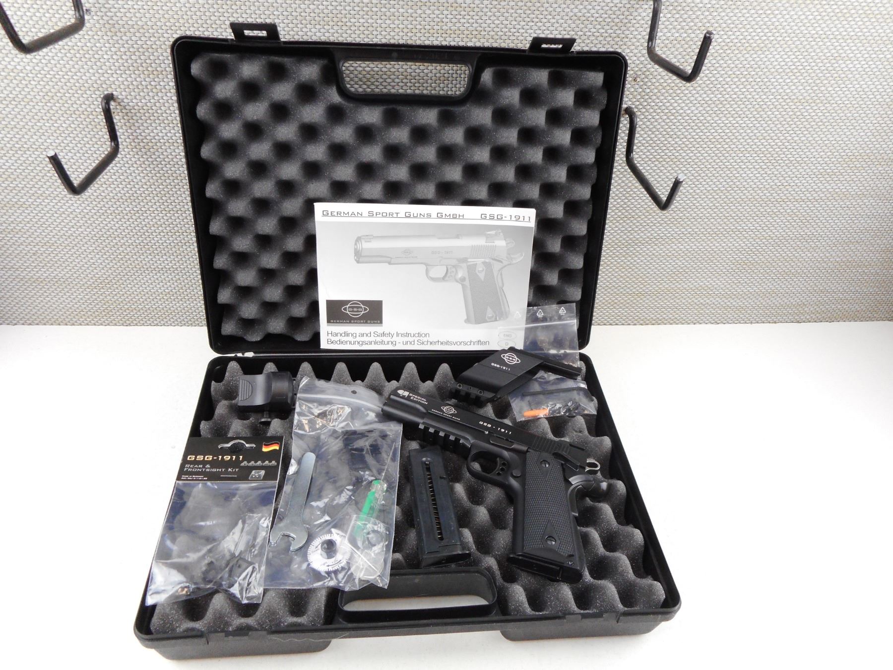 GERMAN SPORTS GUN , MODEL: GSG - 1911 , CALIBER: 22 LR , COMES WITH CASE, 2 MAGAZINES, MANUAL AND ACCESSORIES, 10 SHOT CAPACITY, EXCELLENT BORE, BLADE FRONT AND ADJUSTABLE REAR SIGHT, CHECKERED PLASTIC GRIP PANELS, SKELETONIZED HAMMER AND TRIGGER, SHOWS VERY LITTLE HANDLING MARKS , ACTION: SEMI-AUTOMATIC HANDGUN , BARREL LENGTH: 127MM , CONDITION: 8/10 , STOCK # R3062 , SERIAL # BL30488 , CLASS: CANADIAN RESTRICTED CLASS