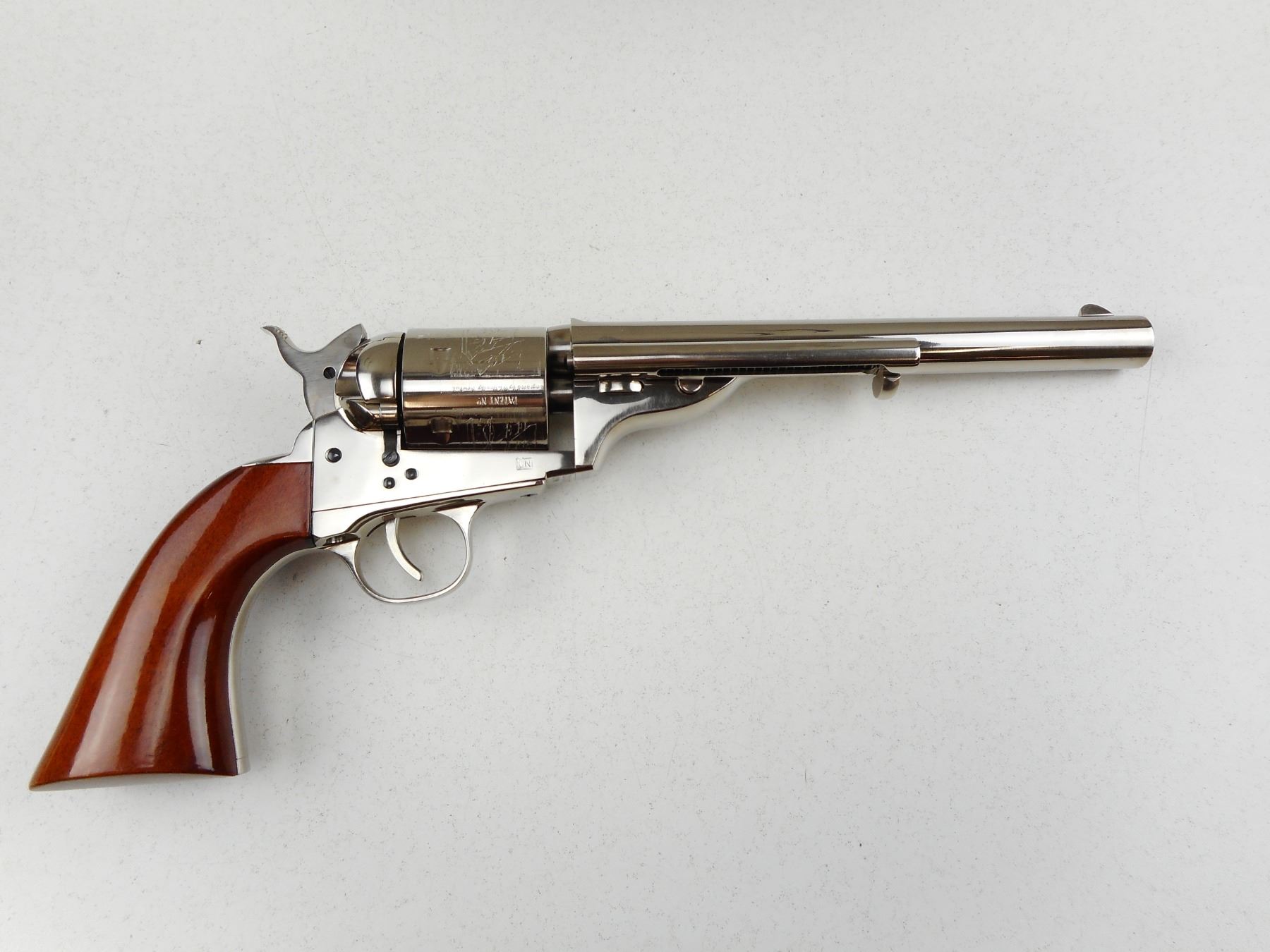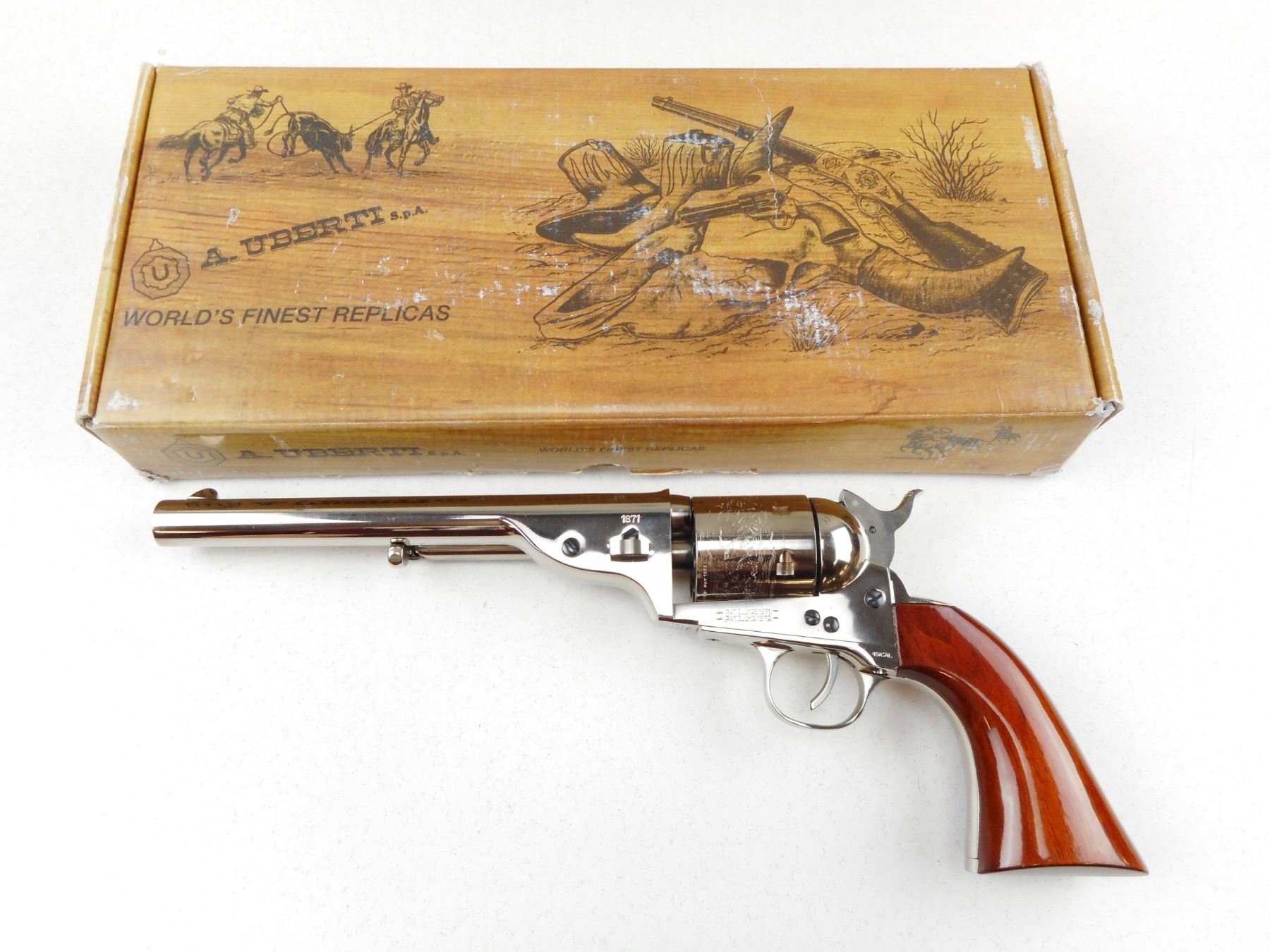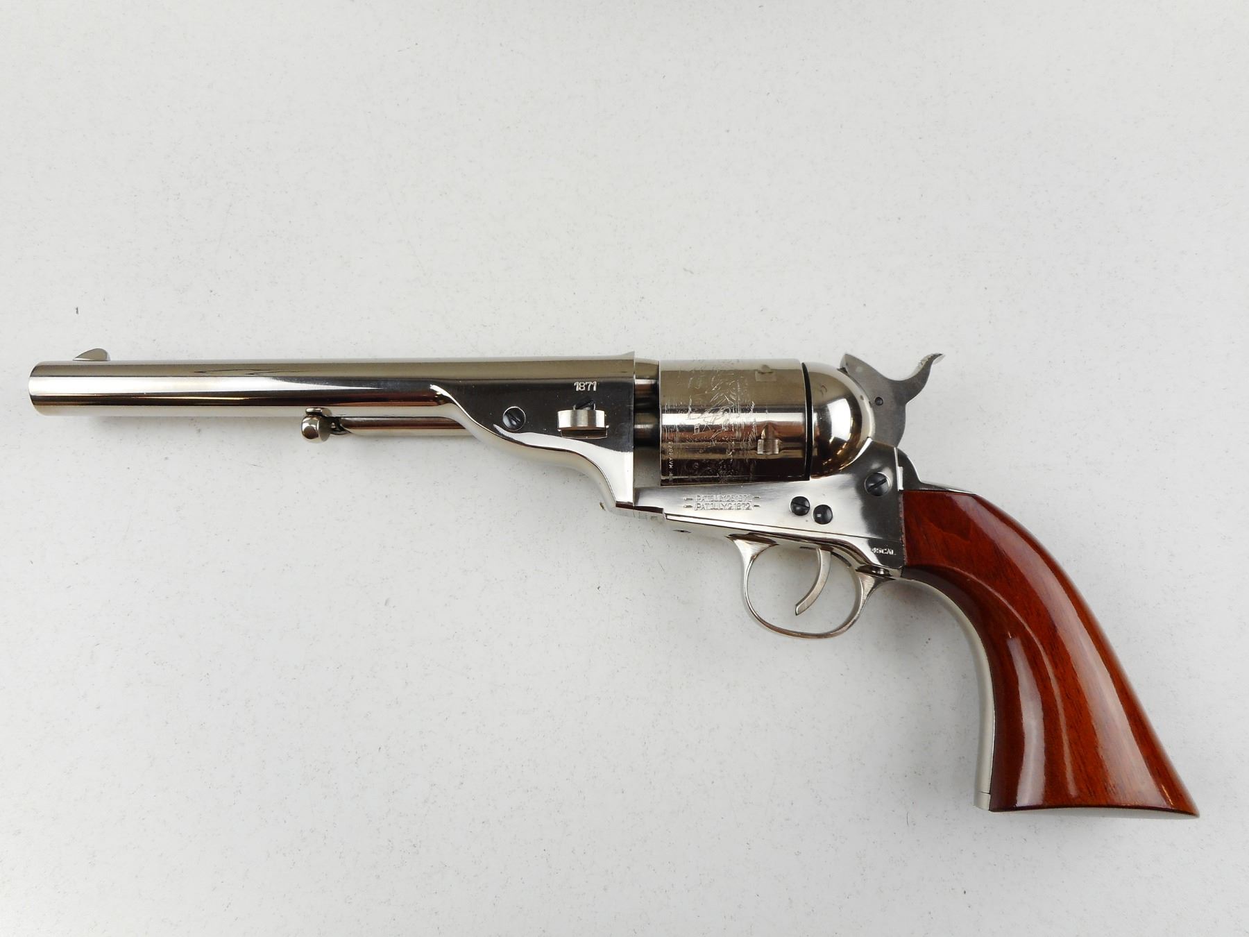 UBERTI , MODEL: COLT 1871/72 OPEN TOP FRONTIER REPRODUCTION , CALIBER: 45 COLT , 6 SHOT CAPACITY, BLADE FRONT AND NOTCH REAR SIGHT, NICKEL FINISH WITH PLAIN HARDWOOD GRIPS, SHOWS VERY LITTLE HANDLING MARKS, DATED 1871 ON THE BARREL, BORE IS EXCELLENT , ACTION: REVOLVER , BARREL LENGTH: 191MM , CONDITION: 9/10 , STOCK # R3064 , SERIAL # X35277 , CLASS: CANADIAN RESTRICTED CLASS