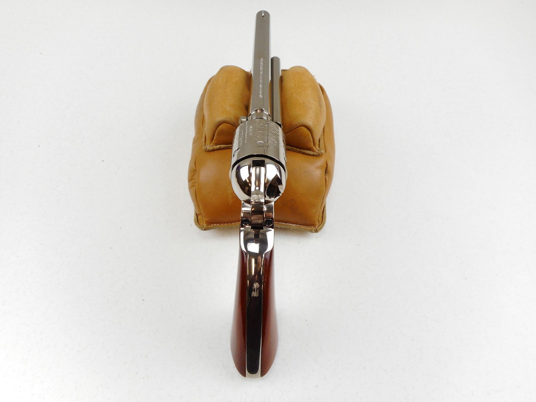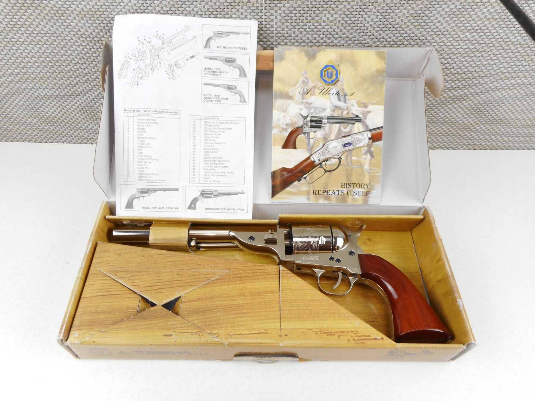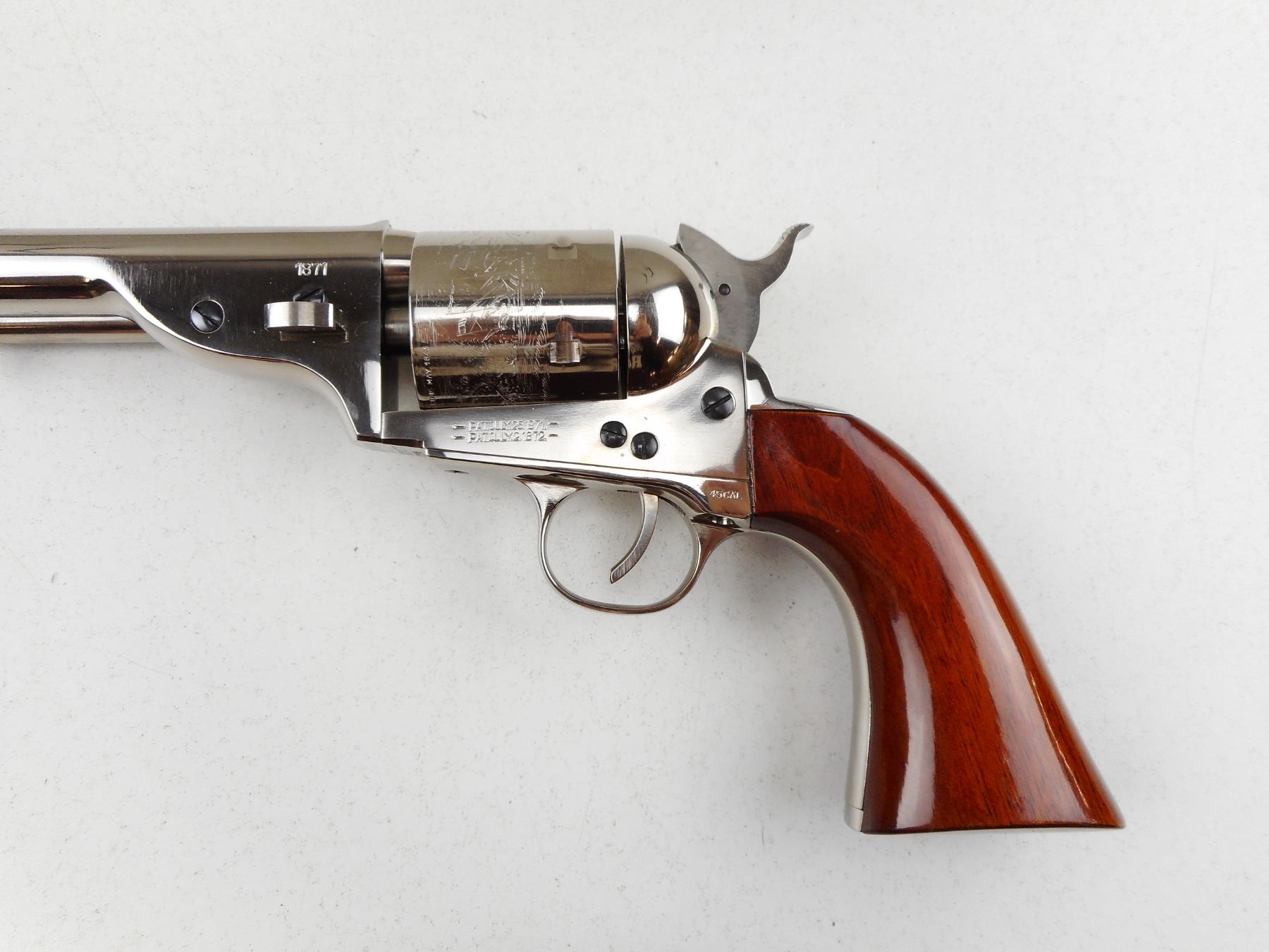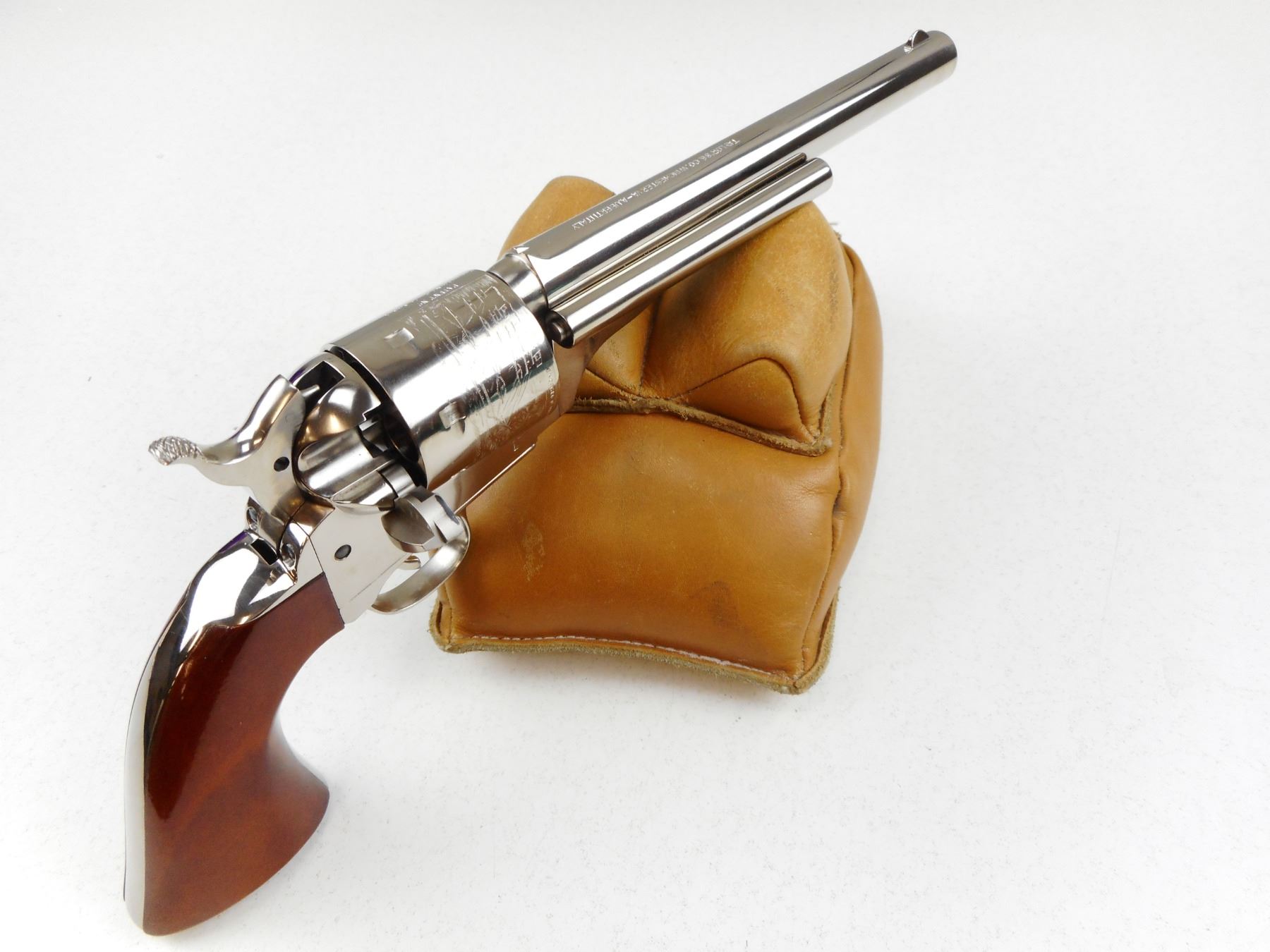UBERTI , MODEL: COLT 1871/72 OPEN TOP FRONTIER REPRODUCTION , CALIBER: 45 COLT , 6 SHOT CAPACITY, BLADE FRONT AND NOTCH REAR SIGHT, NICKEL FINISH WITH PLAIN HARDWOOD GRIPS, SHOWS VERY LITTLE HANDLING MARKS, DATED 1871 ON THE BARREL, BORE IS EXCELLENT , ACTION: REVOLVER , BARREL LENGTH: 191MM , CONDITION: 9/10 , STOCK # R3064 , SERIAL # X35277 , CLASS: CANADIAN RESTRICTED CLASS