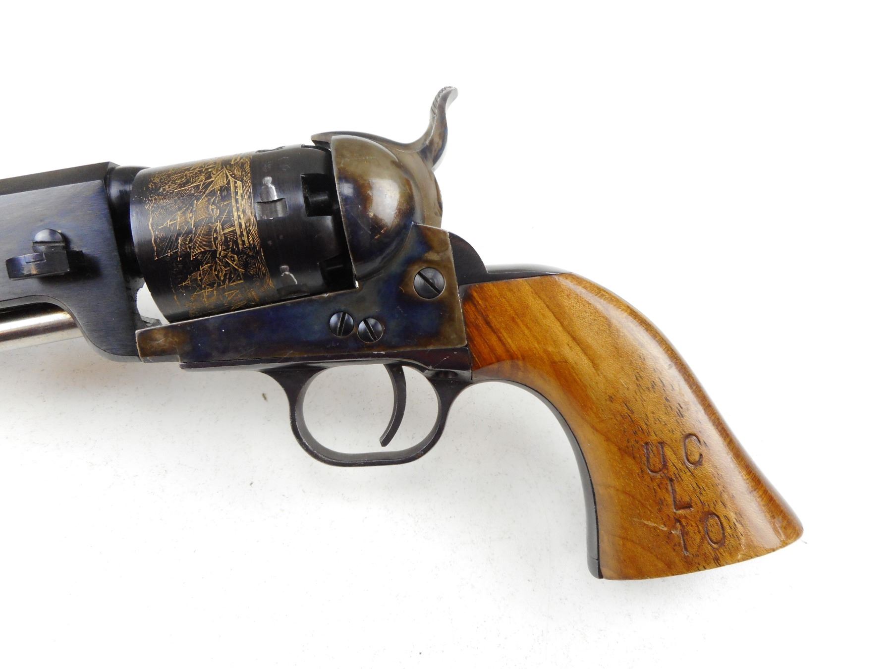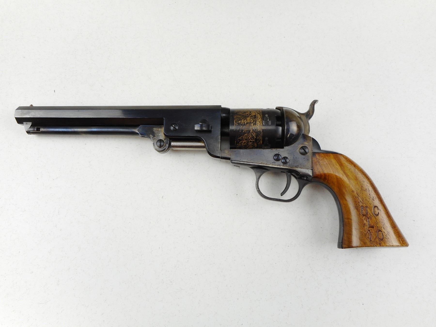 ALLEN FIREARMS , MODEL: COLT 1851 NAVY REPRODUCTION , CALIBER: 36 PERCUSSION , MADE BY UBERTI, 6 SHOT CAPACITY, EXCELLENT BORE, BRASS BEAD FRONT AND NOTCH HAMMER REAR SIGHT, PLAIN WOOD GRIP PANELS, SHOWS VERY LITTLE HANDLING MARKS , ACTION: REVOLVER , BARREL LENGTH: 190MM , CONDITION: 8/10 , STOCK # R3073 , SERIAL # 69162 , CLASS: CANADIAN RESTRICTED CLASS