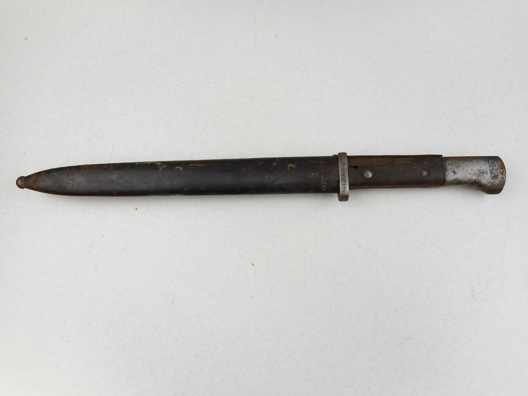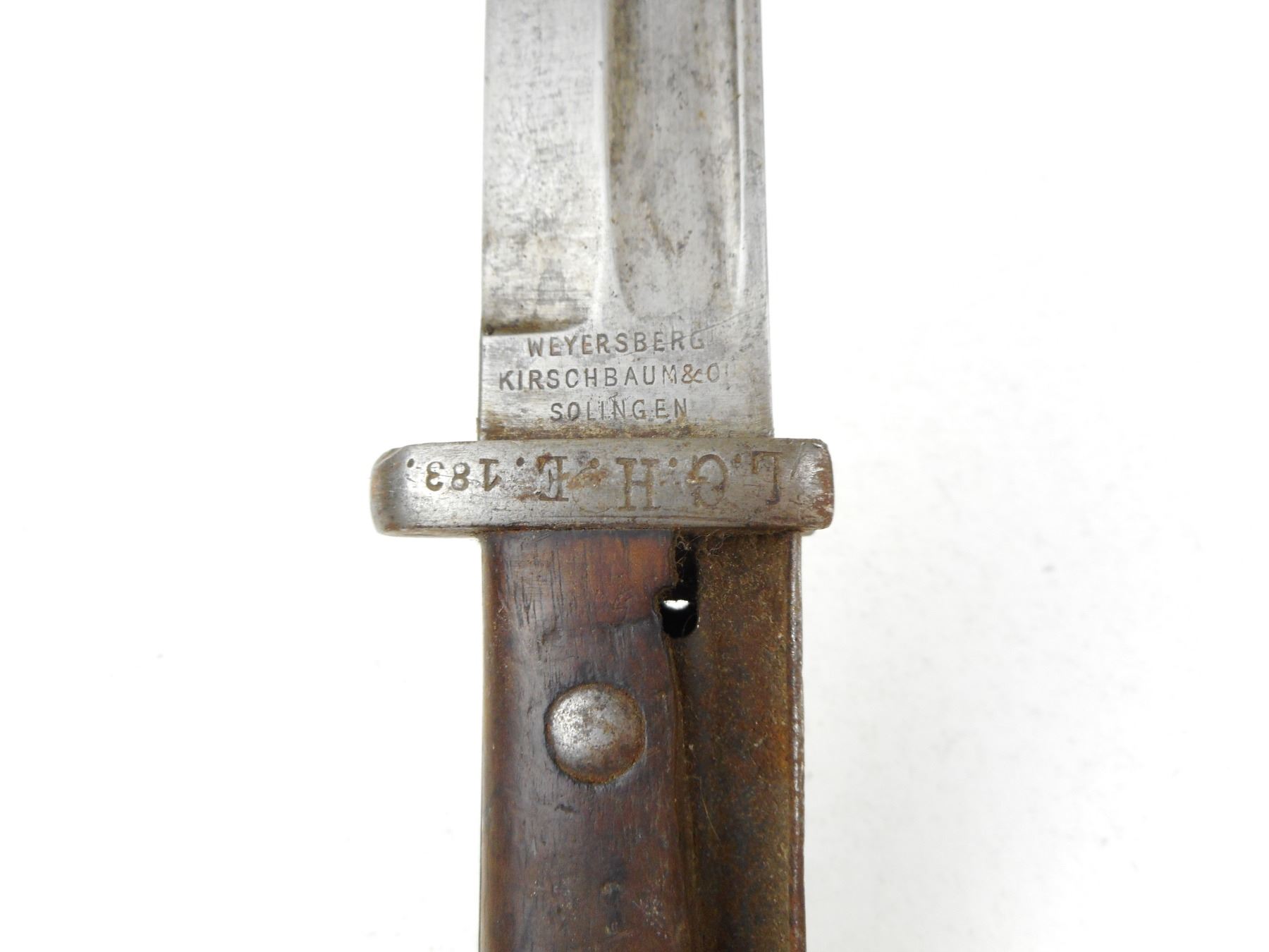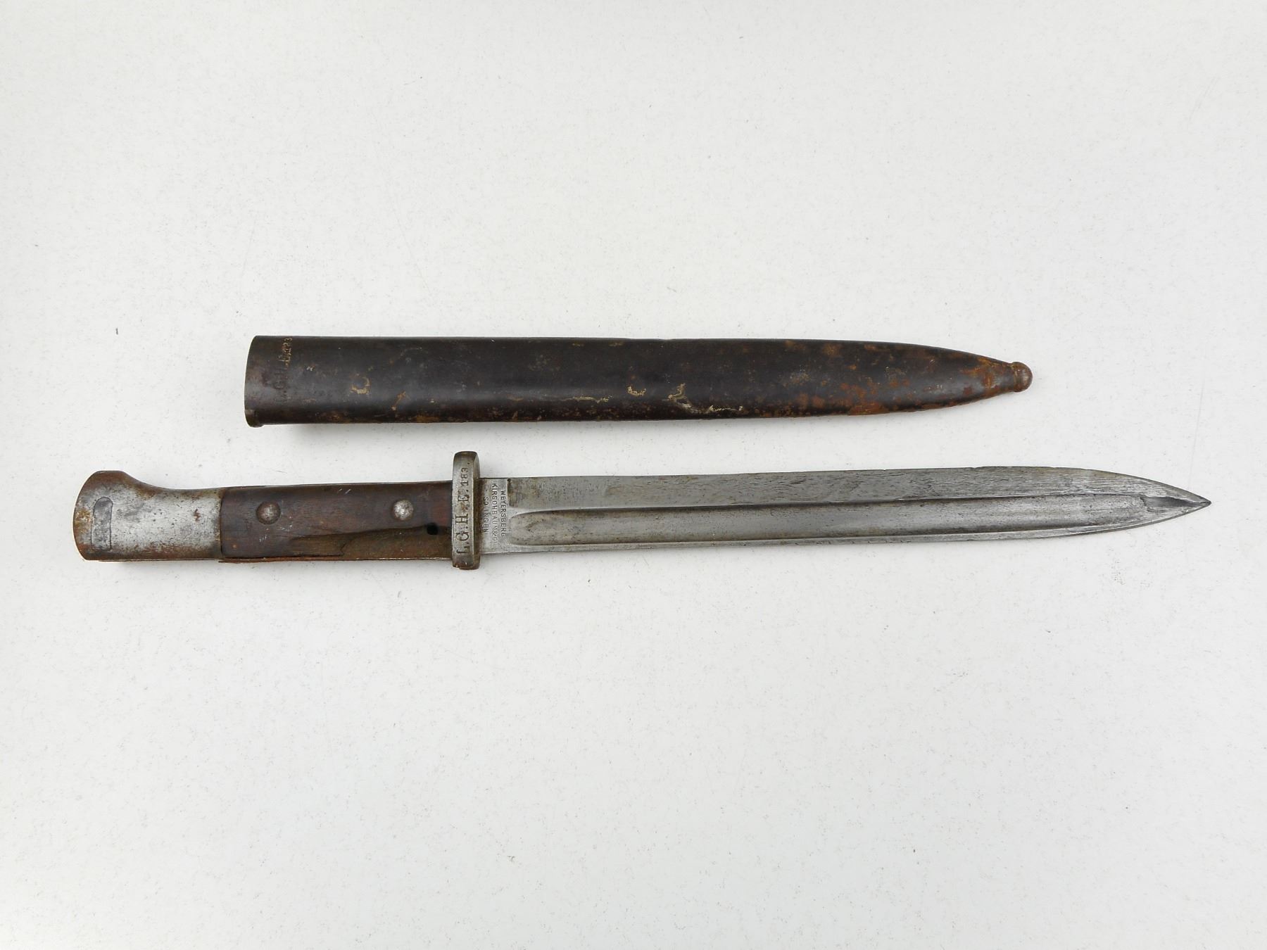 GERMAN BAYONET WITH SCABBARD , RICASSO MARKED WEYERSBERG KIRSCHBAUM & CO SOLINGEN, CROSSGUARD & SCABBARD MARKED L.G.H. E.183