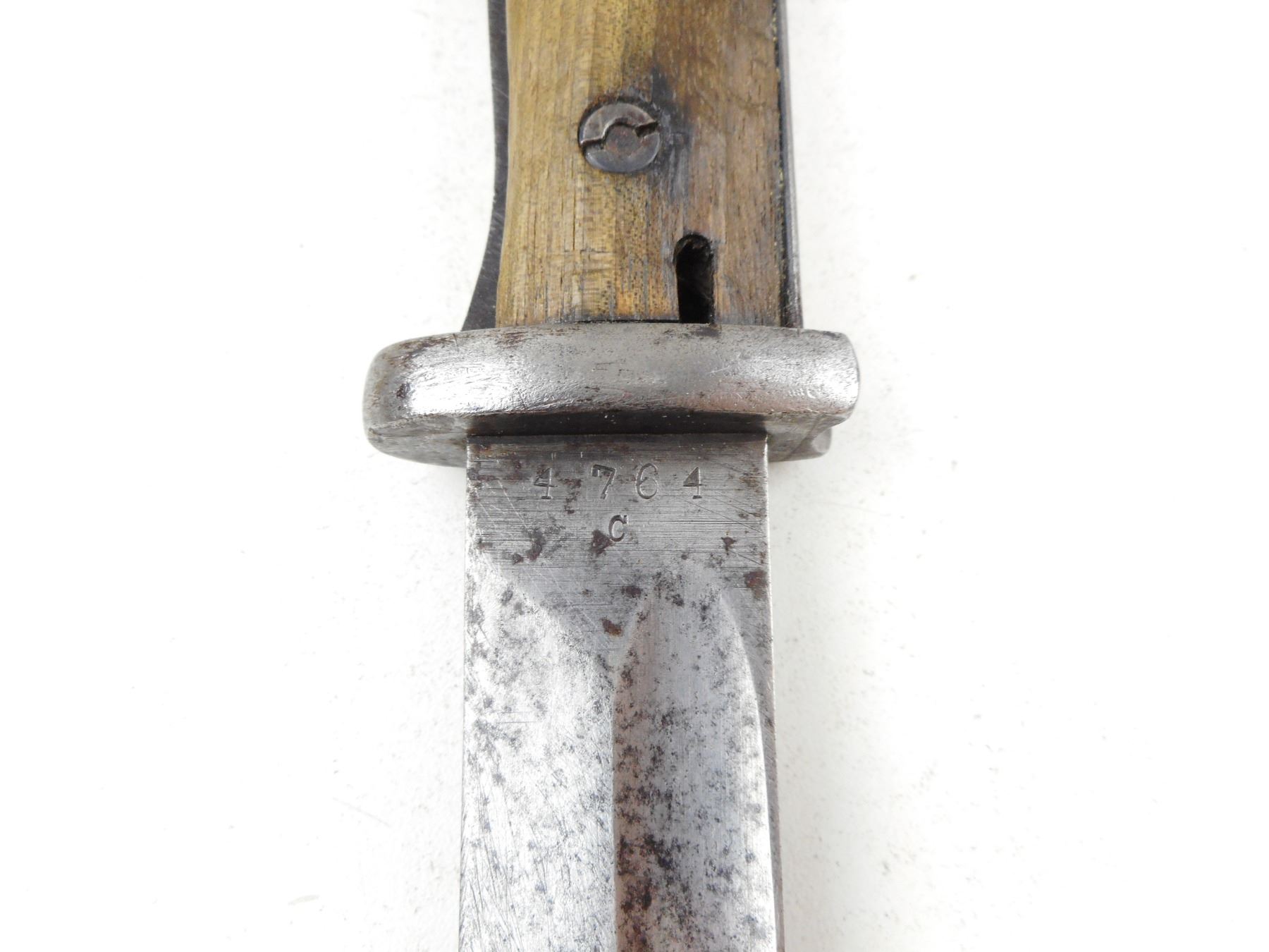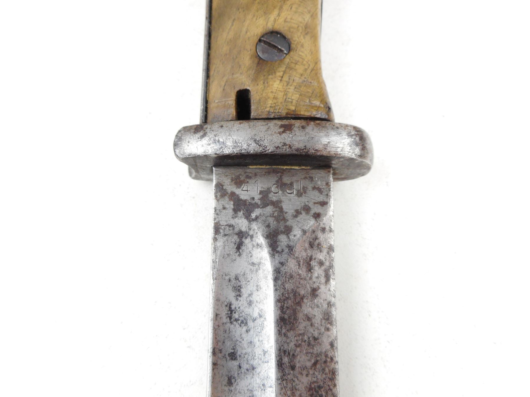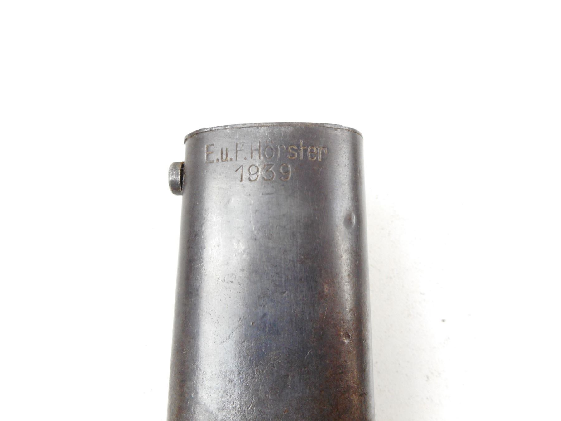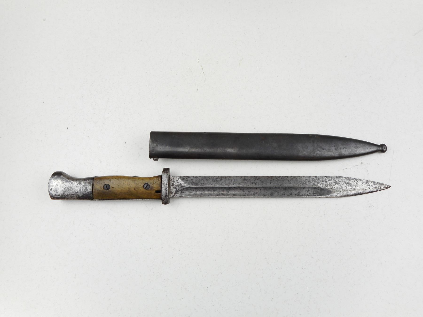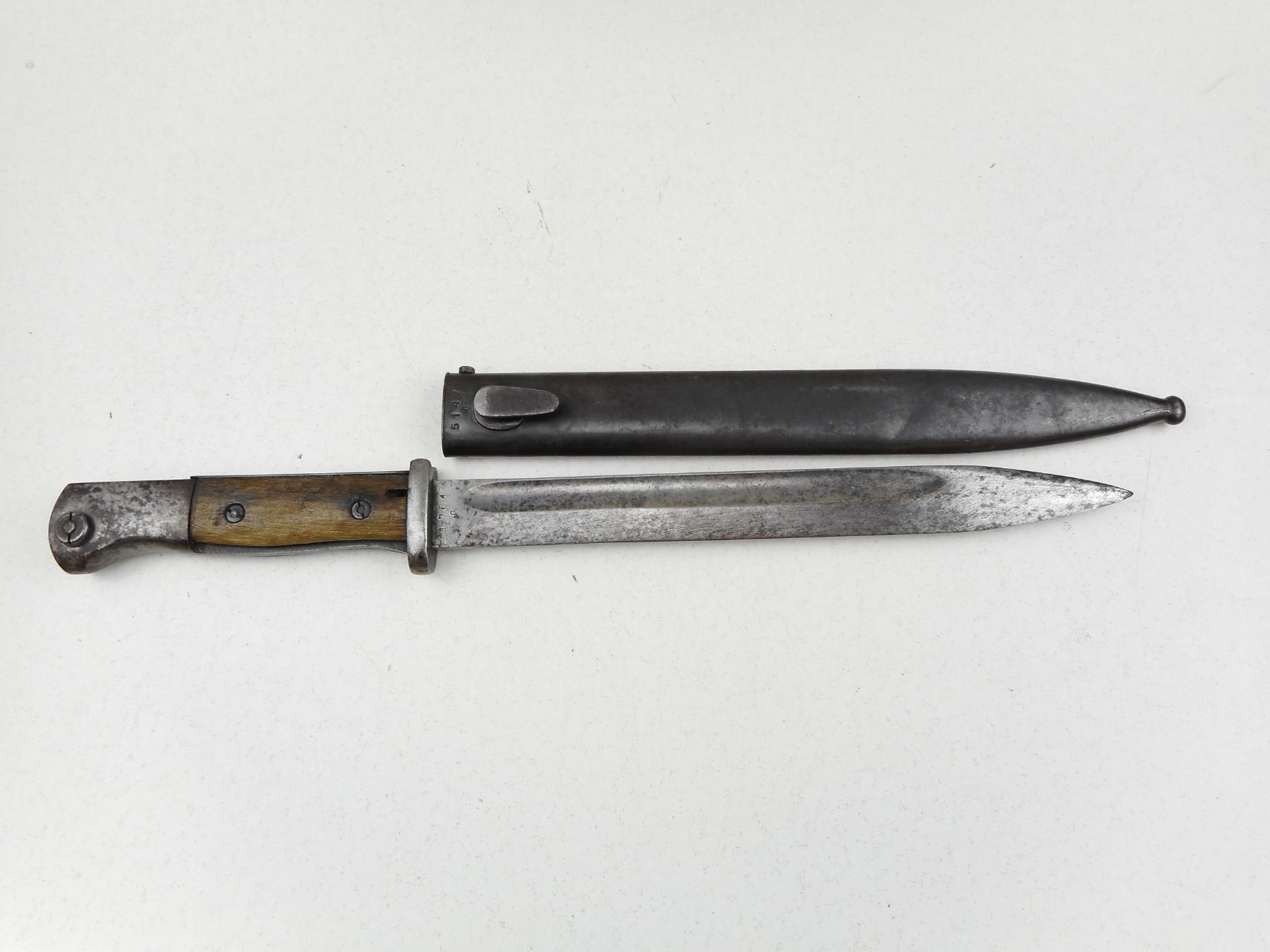 GERMAN WWII K98 MAUSER BAYONET WITH SCABBARD , RICASSO MARKED 4764 C, & 41 DDL, POMMEL IS WAFFEN MARKED, METAL SCABBARD MARKED 5147 & E.U.F.HORSTER 1939, DRAIN HOLE WAFFEN MARKED
