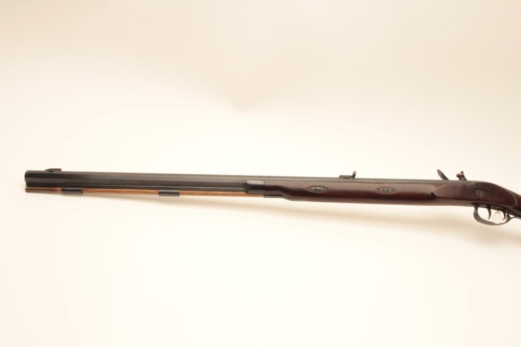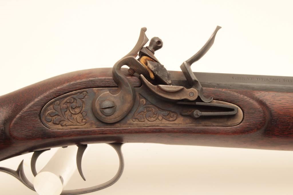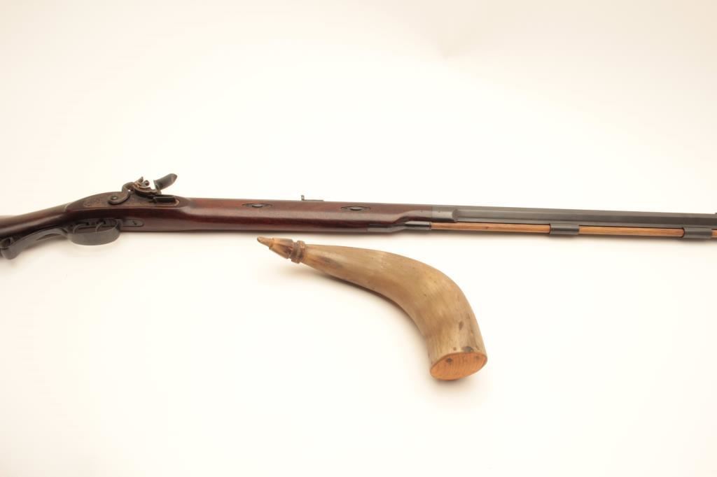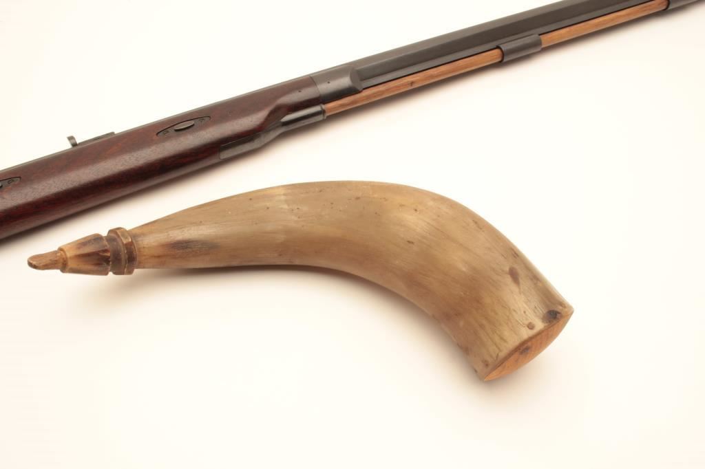 Lyman flintlock half stock “Great Plains Rifle”, .54 caliber black powder, 33” octagon barrel, blued and case hardened finish, double set triggers (working at time of description), wood stock and wood ramrod, S/N321403; overall very good to near fine condition with majority of original finish remaining, crisp action, sharp markings and very good to near fine wood stock; accompanied with approximate 12” powder horn. (Flintlock). Est.: $200-$400.