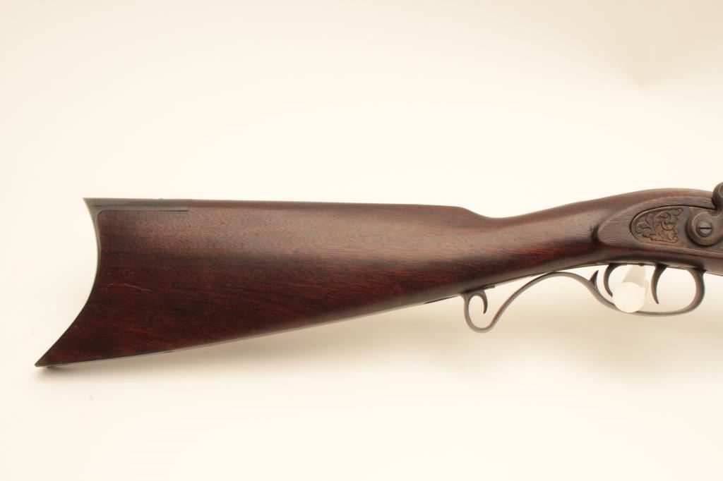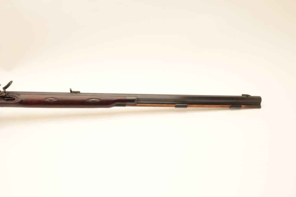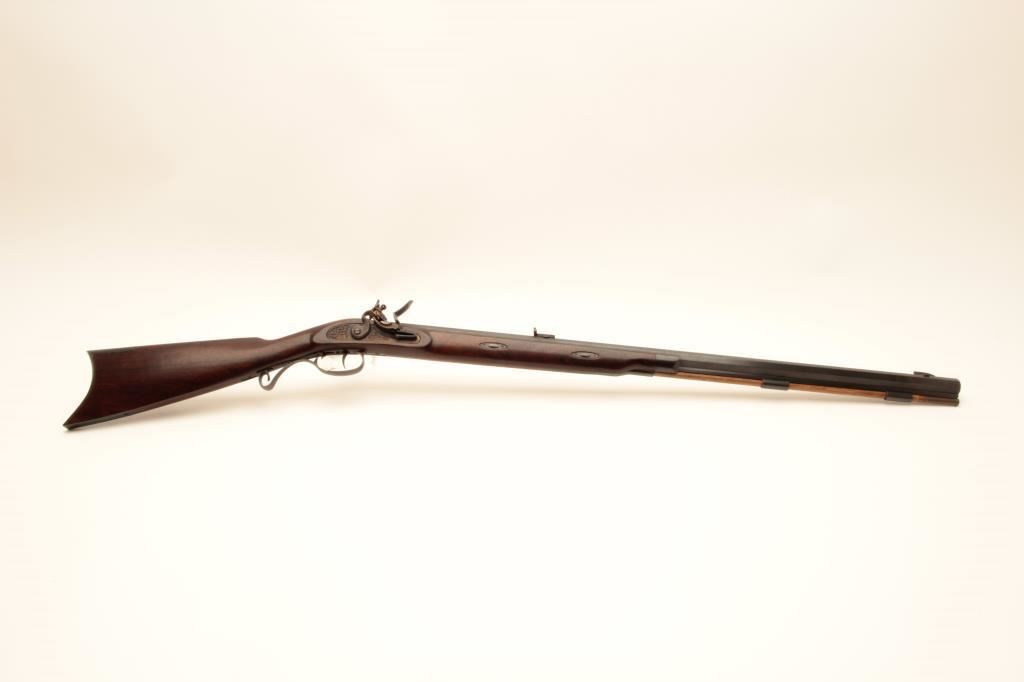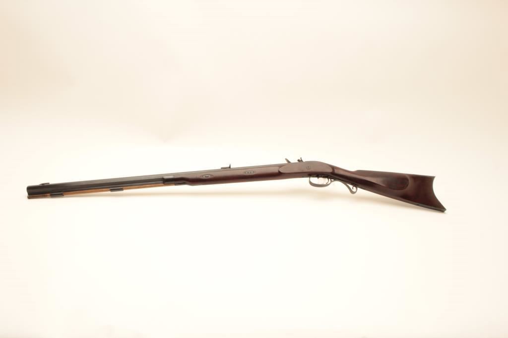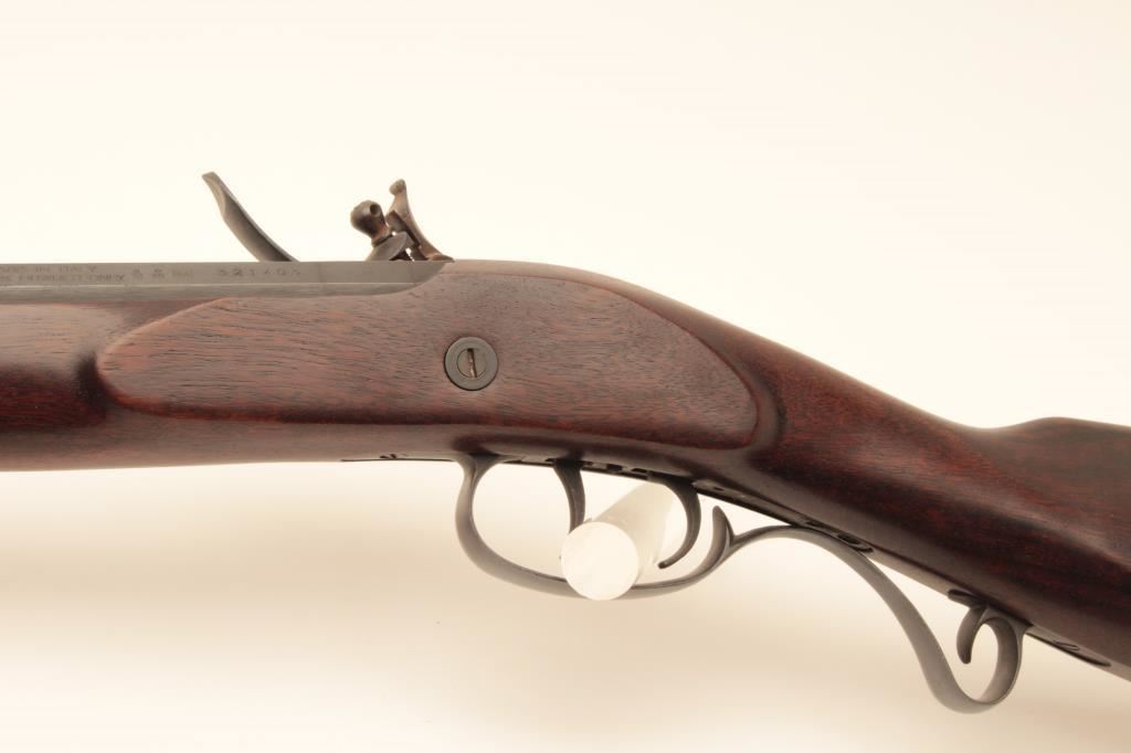 Lyman flintlock half stock “Great Plains Rifle”, .54 caliber black powder, 33” octagon barrel, blued and case hardened finish, double set triggers (working at time of description), wood stock and wood ramrod, S/N321403; overall very good to near fine condition with majority of original finish remaining, crisp action, sharp markings and very good to near fine wood stock; accompanied with approximate 12” powder horn. (Flintlock). Est.: $200-$400.