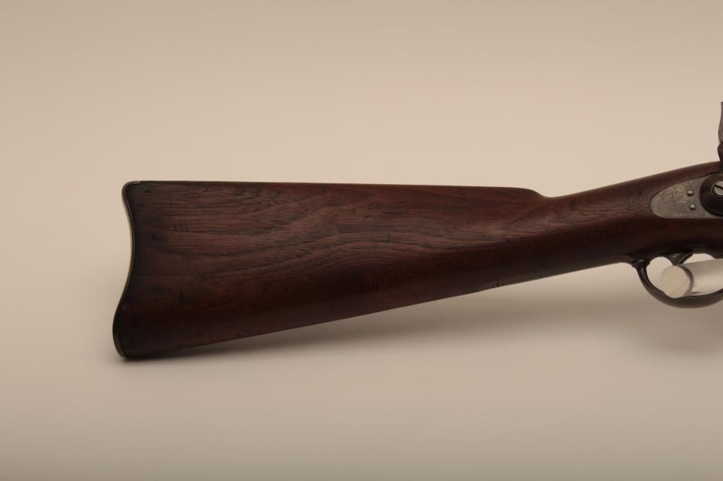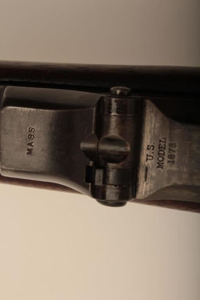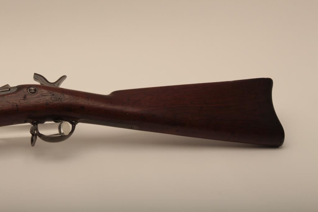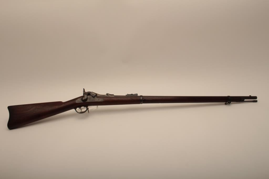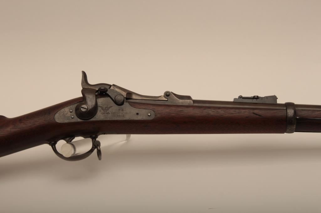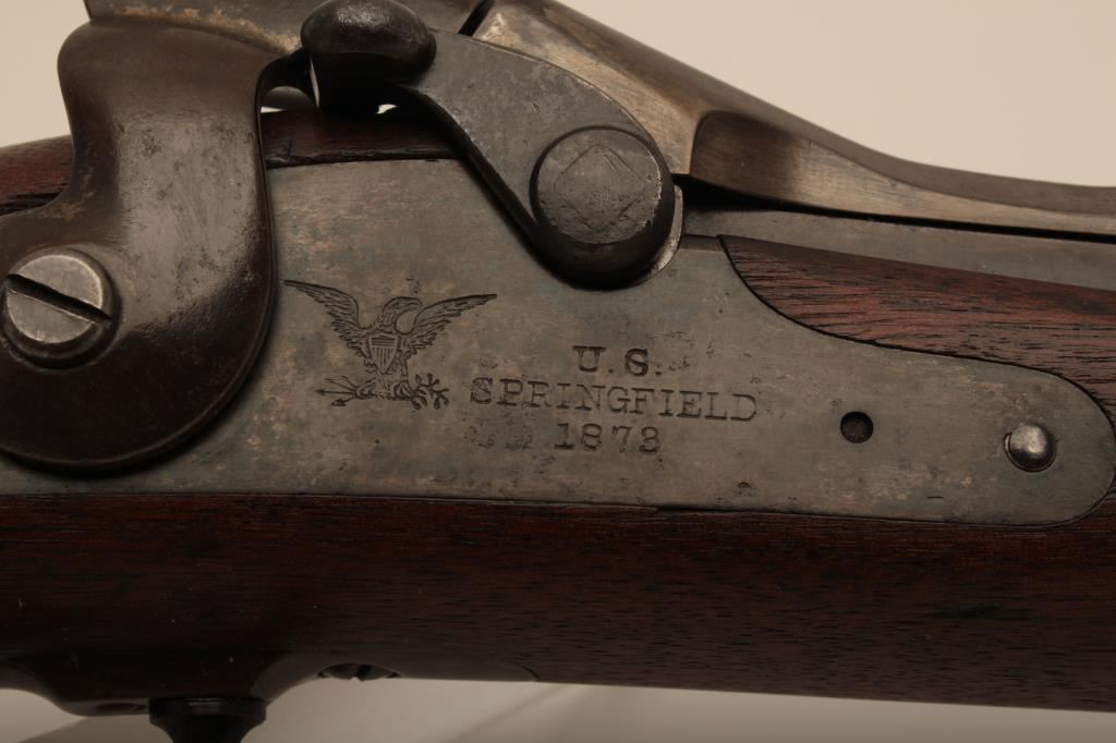U.S. Springfield Trapdoor rifle, .45-70 caliber, 32.5” barrel, blued and case hardened finish, wood stock, sling swivels, iron cleaning rod, S/N 7469; overall very good + condition with a very good + bore, crisp action, sharp markings, brown patina to barrel, silver toning to trapdoor; “MASS” stamped on front base of trapdoor hinge (Massachusetts); very good wood with partial circle P proof and visible inspector’s cartouche “SWP/1876”. (Antique). Est.: $500-$1,000.