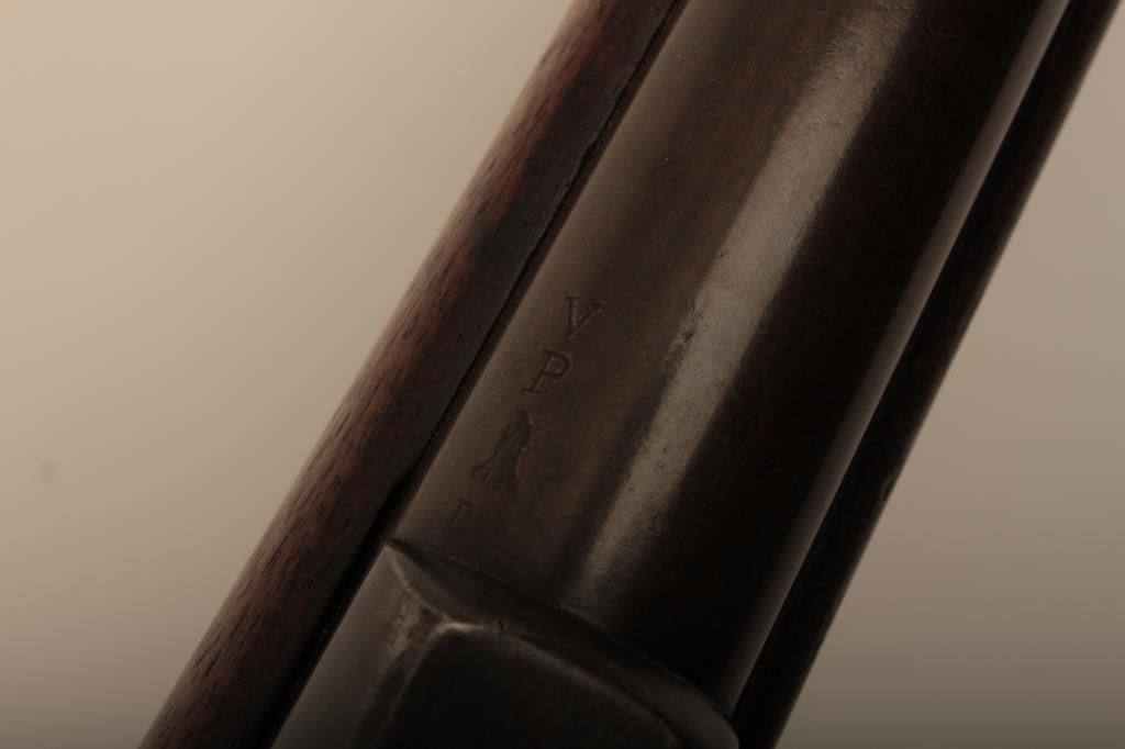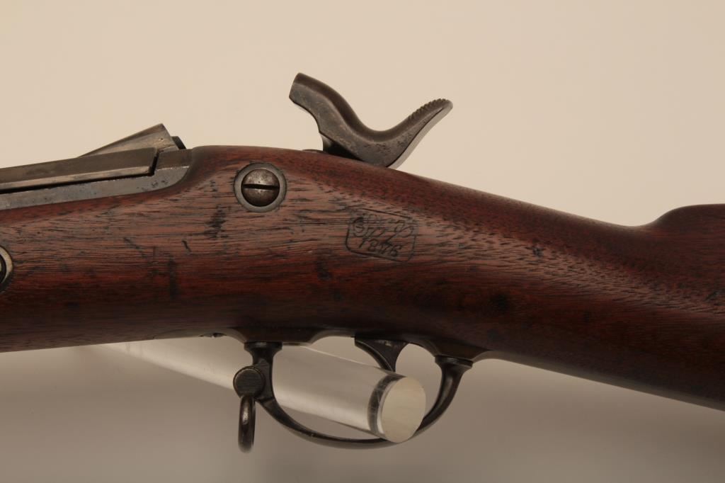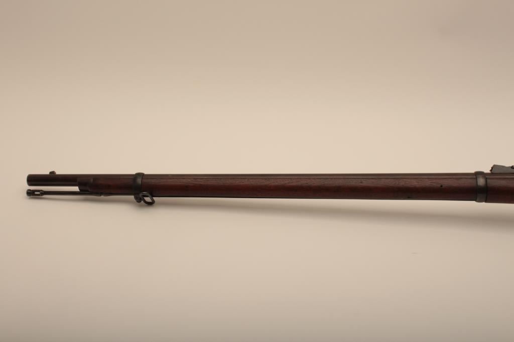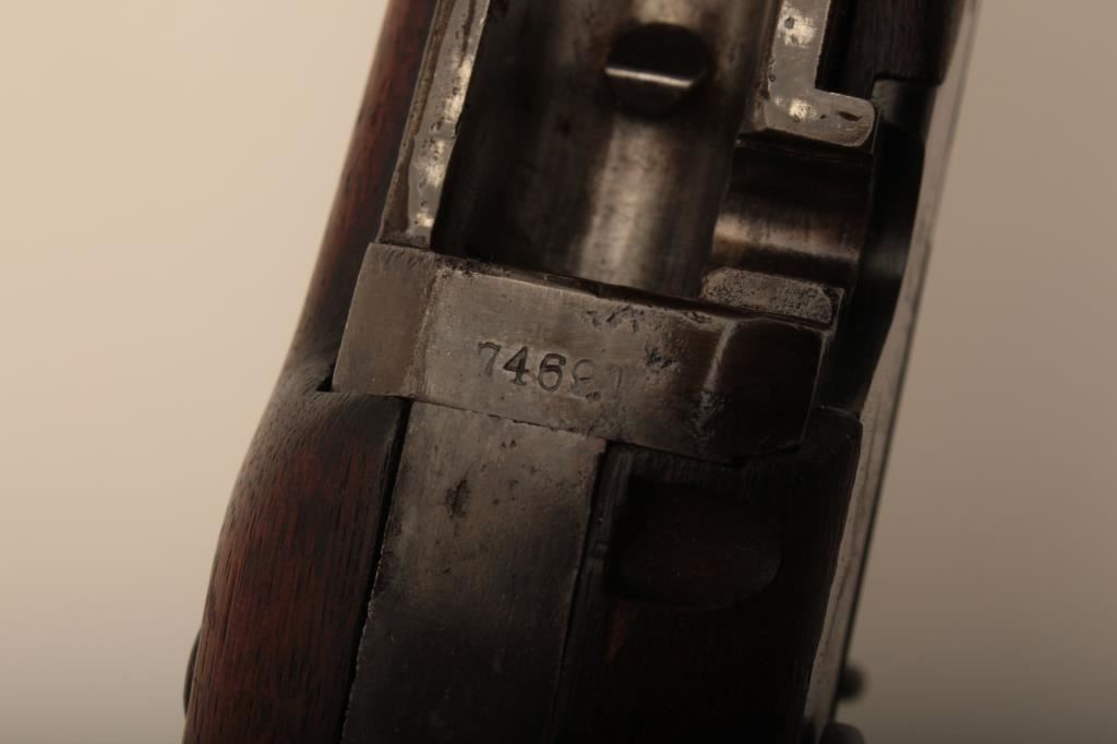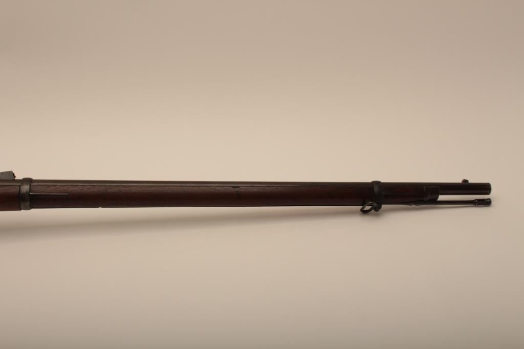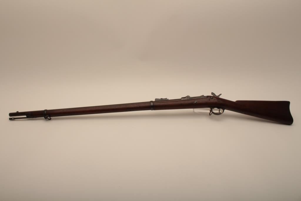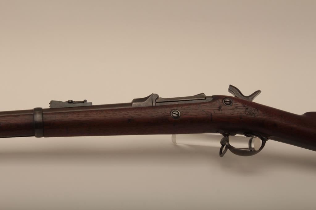 U.S. Springfield Trapdoor rifle, .45-70 caliber, 32.5” barrel, blued and case hardened finish, wood stock, sling swivels, iron cleaning rod, S/N 7469; overall very good + condition with a very good + bore, crisp action, sharp markings, brown patina to barrel, silver toning to trapdoor; “MASS” stamped on front base of trapdoor hinge (Massachusetts); very good wood with partial circle P proof and visible inspector’s cartouche “SWP/1876”. (Antique). Est.: $500-$1,000.