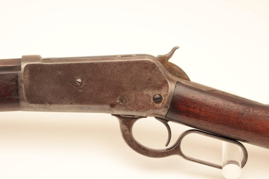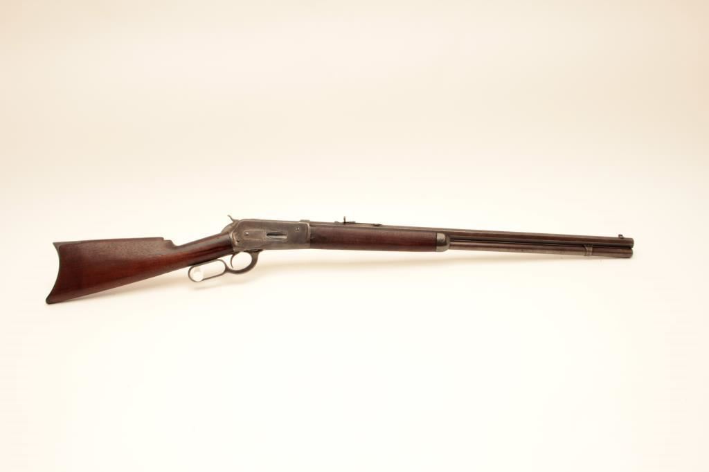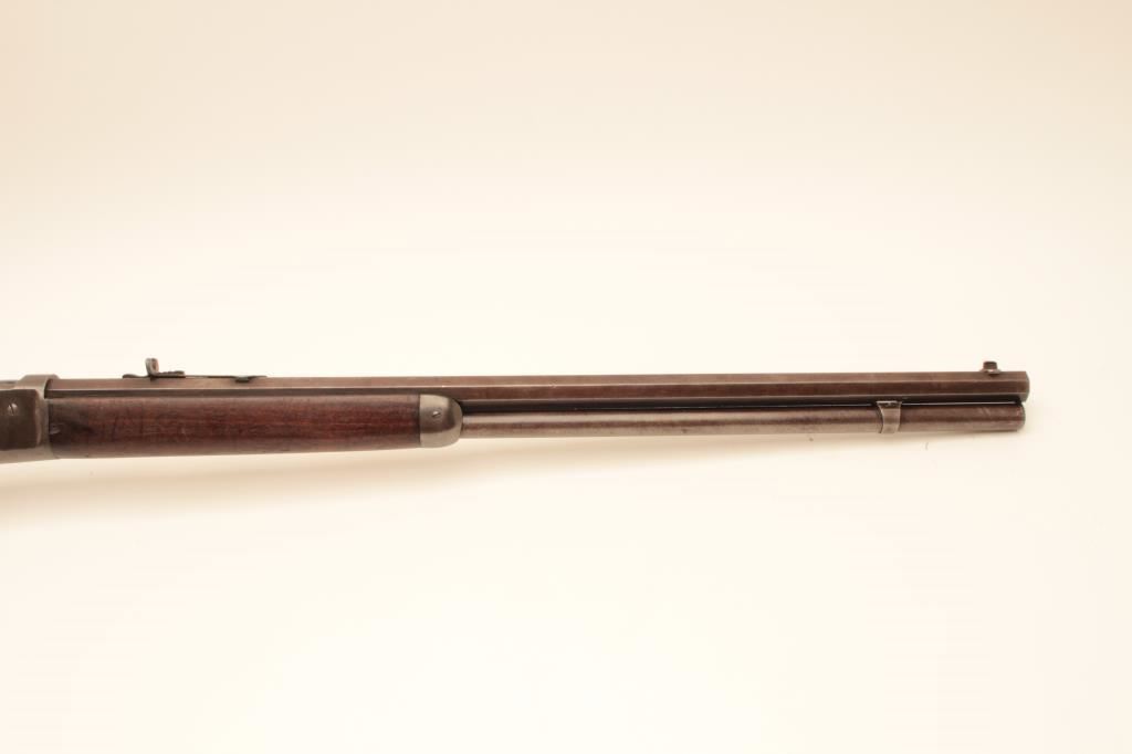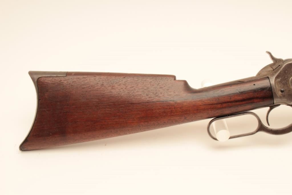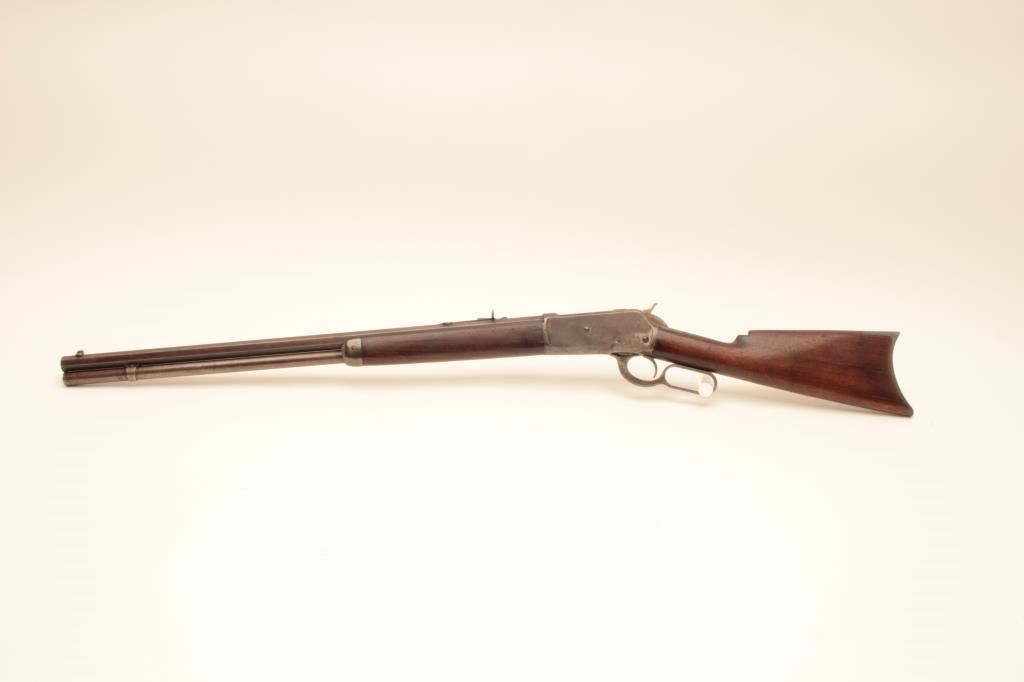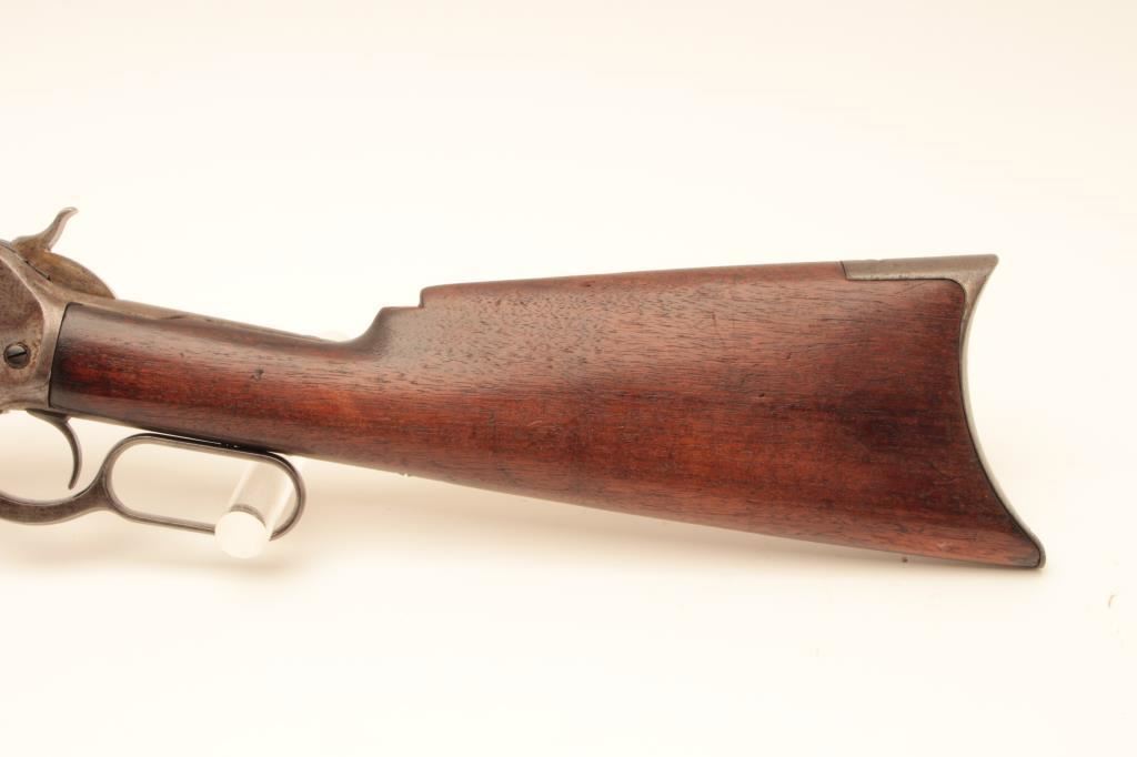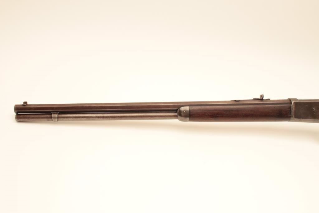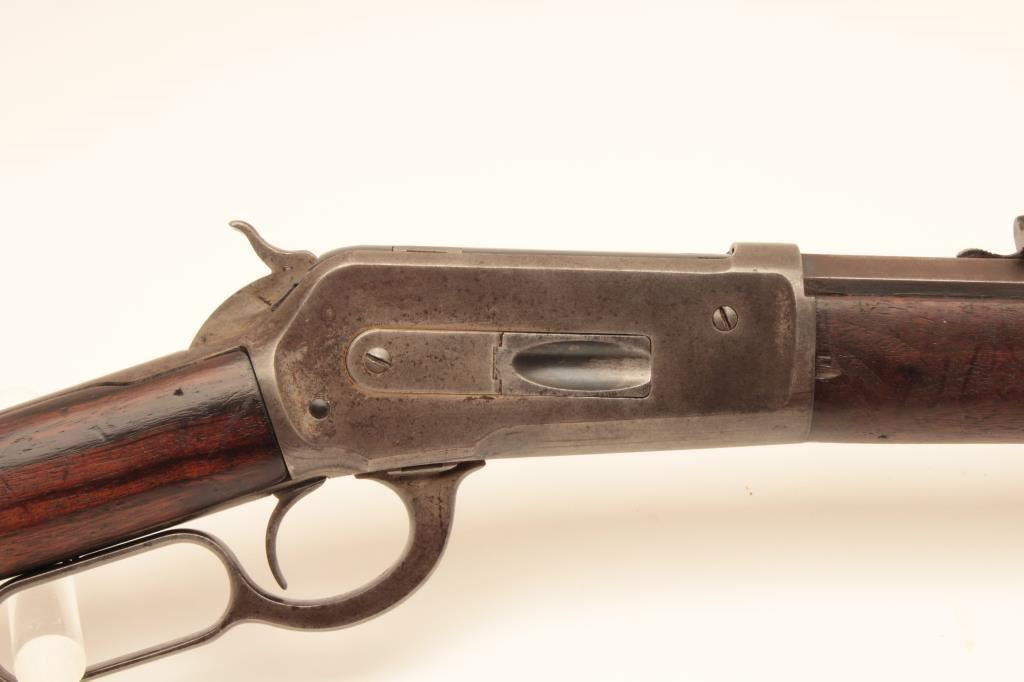 Winchester Model 1886 lever action rifle, .40-65 WCF caliber, Serial #45880. The rifle is in good overall condition with a 26” octagon barrel with full-length magazine. The barrel and magazine have gone to a uniform grey/brown patina with sharp edges and areas of light surface erosion. The receiver is a toning silver patina with old case hardening evident in the hammer and lever. The smooth wood stocks are in good condition with small mars, compressions and a notch cut out of the comb to accommodate a tang sight. The butt stock ends with a smooth, steel crescent butt plate. The bore is fair, the action crisp and markings are legible on this desirable Model 1886 circa 1890. Est.: $1,250-$2,500. (Antique).