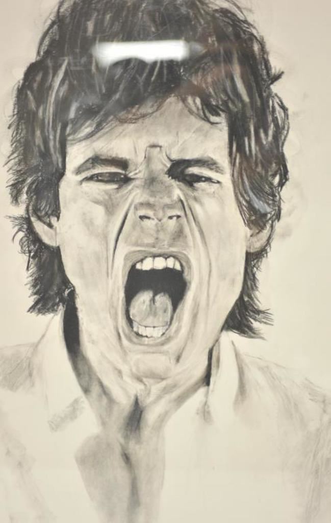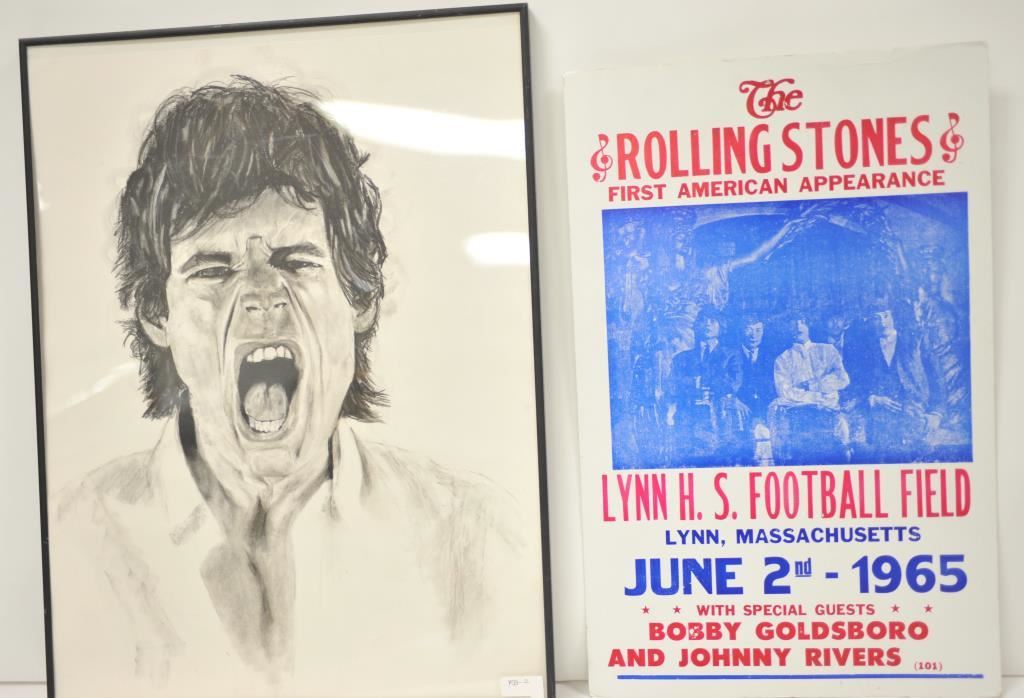 Lot of 3 pcs. from Local Estate: A. Rolling Stones Poster 1965, 2 color old printing method blue and red on white. Approx. 14'x22' B. Original Charcoal on papper (of Mick Jagger, unsigned), attributed to Ron Wood, Obtained L.A. Concert. Approx. 24'x18'. Great Quality. C. Rolling Stones 2002 Los Angeles Promo Laminated poster, approx. 40 1/2'x26 3/8'. Est:$500-1000+++