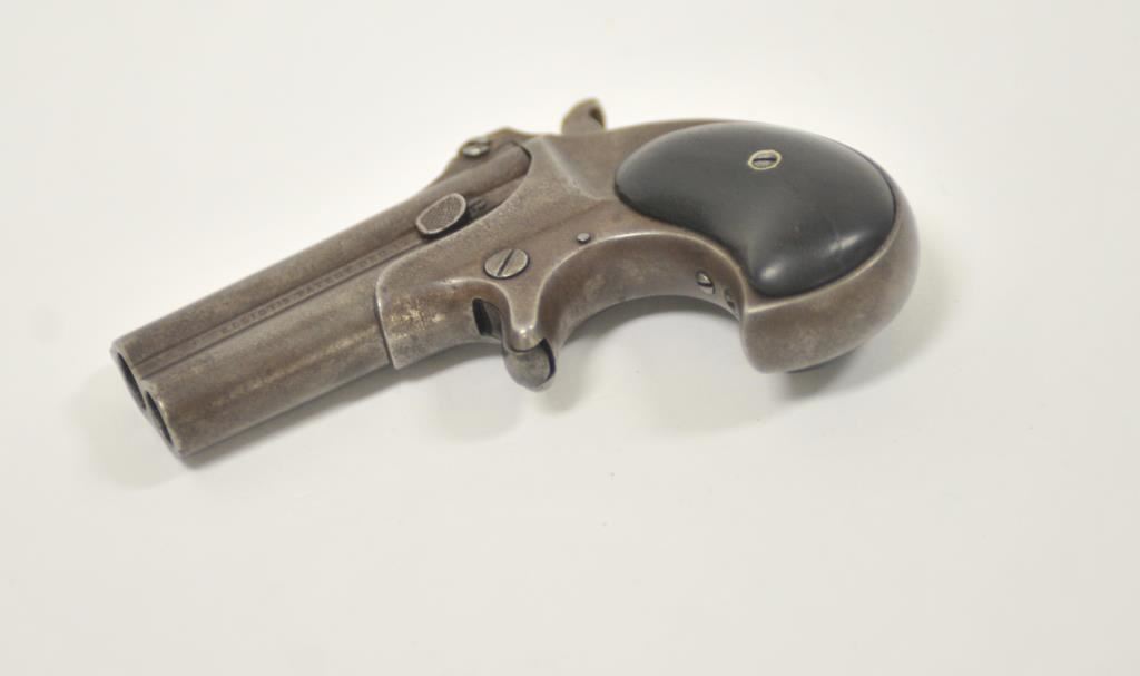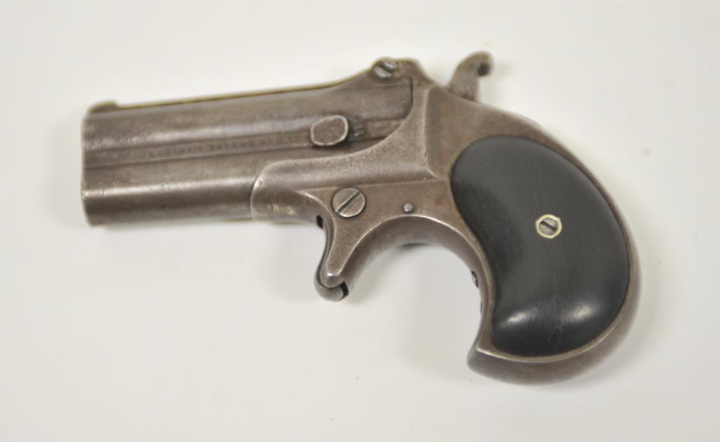 Remington Elliot Patent Double Derringer with side address reading “Remington & Sons Ilion N Y” and “Elliots Patent Dec 12”, S/N 74. Good condition with traces of original blue going to patina and some good bright color on the hammer and latch. The hinge is intact with no breaks and good markings. Good rosewood grips with a little honest wear from being carried. The action is good and the bores are rough. A scarce variation from the Dr. Rudy Johnson collection who co-authored the definitive book on this model. (Antique) Est.: $2000-$4000