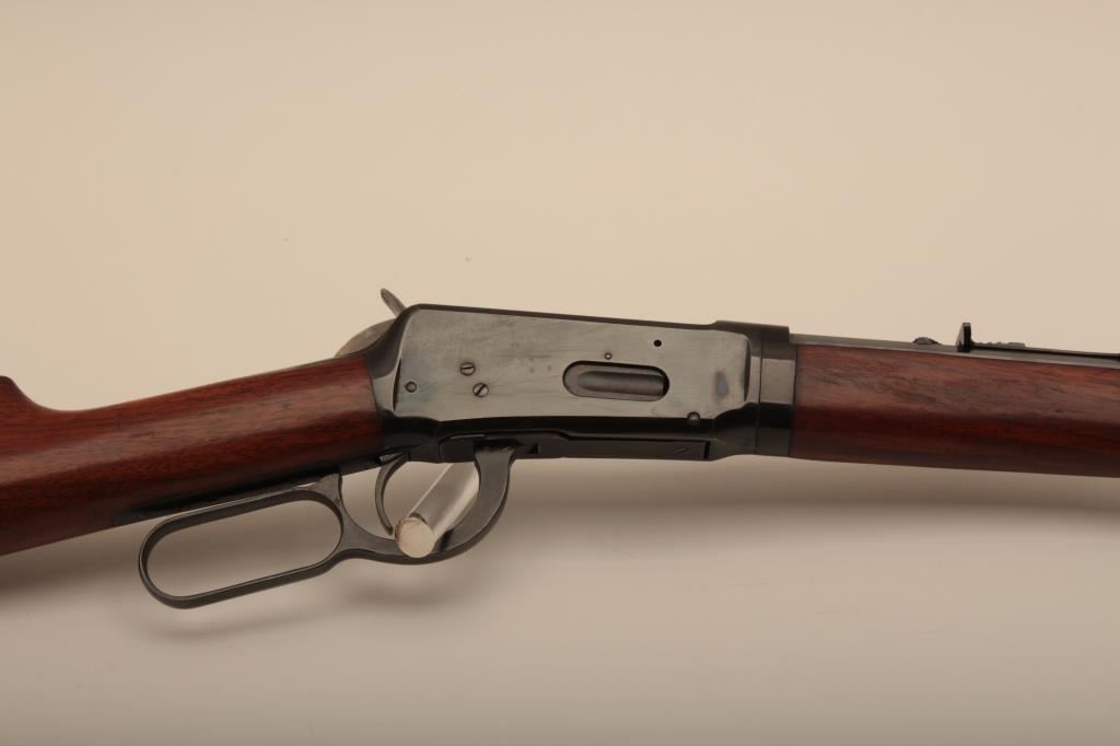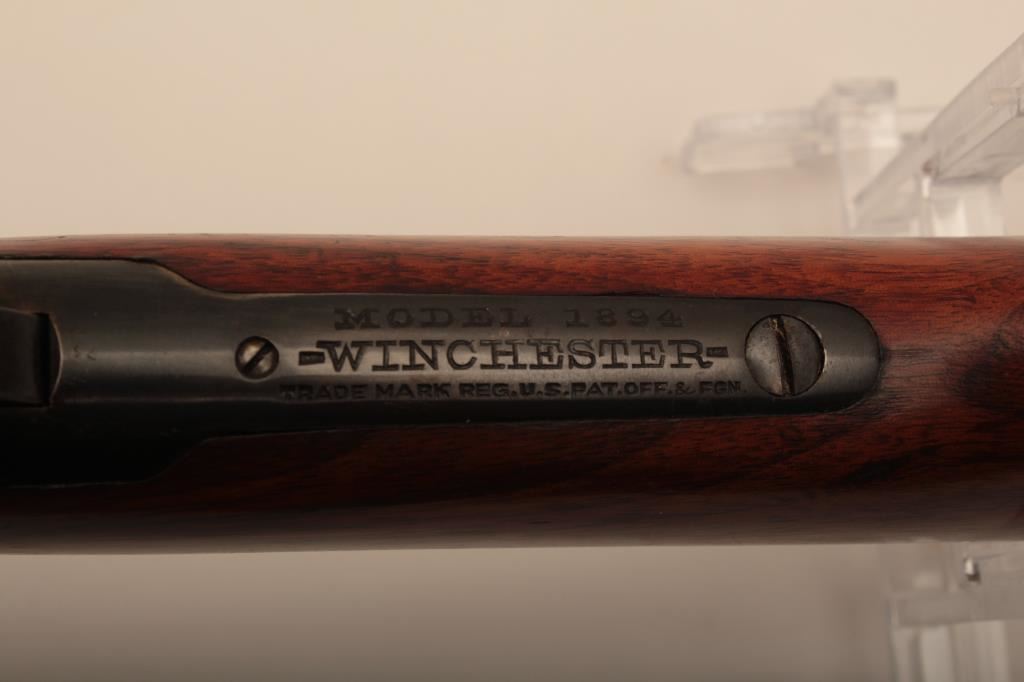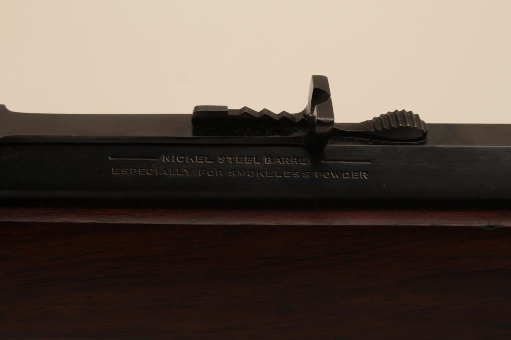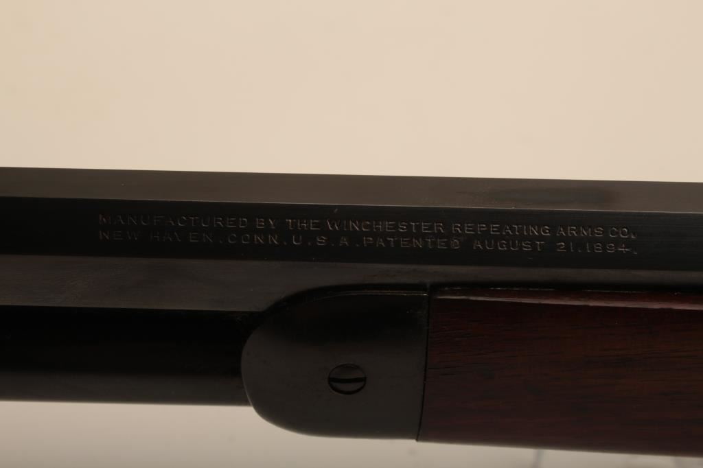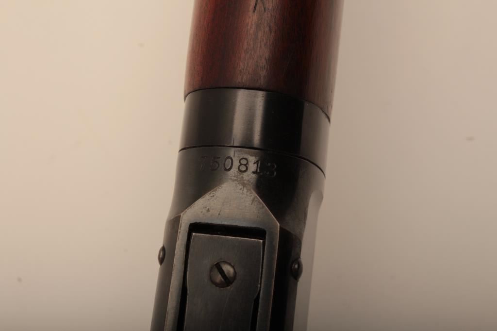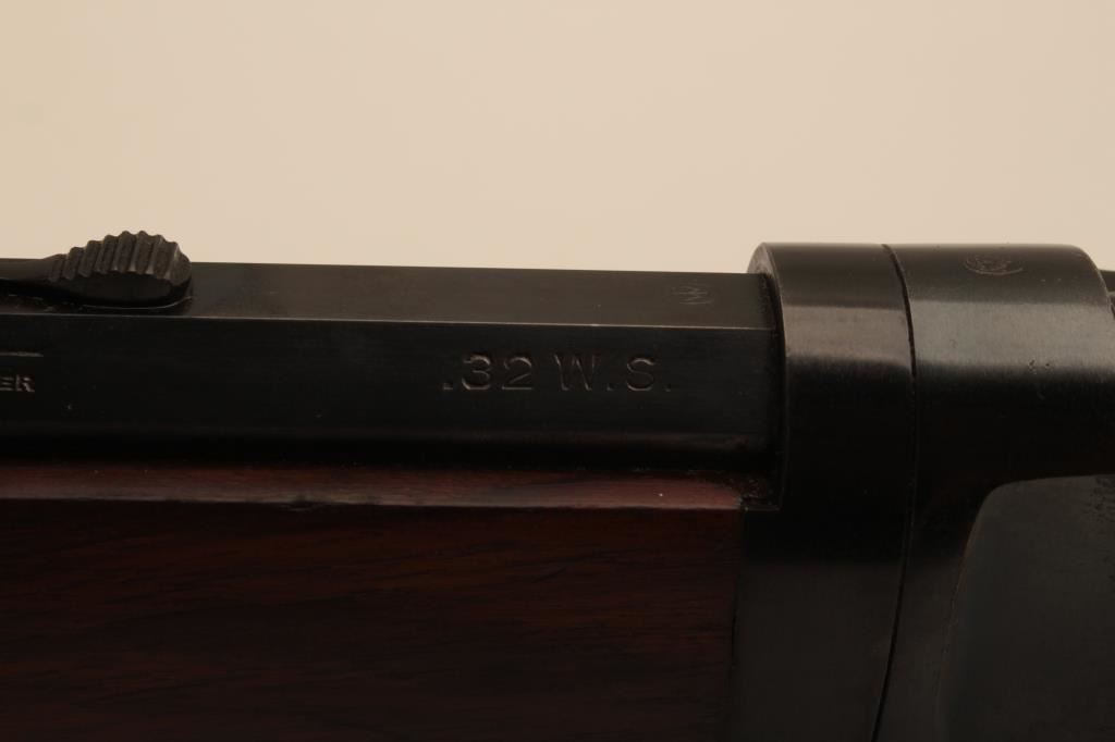 Winchester Model 94 Special Order Takedown rifle in .32 W.S. caliber with 26” octagon barrel, full mag, crescent butt, S/N 750913. The rifle remains in very good plus to almost fine condition with approximately 90%-95% original finish. The magazine tube was dented and restored. The stock has been cleaned but not sanded. The frame on the right side shows minor spots and losses of finish. The fore end cap and some small parts finish has been restored. The interior of the action shows very little use and the bore is bright. A high finish 94 with some “Help” (C&R) Est.: $1500-$3000