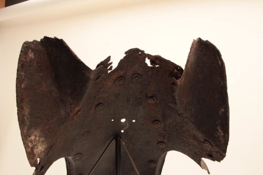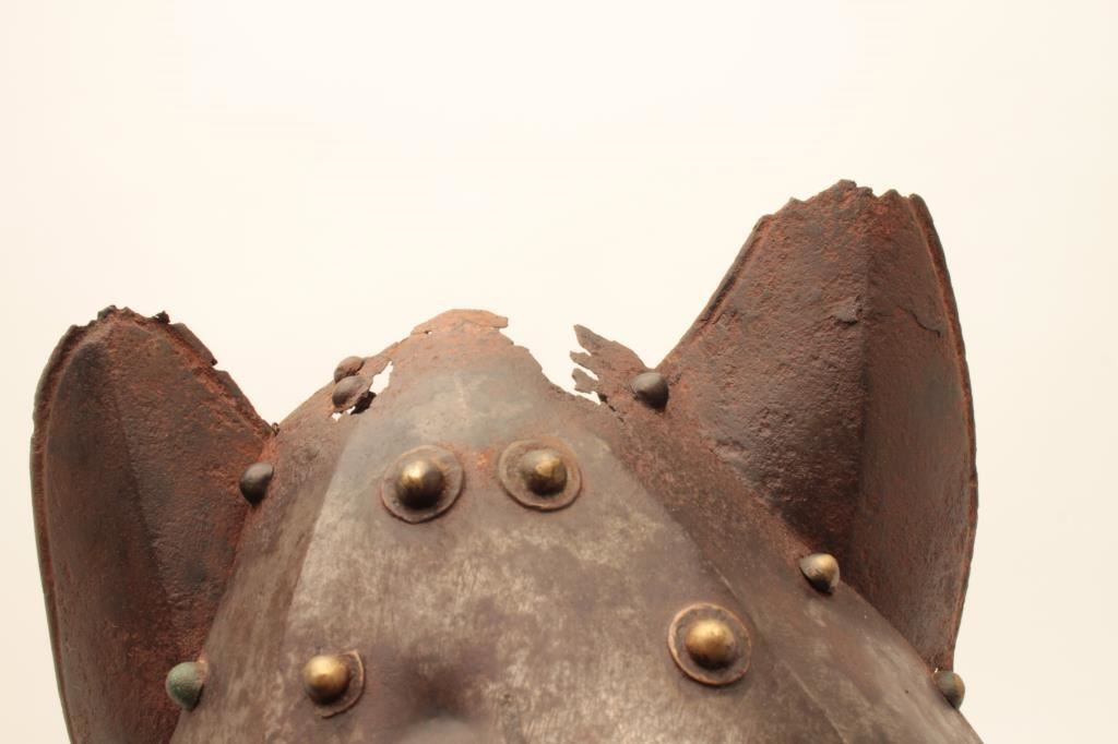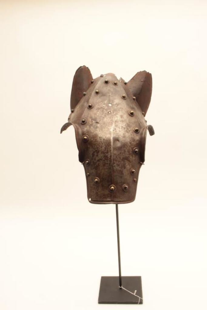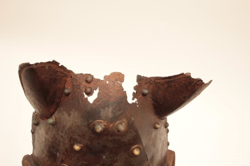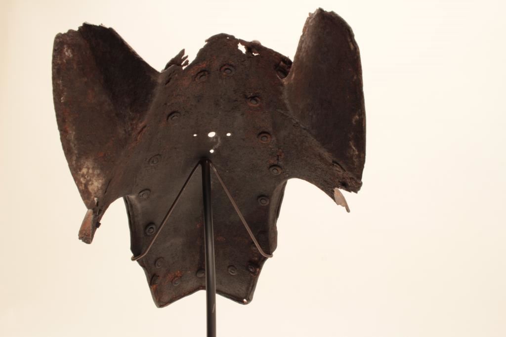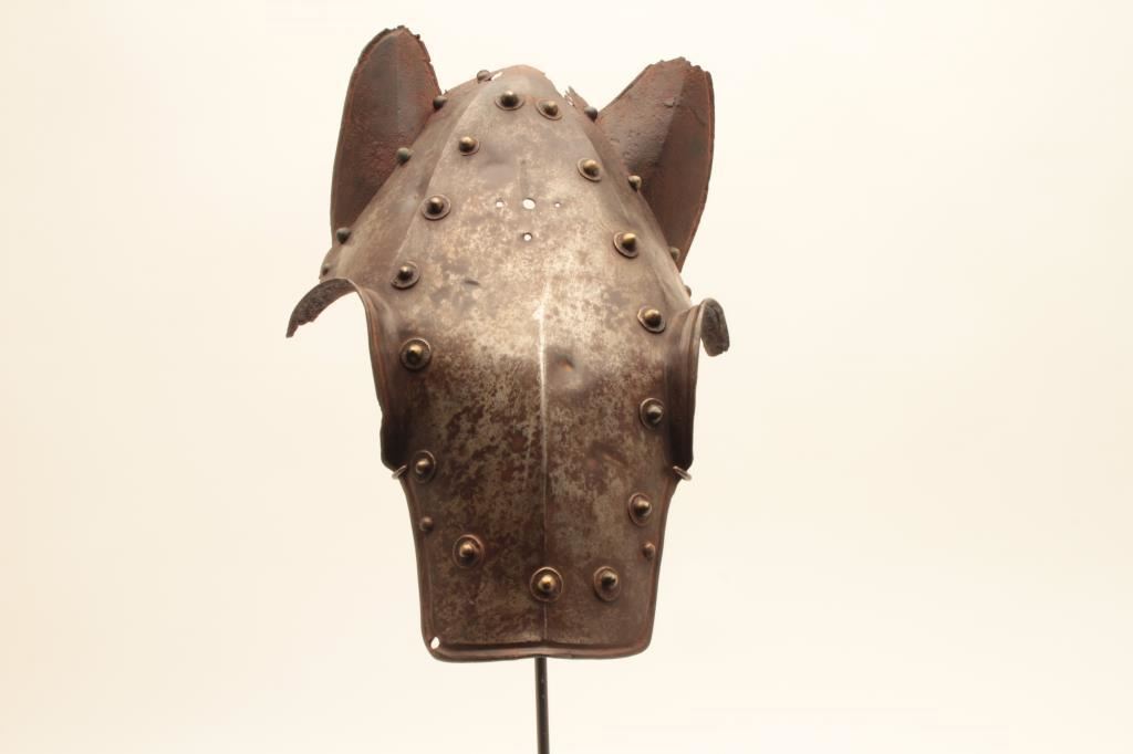 Horse defense (Chanfron) circa early to Mid-16th century. Noted Glorietta, New Mexico antiquities dealer/collector Jeff Hengesbaugh places at time of De Soto’s expedition and probably Spanish. Measures approximately 15” x 11” showing heavy natural aging (No chemicals applied) with dark patina on brass rivets. Losses to ears and top. Excavated long ago. Absolutely genuine and not a Victorian or later reproduction with stand. Est.: $5,000-$10,000