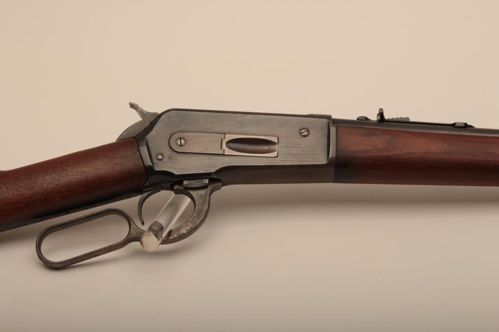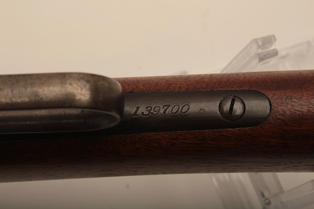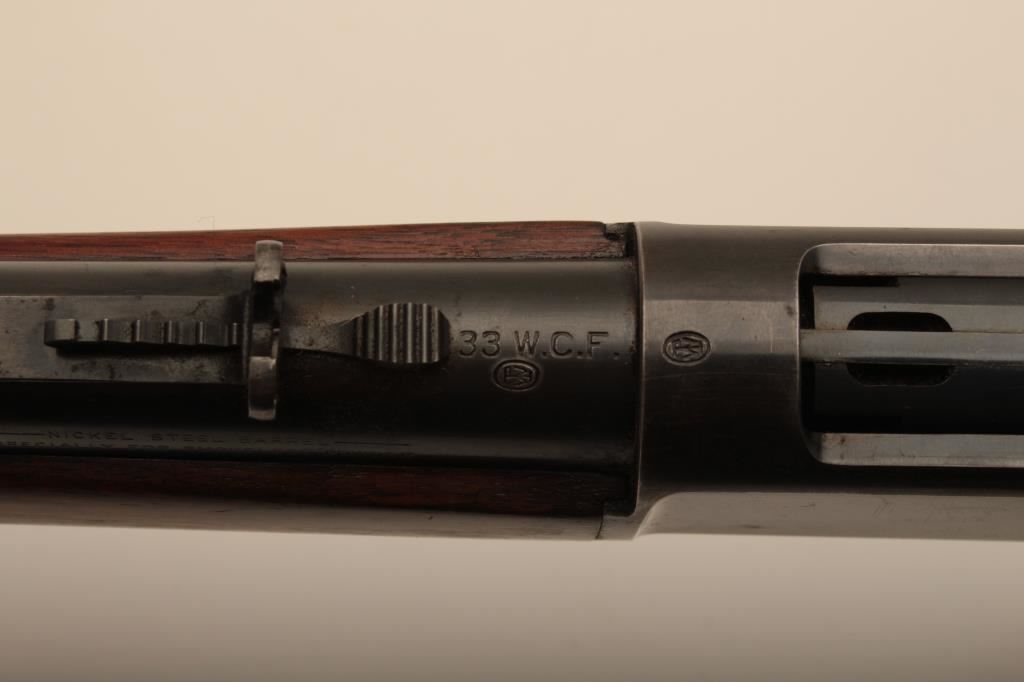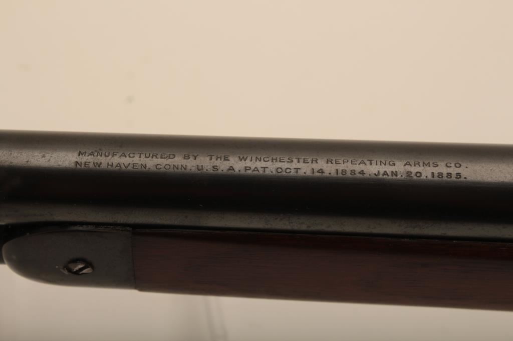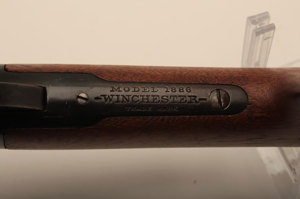 Winchester Model 1886 lever action rifle in .33 caliber with 24” round barrel, half mag, non-takedown frame, shotgun butt with milled steel butt plate, S/N 139700. Very good plus to almost fine condition with 90%-95% original blue showing on barrel and tube. The frame shows 70%-80% drifting at the edges and bottom. Some minor scratches. The wood is very good also and lightly cleaned (not sanded and fits up well. 60%-80% case colors on the hammer and lever. The action is crisp with bright bore. Has seen little use. (C&R) Est.: $1500-$3000
