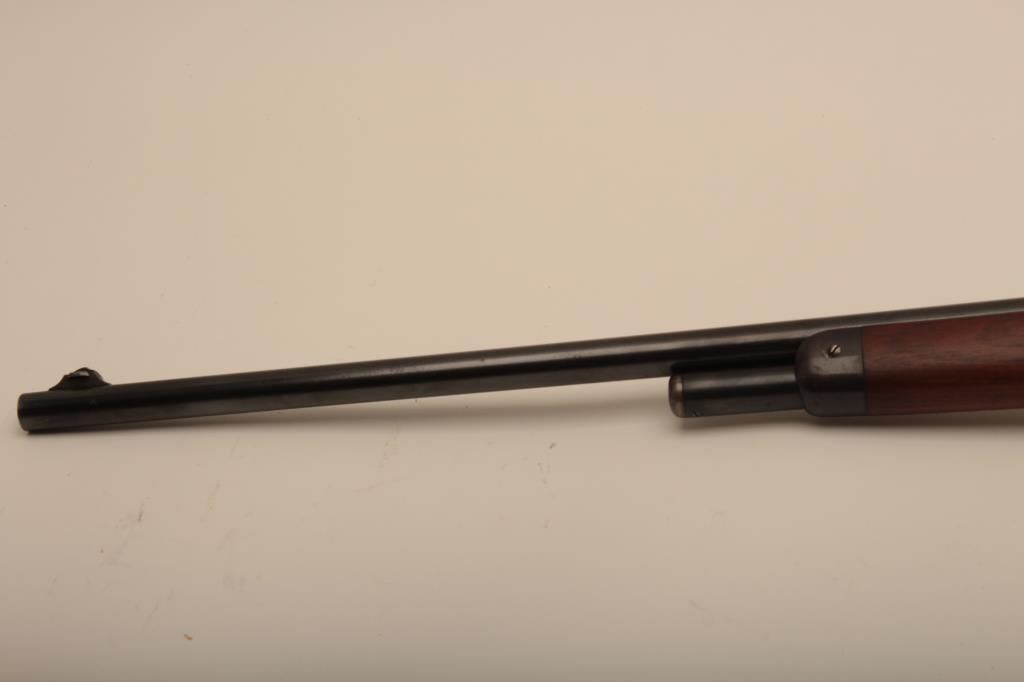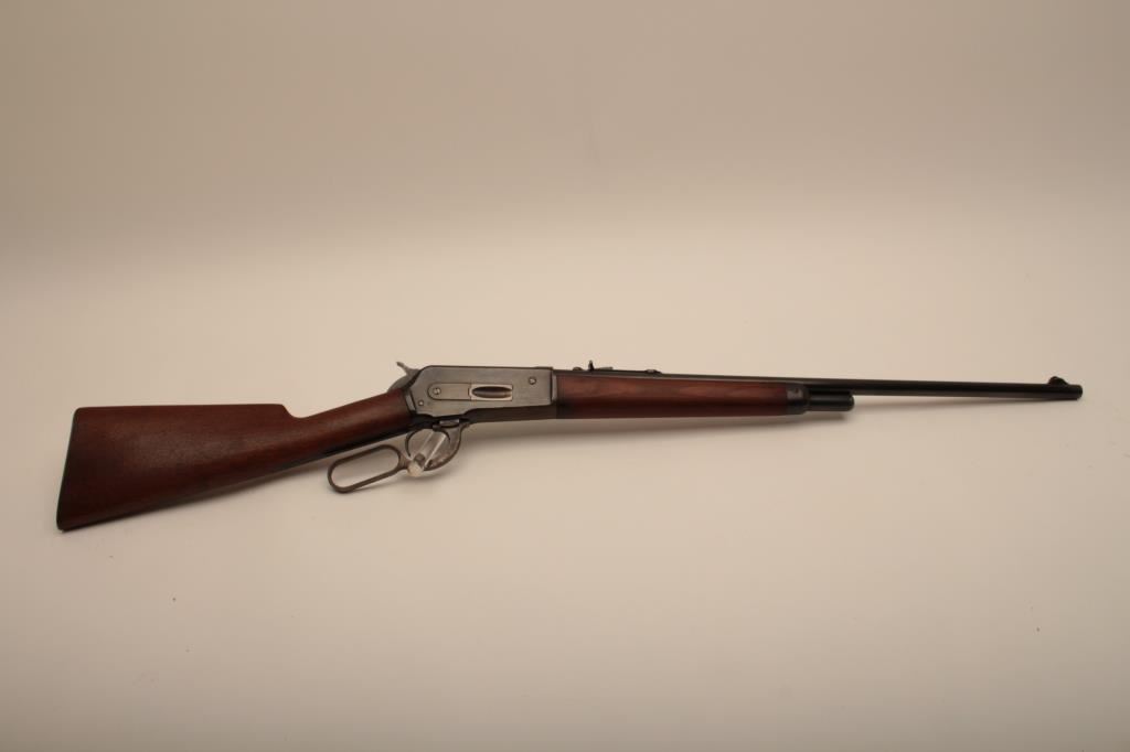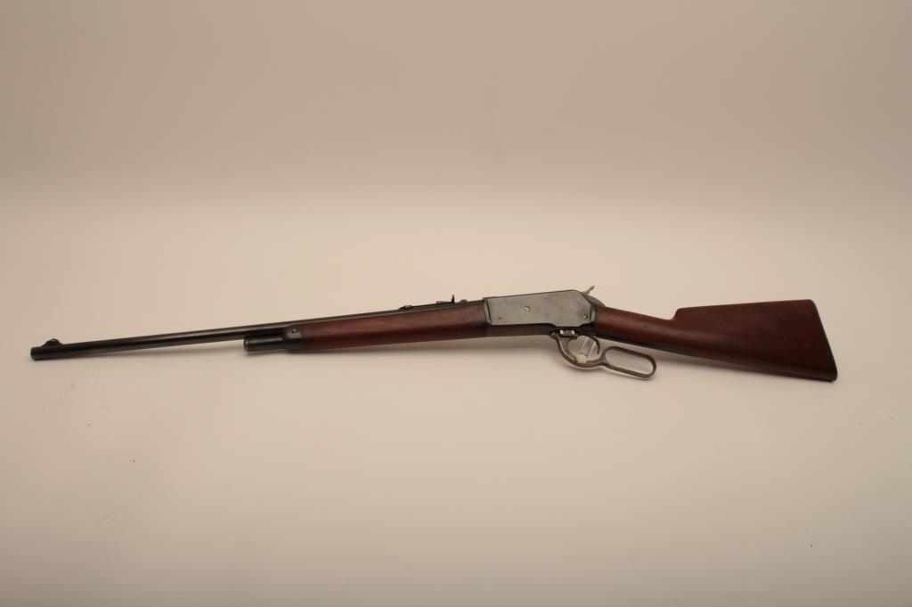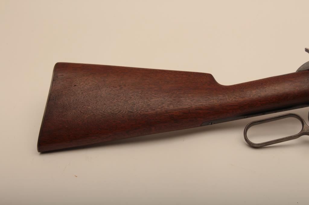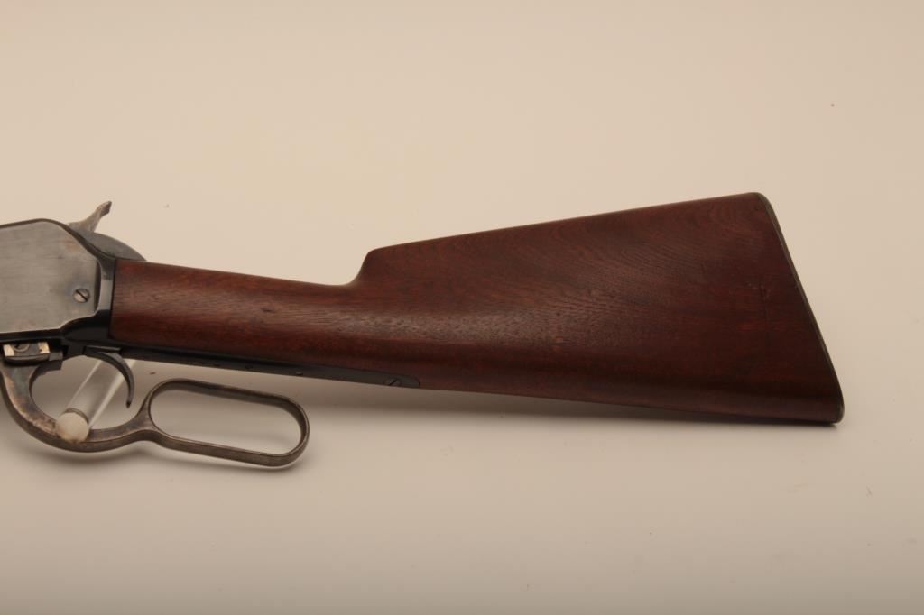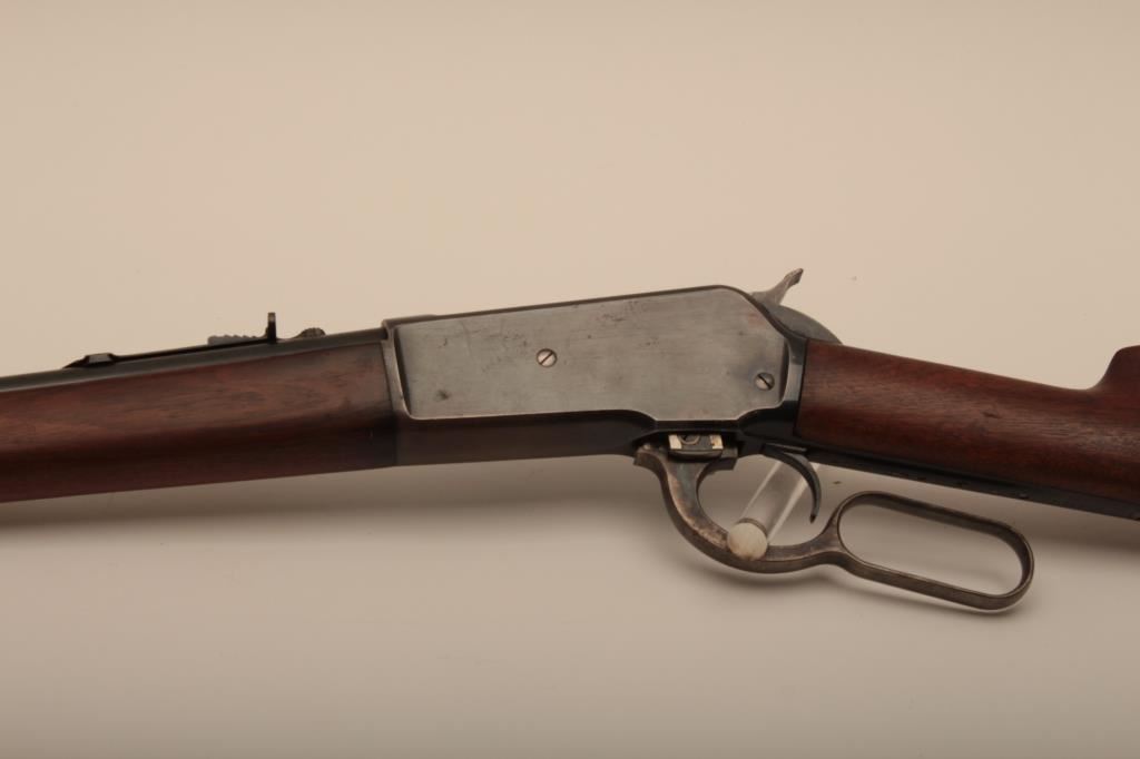 Winchester Model 1886 lever action rifle in .33 caliber with 24” round barrel, half mag, non-takedown frame, shotgun butt with milled steel butt plate, S/N 139700. Very good plus to almost fine condition with 90%-95% original blue showing on barrel and tube. The frame shows 70%-80% drifting at the edges and bottom. Some minor scratches. The wood is very good also and lightly cleaned (not sanded and fits up well. 60%-80% case colors on the hammer and lever. The action is crisp with bright bore. Has seen little use. (C&R) Est.: $1500-$3000