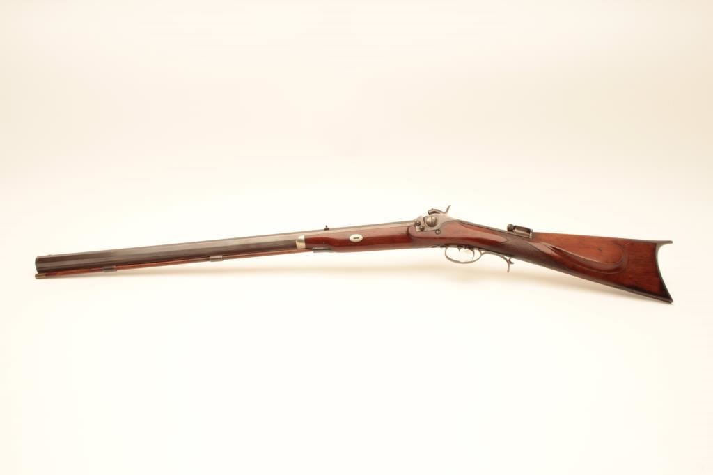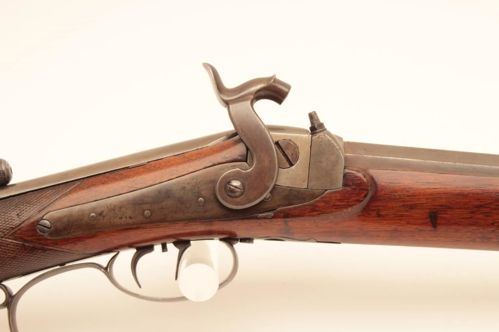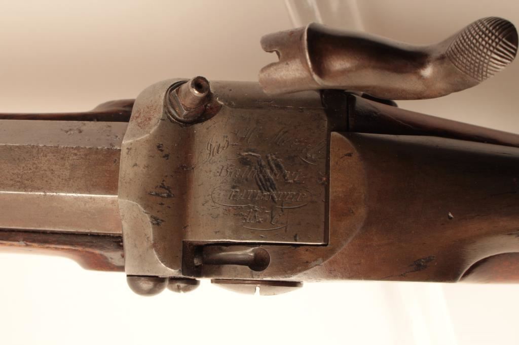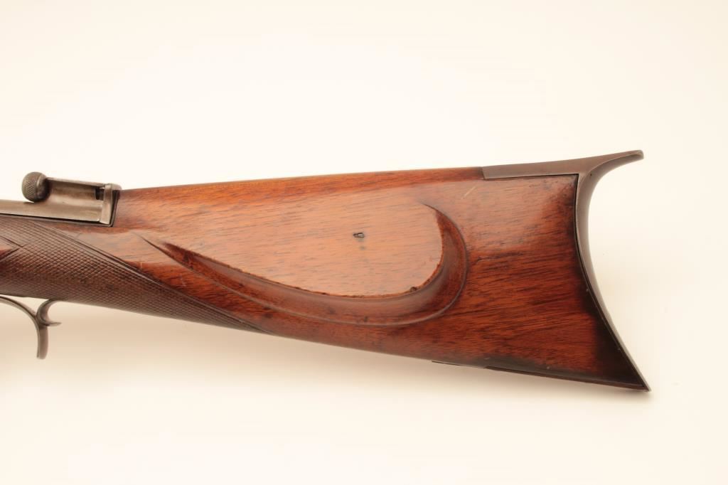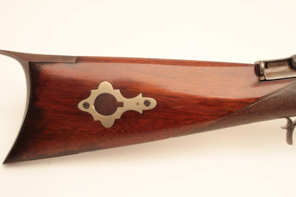 Scarce Merrill breech loading percussion Sporting rifle, .44 caliber, 29” octagon barrel, brown patina with traces of case color on back action lockplate, double set triggers (working at time of description), checkered wood half stock with patchbox and brass tipped wood cleaning rod, top of receiver engraved “Jas. H. Merrill/Baltimore/Patented 1856”; overall very good condition with a crisp action, pleasing patina to metal surfaces, bore shows good rifling; very good wood. (Antique). Est.: $4,000-$8,000.