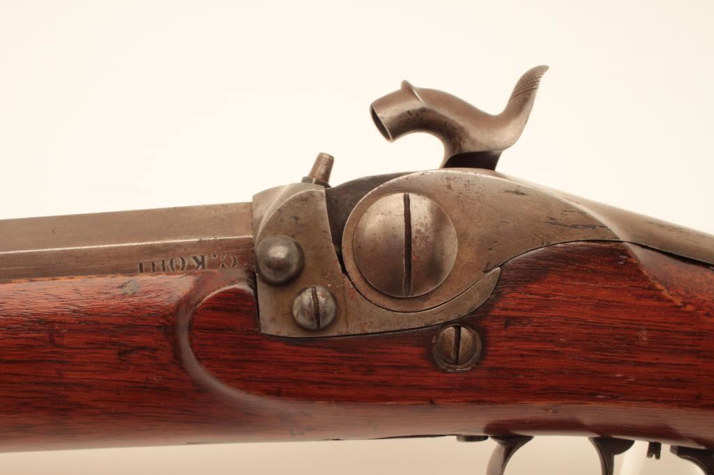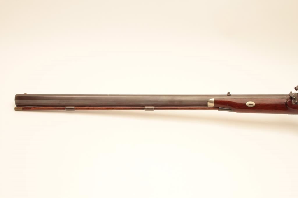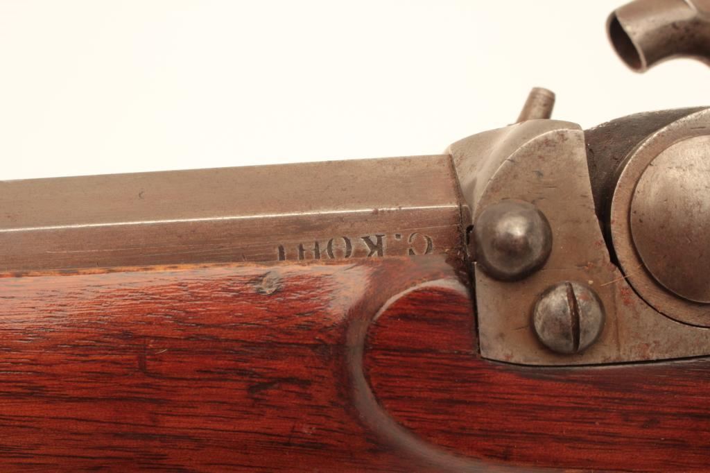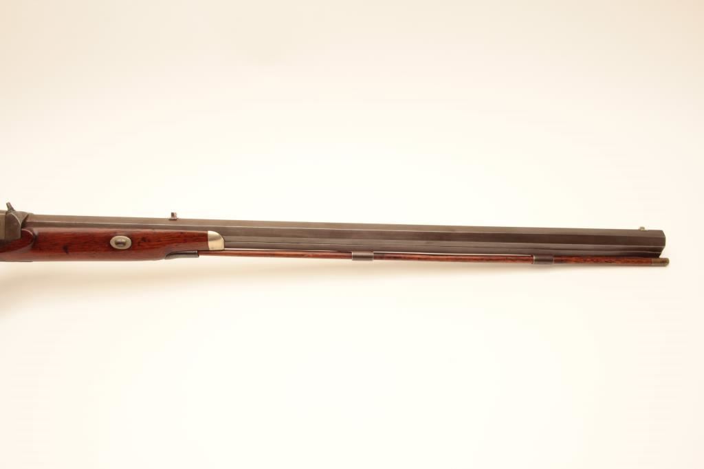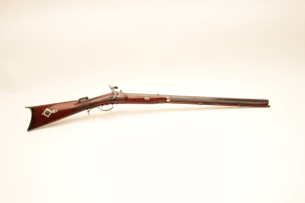 Scarce Merrill breech loading percussion Sporting rifle, .44 caliber, 29” octagon barrel, brown patina with traces of case color on back action lockplate, double set triggers (working at time of description), checkered wood half stock with patchbox and brass tipped wood cleaning rod, top of receiver engraved “Jas. H. Merrill/Baltimore/Patented 1856”; overall very good condition with a crisp action, pleasing patina to metal surfaces, bore shows good rifling; very good wood. (Antique). Est.: $4,000-$8,000.