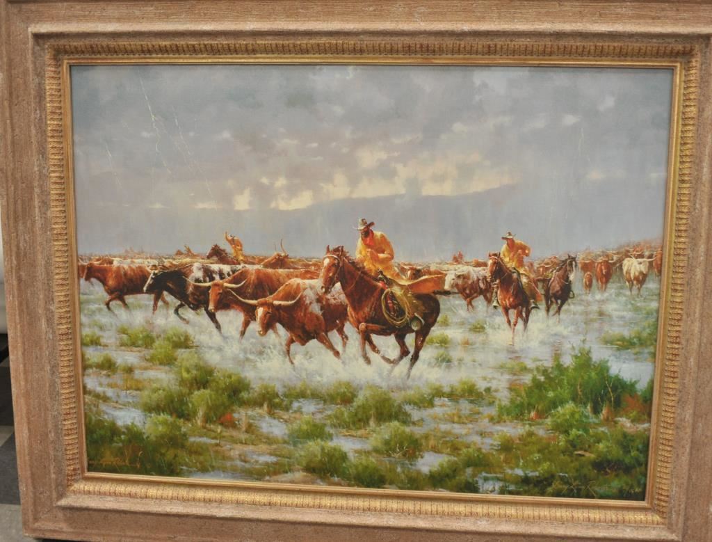 Massive framed Giclee print by Gary Lyn Roberts (2/15 AP) showing cowboys herding longhorns during a lightning storm; approximately 49” x 62” overall; great detail and motion. Est.: $900-$1,800.