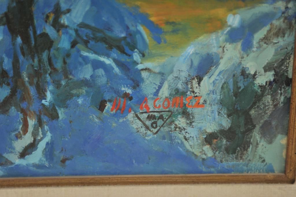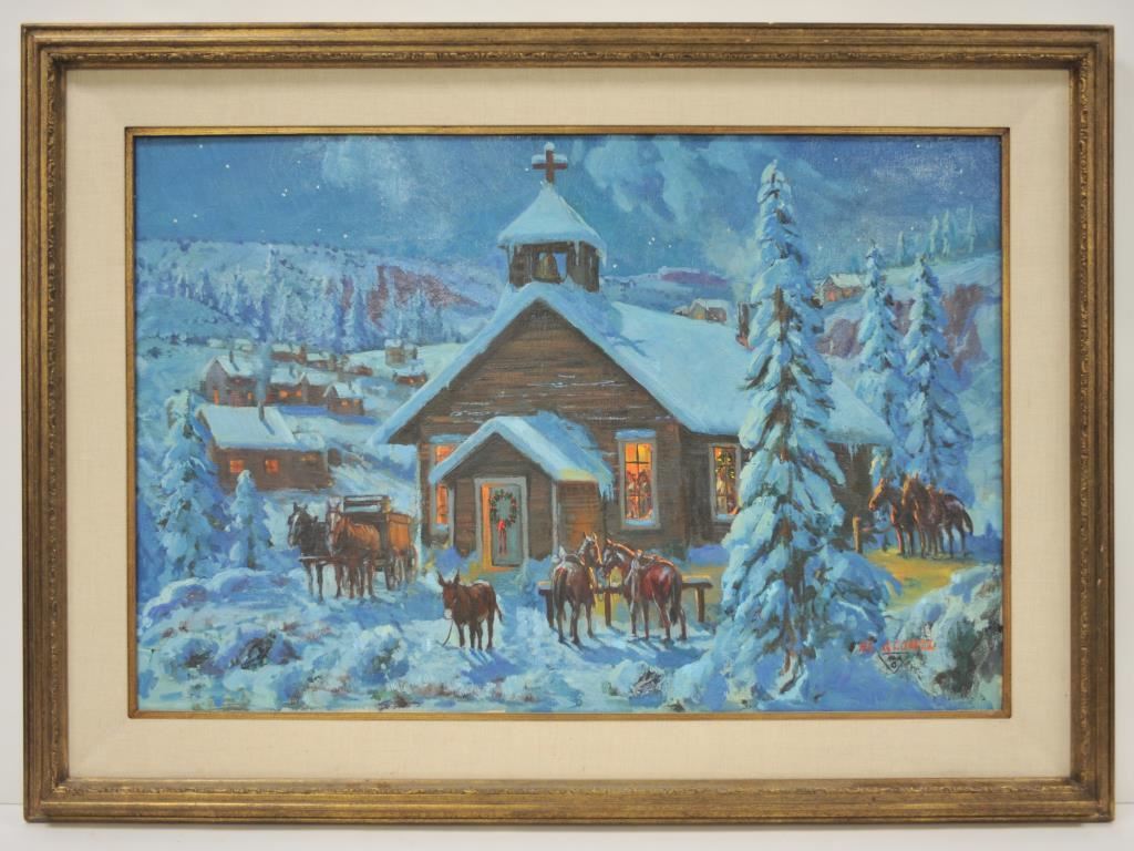 Large original oil on canvas of Western church in the snow at Christmas by Gomez; approximately 33” x 45” overall. Est.: $400-$800.