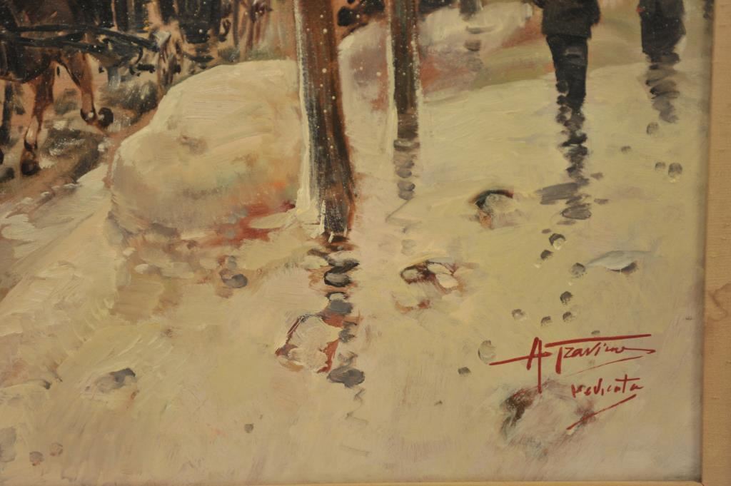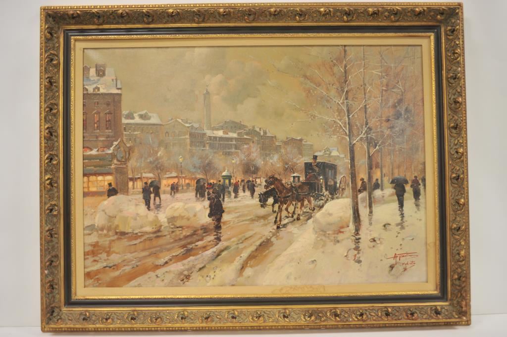 Large framed original oil on canvas of early European street scene by Antonio Gravina; approximately 37” x 48”; classic in style. Est.: $900-$1,800.