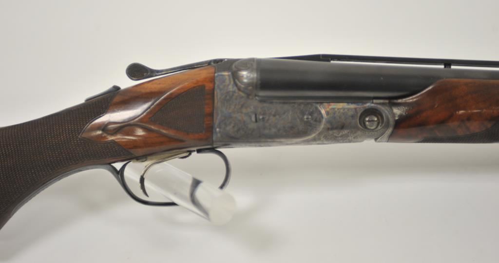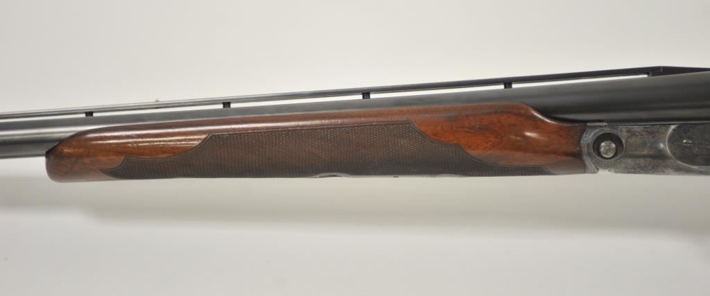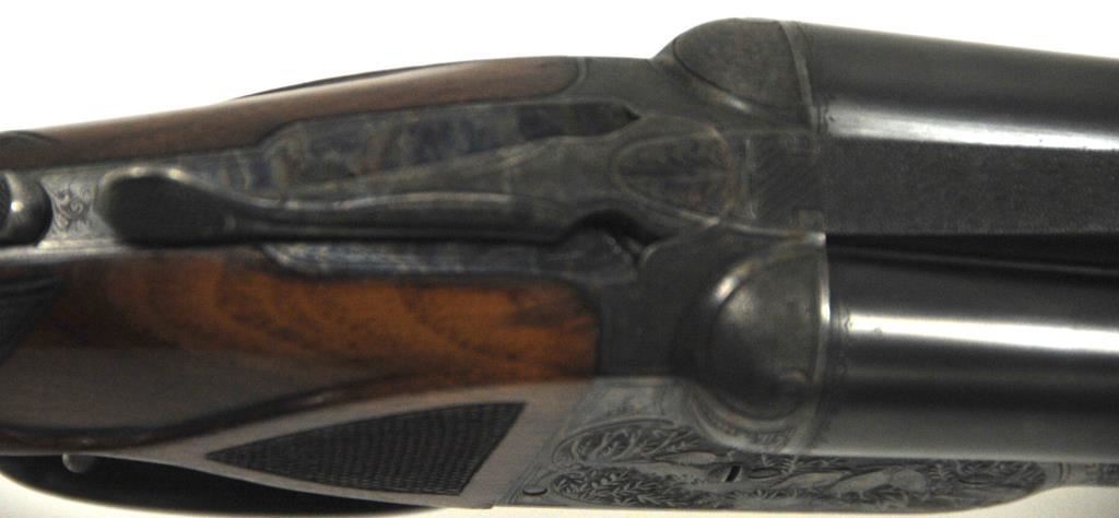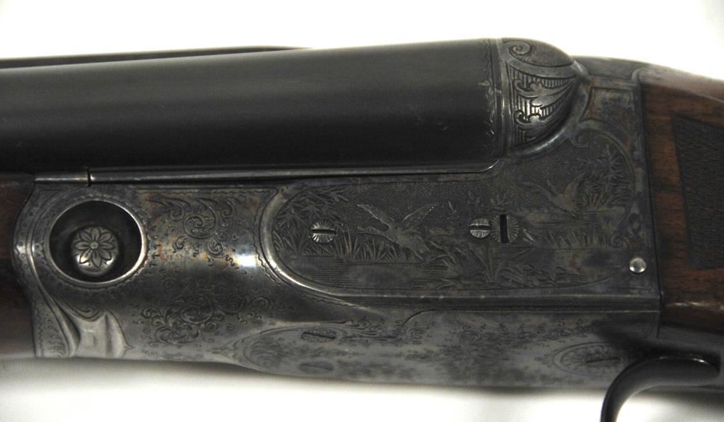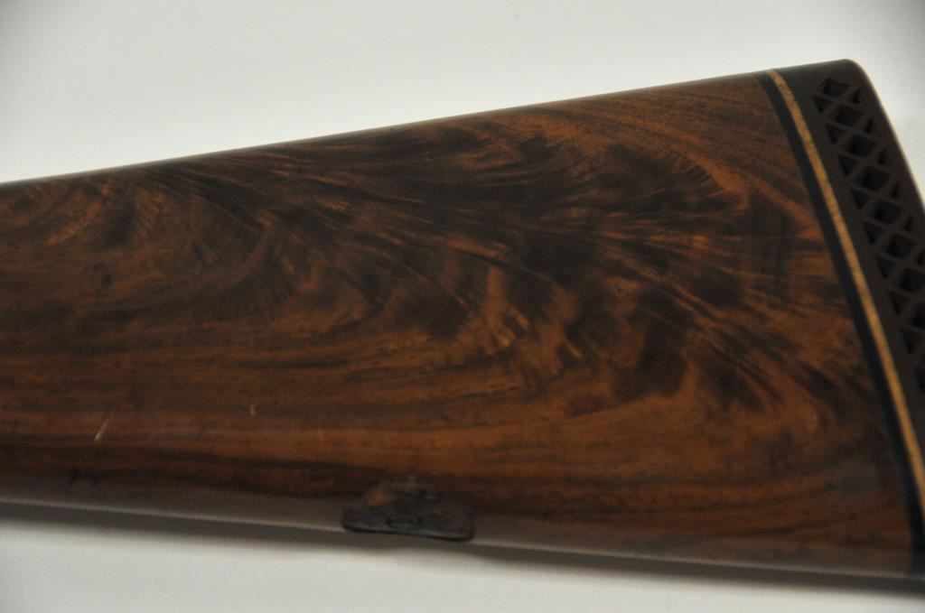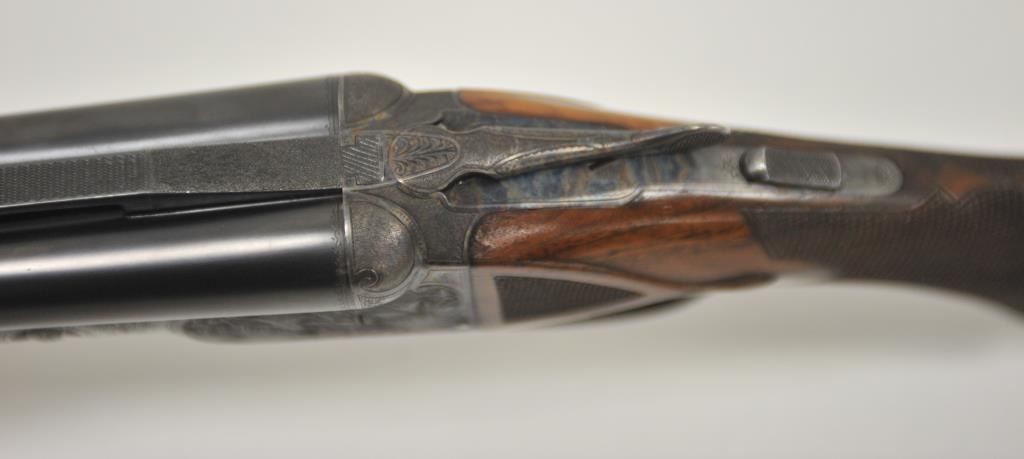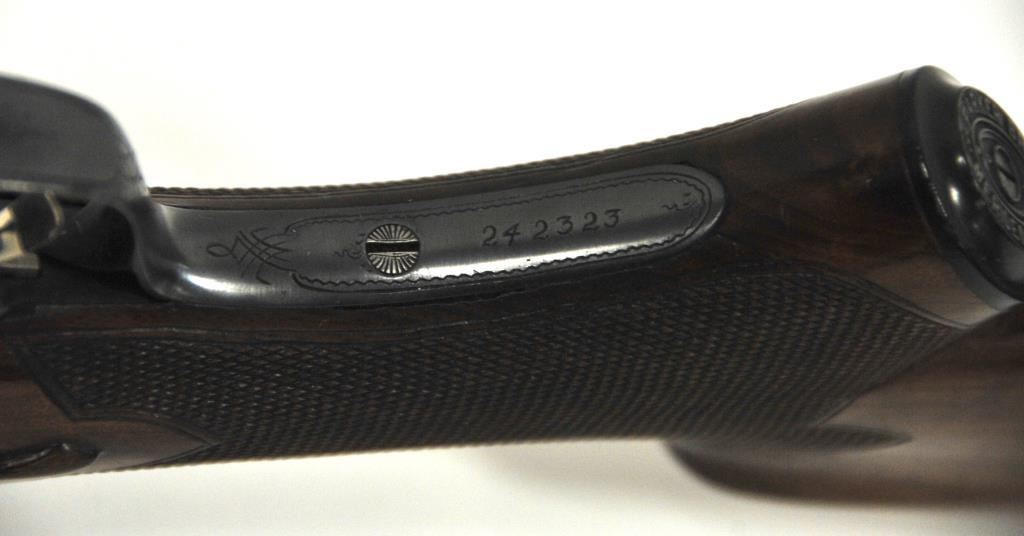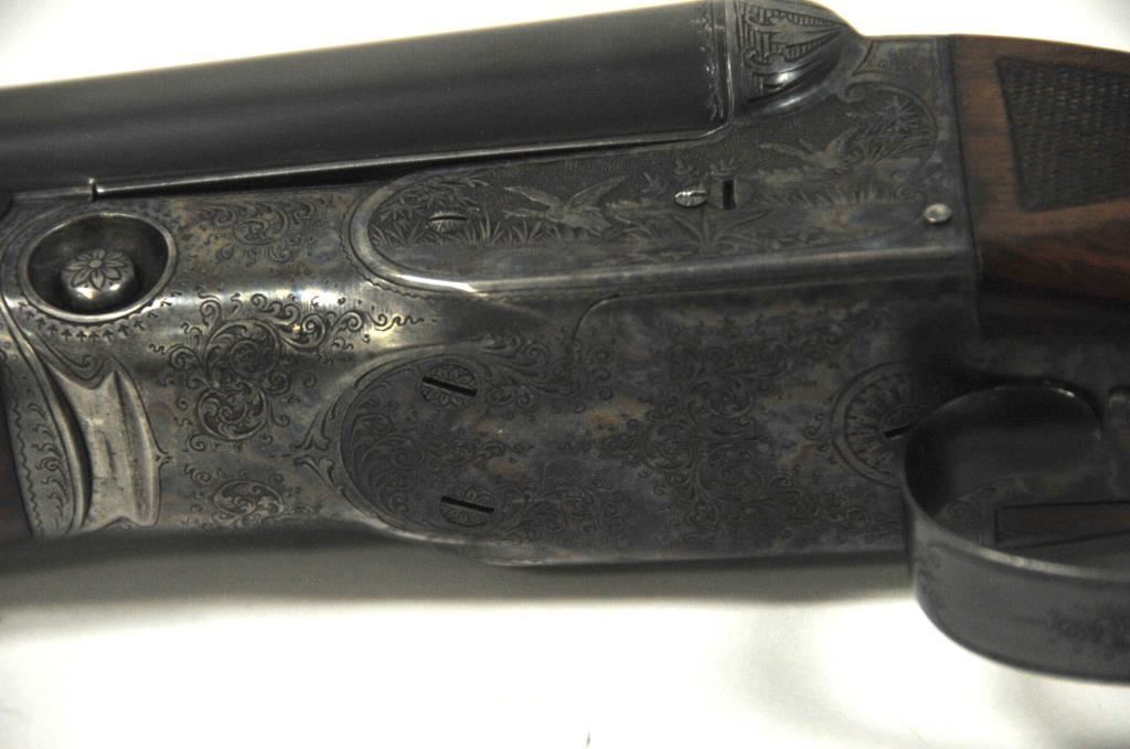 Original Pre-War Parker 20GA SxS shotgun with 28” barrels, factory vent rib, auto ejectors, and single trigger, S/N 242323. Note: No Parker markings on the bottom of frame or barrels. Shows made in U.S.A. and Ilion, N.Y. on water table inside. The frame is “DH” marked above serial number. Marked D grade 20GA for 2 ¾” shells on barrel lug. Also choked full and full along with “O” on back lug and Parker overload proofs. The stocking and engraving of a much higher quality than normally found on a D grade. A plaque has been removed from belly of stock. 90%-95% blue and case hardened finish with very good plus stocks showing minor bumps and scratches. Measures 13 7/8” to the end of recoil pad (13” to the end of the wood). Interior and bores are very good plus to fine. No factory info available at the time of cataloging but possibly available through Parker Collector’s Association. This gun came from an estate in Santa Barbara and fresh to collector’s market. (C&R) Est.: $4000-$8000