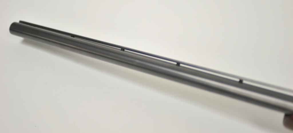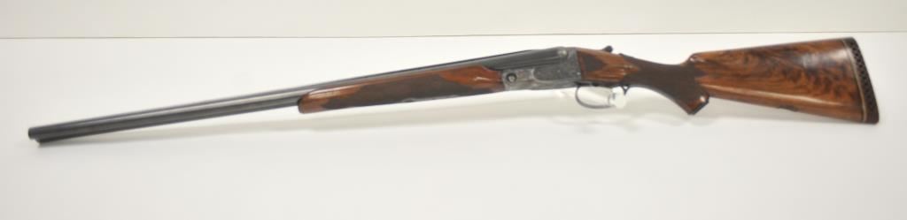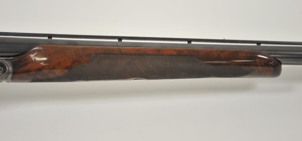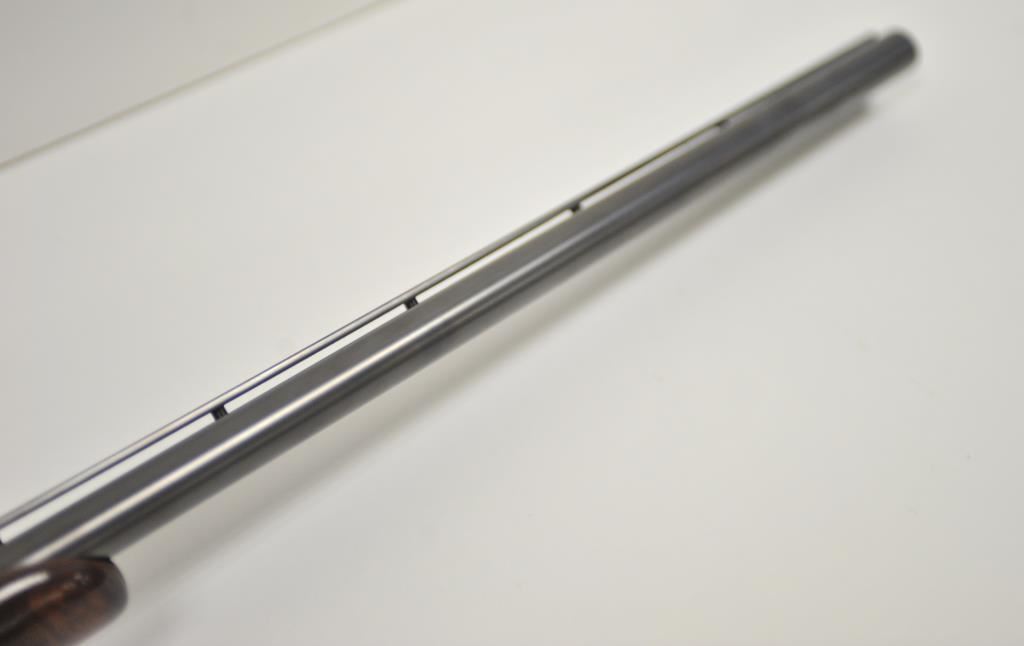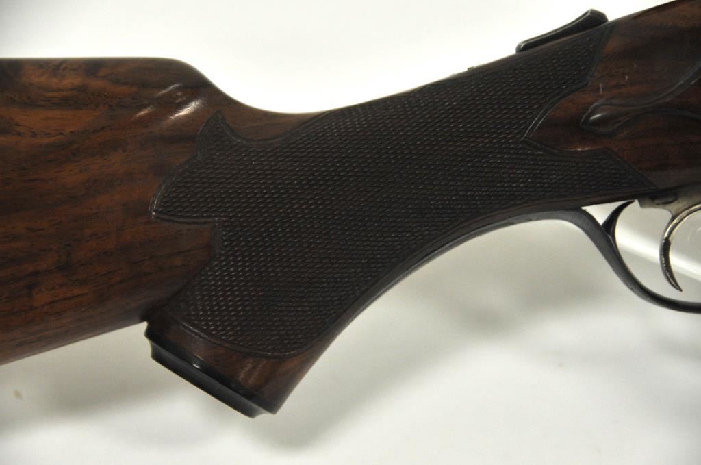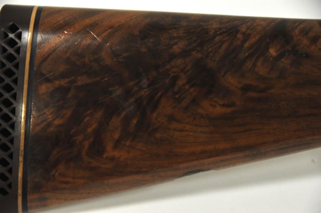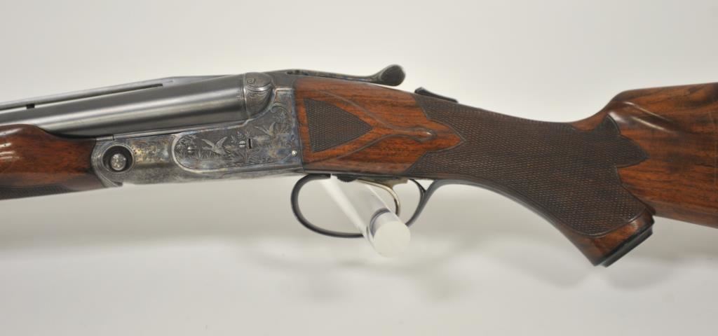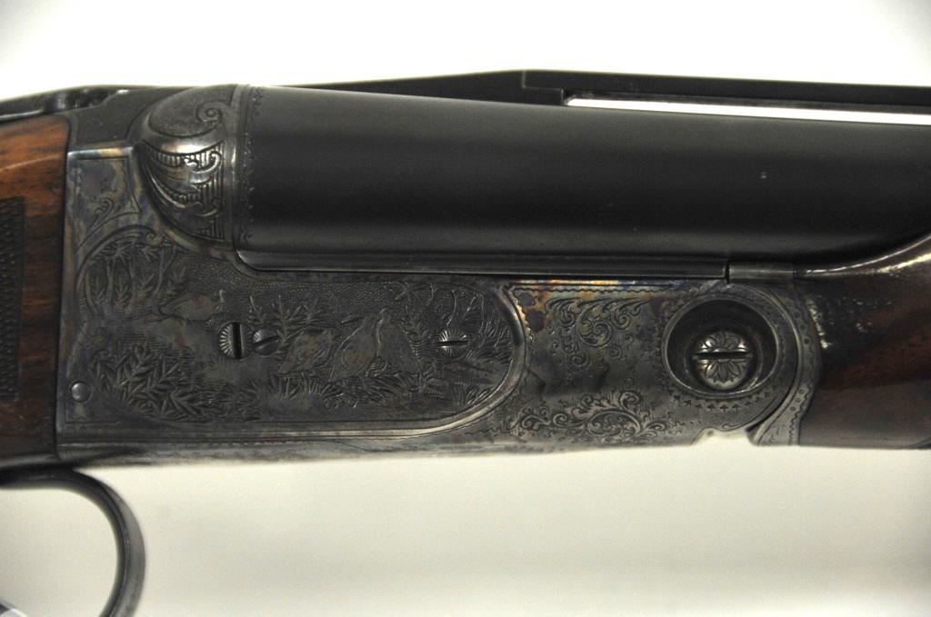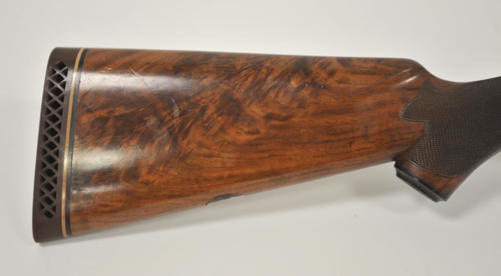Original Pre-War Parker 20GA SxS shotgun with 28” barrels, factory vent rib, auto ejectors, and single trigger, S/N 242323. Note: No Parker markings on the bottom of frame or barrels. Shows made in U.S.A. and Ilion, N.Y. on water table inside. The frame is “DH” marked above serial number. Marked D grade 20GA for 2 ¾” shells on barrel lug. Also choked full and full along with “O” on back lug and Parker overload proofs. The stocking and engraving of a much higher quality than normally found on a D grade. A plaque has been removed from belly of stock. 90%-95% blue and case hardened finish with very good plus stocks showing minor bumps and scratches. Measures 13 7/8” to the end of recoil pad (13” to the end of the wood). Interior and bores are very good plus to fine. No factory info available at the time of cataloging but possibly available through Parker Collector’s Association. This gun came from an estate in Santa Barbara and fresh to collector’s market. (C&R) Est.: $4000-$8000