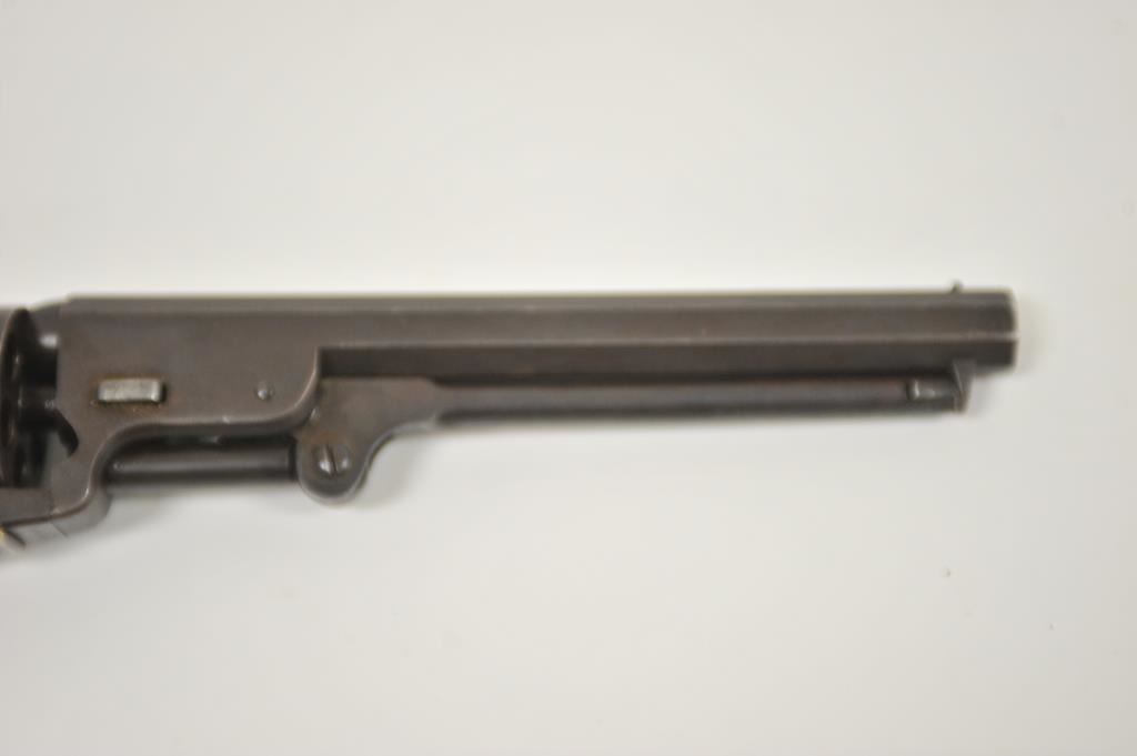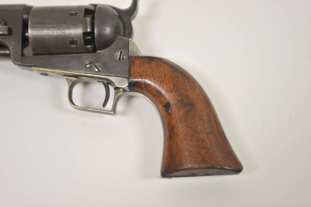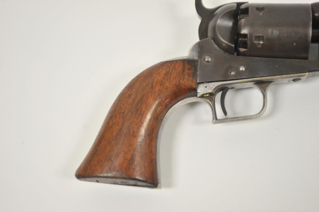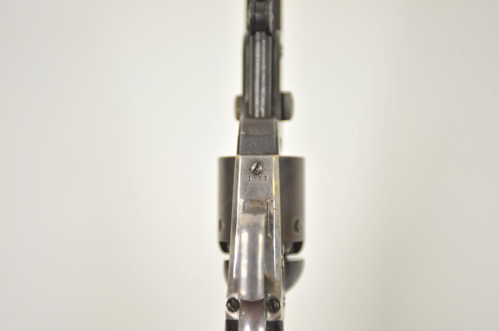 Colt 1851 Navy 2nd model squareback revolver, S/N 1453 in early production range and made in the California gold rush era. This revolver remains in good to very good original as found condition with traces of finish mixed in a brown patina. Scattered light to moderate pitting mostly on the barrel probably from holstering. The frame is crisp as is the cylinder with 70%-80% original scene remaining and good Ornsby signature. Good barrel address and mostly visible very small Colt’s patent on the frame. The grips show 40%-60% varnish and are at least very good plus but not quite fine showing minor wear and aging. 90% plus thick old original sliver plate that is darkened. Some “tapping” marks on the bottom of the grips and strap. All matching visible serial numbers. An absolutely original and early 2nd model with the appearance collectors like and above average for this variation. (Antique) Est.: $3,500-7,000