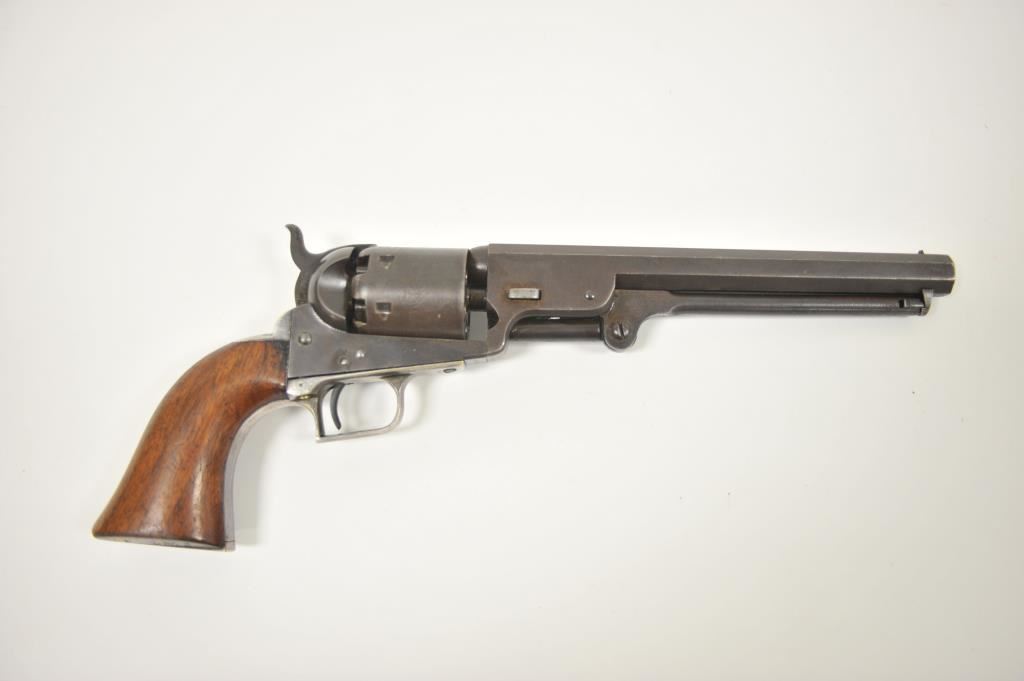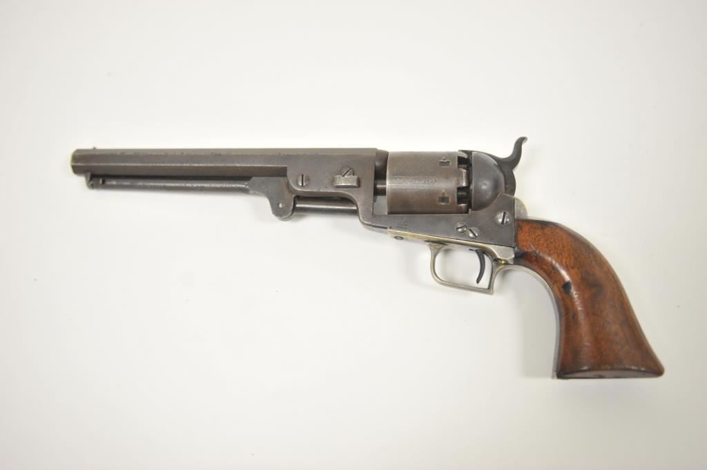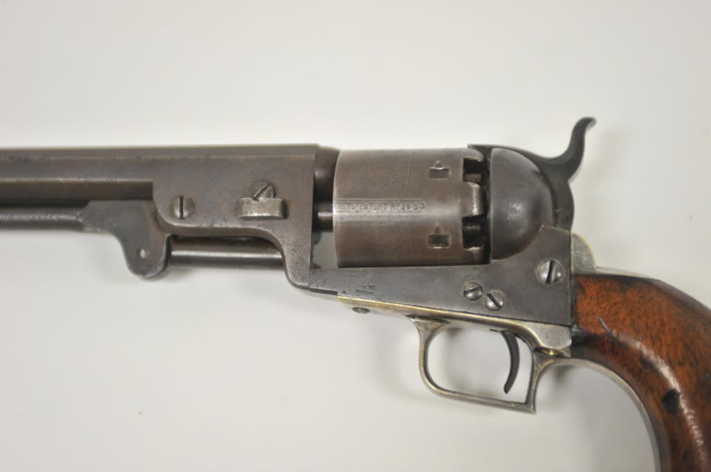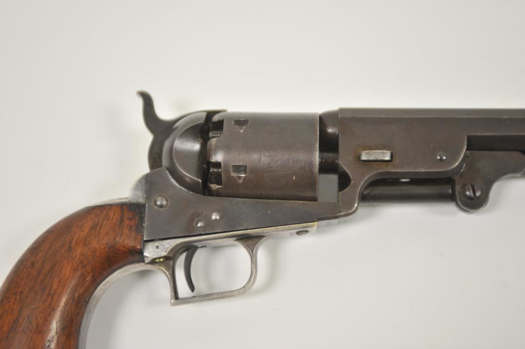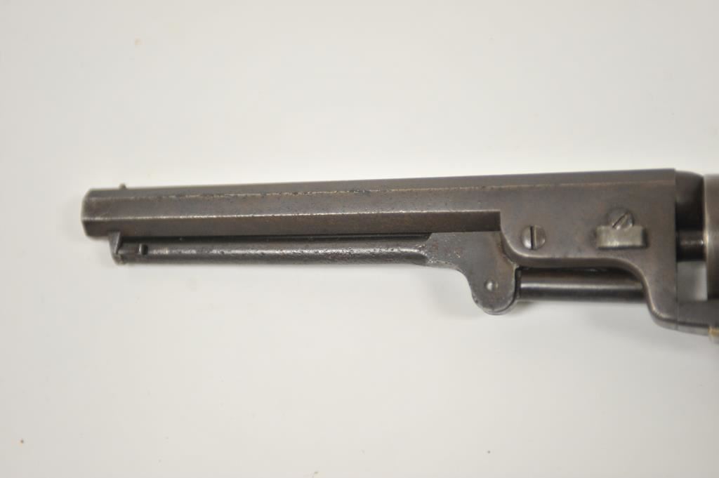 Colt 1851 Navy 2nd model squareback revolver, S/N 1453 in early production range and made in the California gold rush era. This revolver remains in good to very good original as found condition with traces of finish mixed in a brown patina. Scattered light to moderate pitting mostly on the barrel probably from holstering. The frame is crisp as is the cylinder with 70%-80% original scene remaining and good Ornsby signature. Good barrel address and mostly visible very small Colt’s patent on the frame. The grips show 40%-60% varnish and are at least very good plus but not quite fine showing minor wear and aging. 90% plus thick old original sliver plate that is darkened. Some “tapping” marks on the bottom of the grips and strap. All matching visible serial numbers. An absolutely original and early 2nd model with the appearance collectors like and above average for this variation. (Antique) Est.: $3,500-7,000