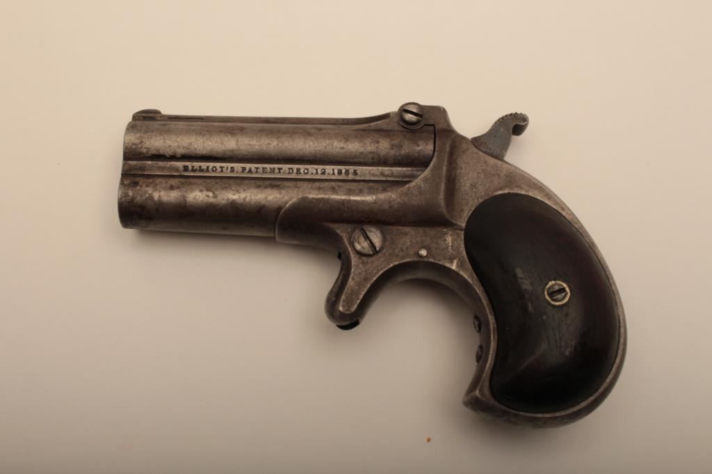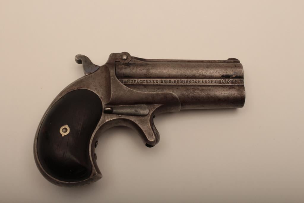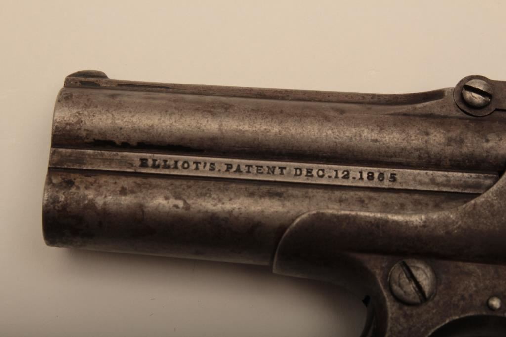 Remington 1st series Elliot patent double derringer with side address reading “Manufactured by E. Remington & Sons Ilion N.Y.” and “Elliots patent Dec 12 1866” on the reverse. No extractor. Good plus original condition with traces of blue going to patina and some good colors on the hammer and latch. Good rosewood grips with honest wear. The bores are rough. Unbroken hinge. Just honest wear and normal aging. The key variation with very few known. Dr. Rudy Johnson collection who co-authored the definitive book on this model. (Antique) Est.: $3500-$7000