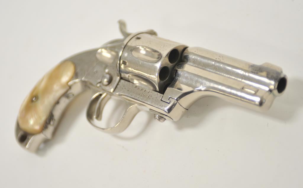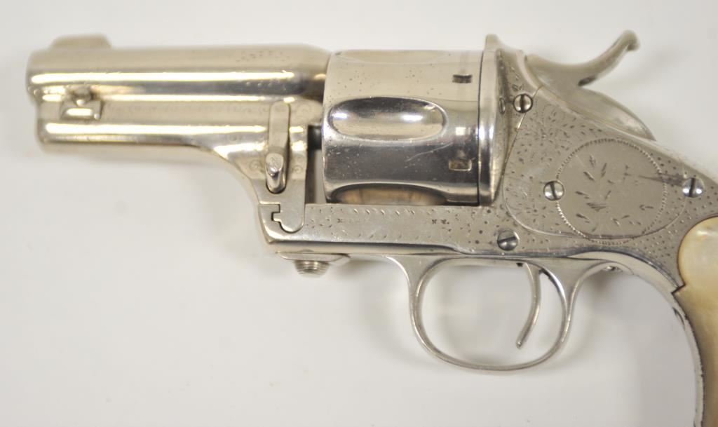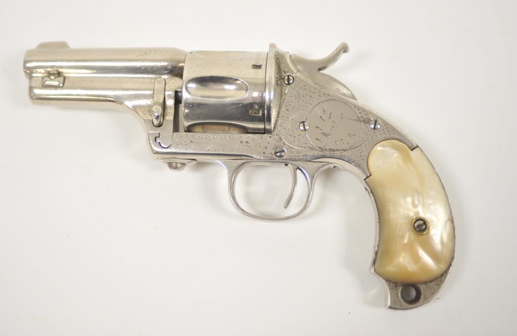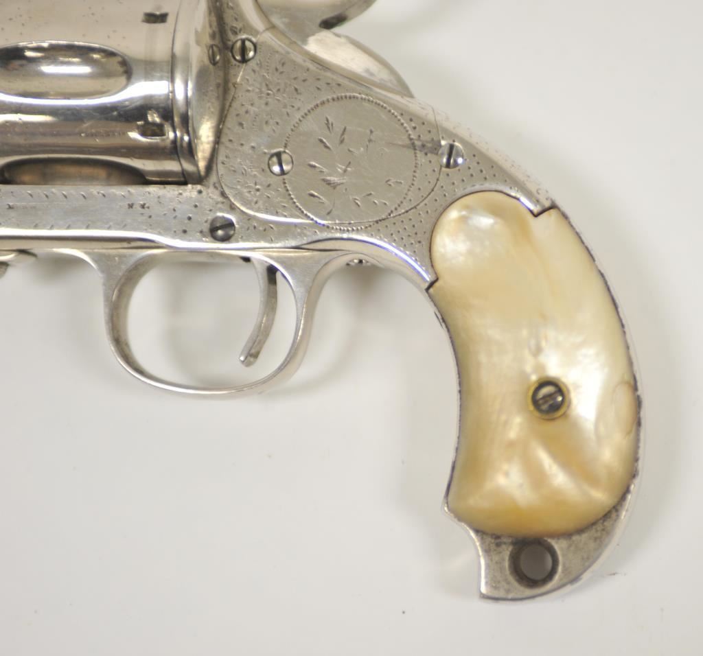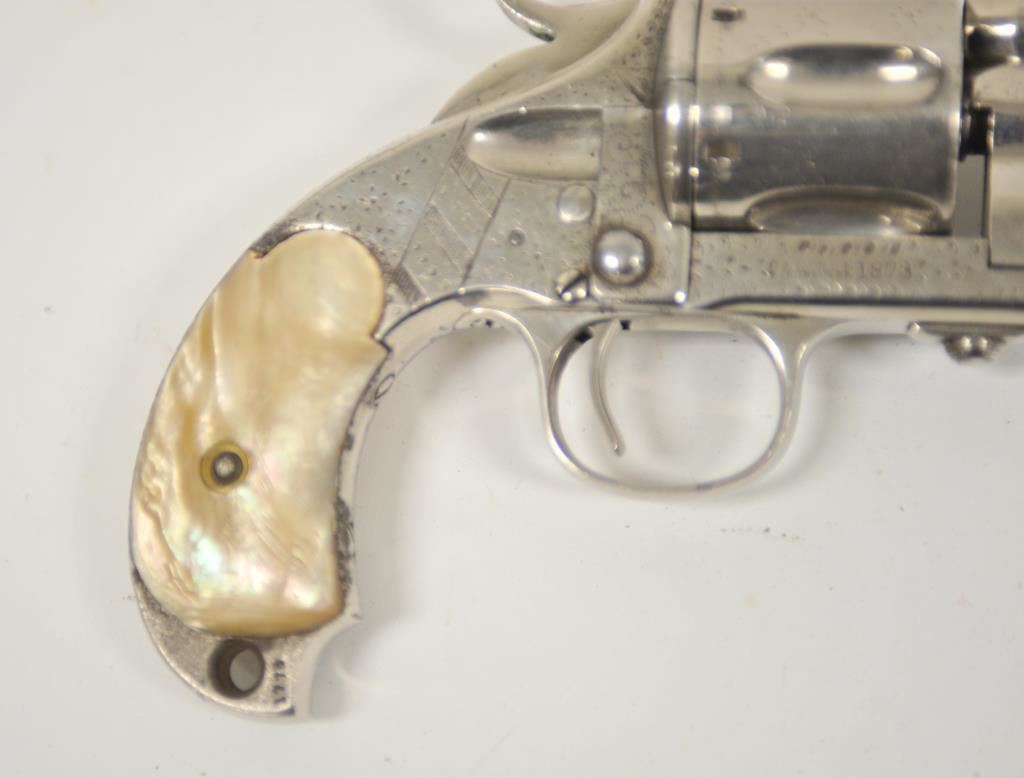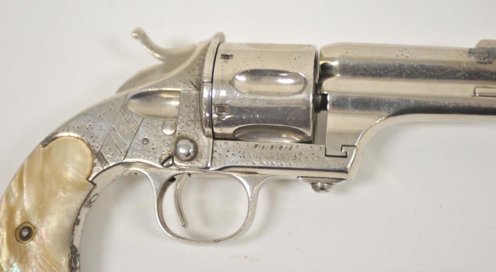 Merwin & Hulbert “Pocket Army” .44-40 caliber floral intaglio or period pinprick engraved with re-nickel plating and pearl grips, S/N 1778. 85%-95% old re-nickel finish remains and areas where finish has lifted shows gray metal patina and minor pitting and erosion. The marking on the frame are slightly weak but visible. The panel on the left shows birds. The front has been reduced and the grips are aged but good condition overall. Cocking but not locking. The bore is slightly rough. Western frontier era. (Antique) Est.: $3000-$6000