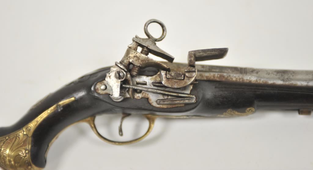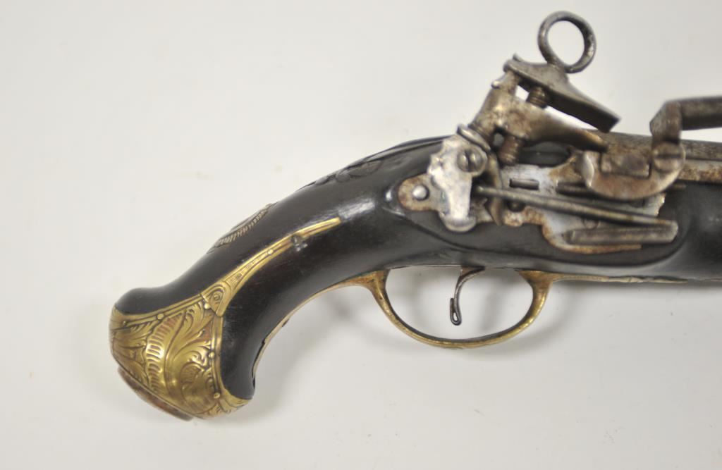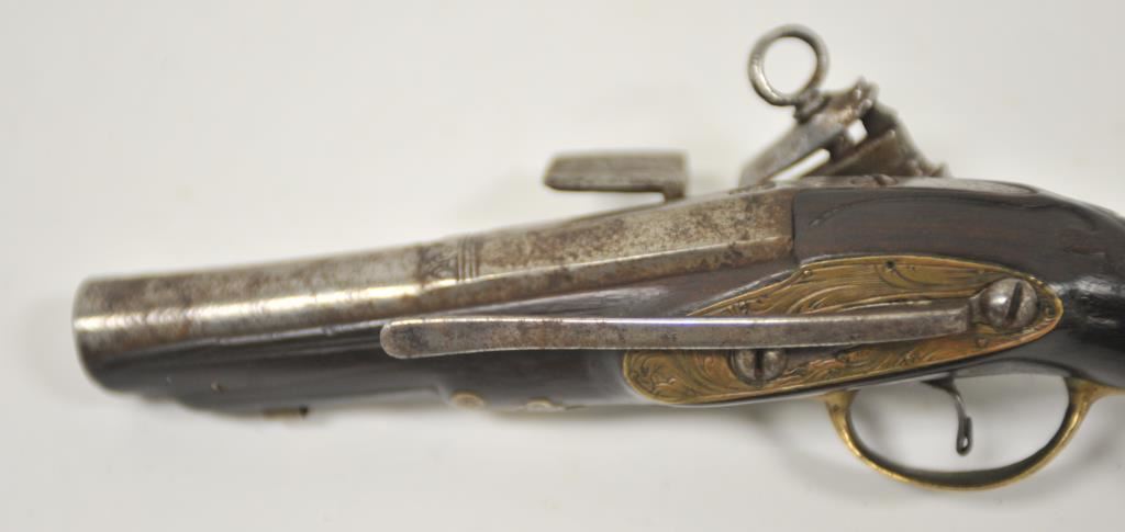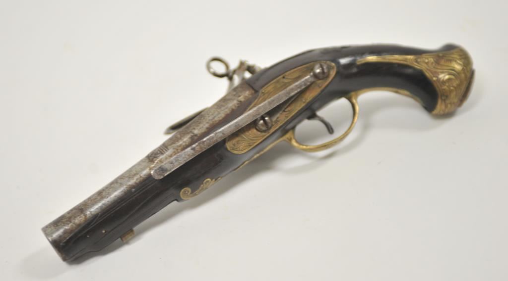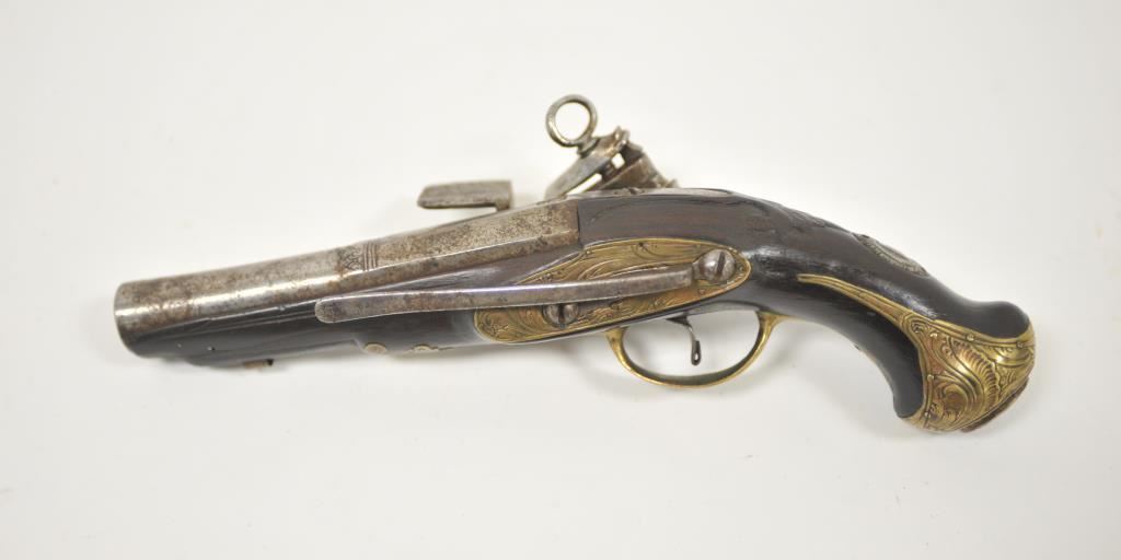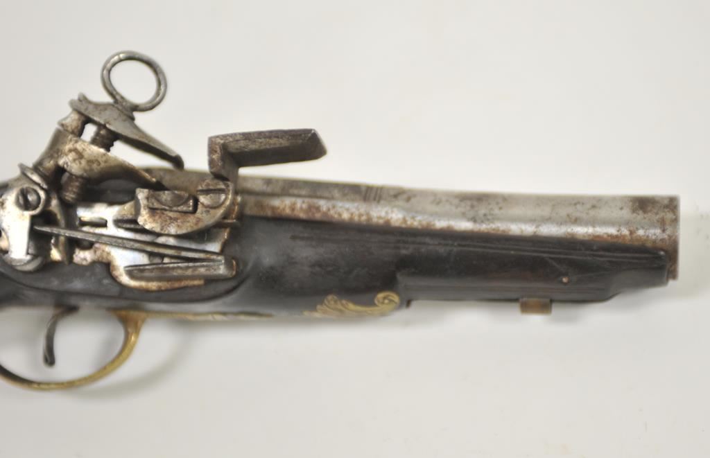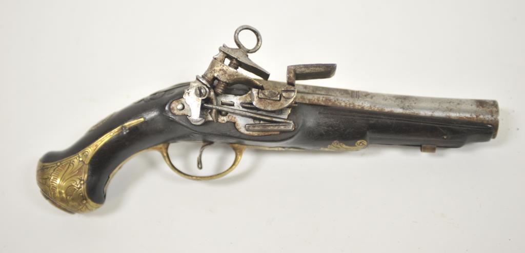Miquelet style flintlock pocket pistol with barrel marked crown over “D.T.B.” brass mounted with original belt hook retained. Ramrod missing. Measures 10 5/8” overall with a 5 5/8” barrel of almost .70caliber smoothbore. Good condition with light new rust and some pitting which may clean. The stock is very good. Working. Some wear to pewter inlay at the butt and on the wrist. Would improve with T.L.C. and minor restoration. Circa 1780-1810 approximately. (Antique) Est.: $600-$1200