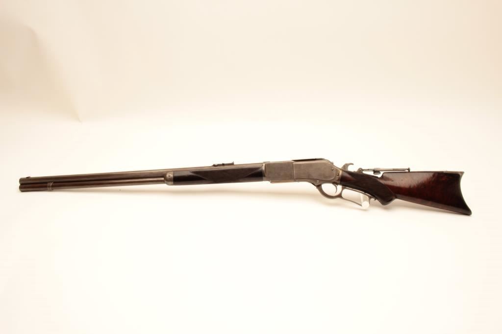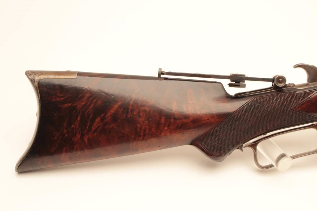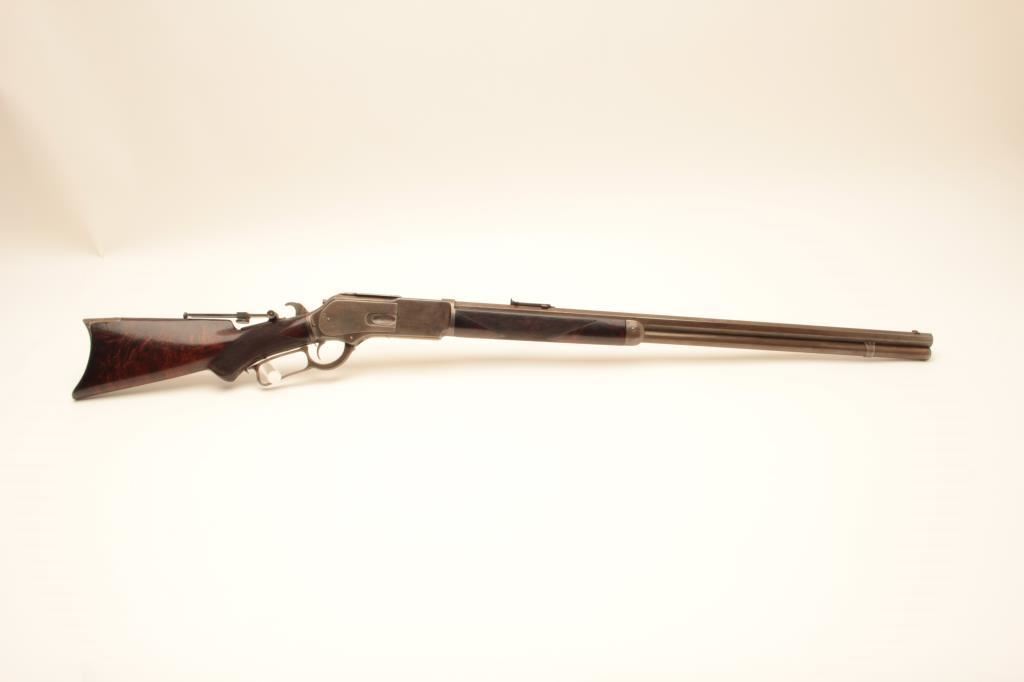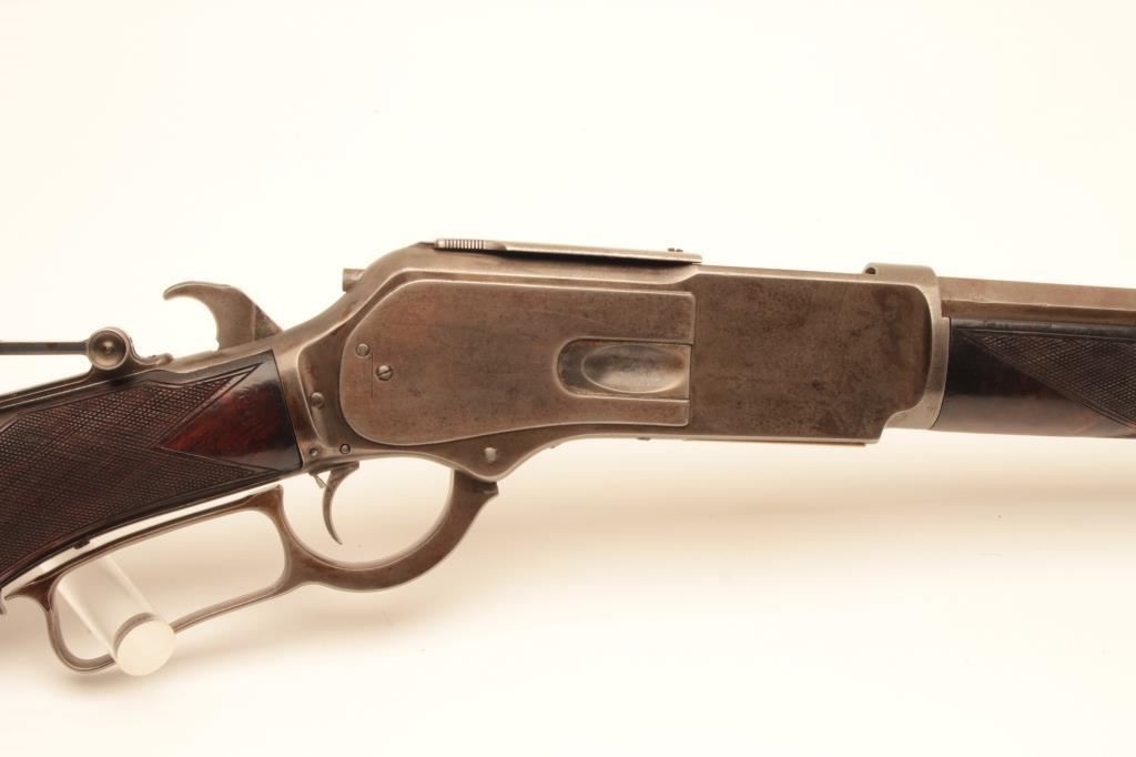 Winchester Deluxe Model 1876 lever action rifle, .45 caliber, 28” octagon barrel, brown patina, deluxe checkered semi-pistol grip butt stock with beautiful graining, adjustable tang sight, S/N 33775; overall very good + condition with a good bore, good markings and very good wood; action is crisp however single set trigger is not working and does not drop hammer when trigger pulled. (Antique). Est.: $6,000-$12,000.