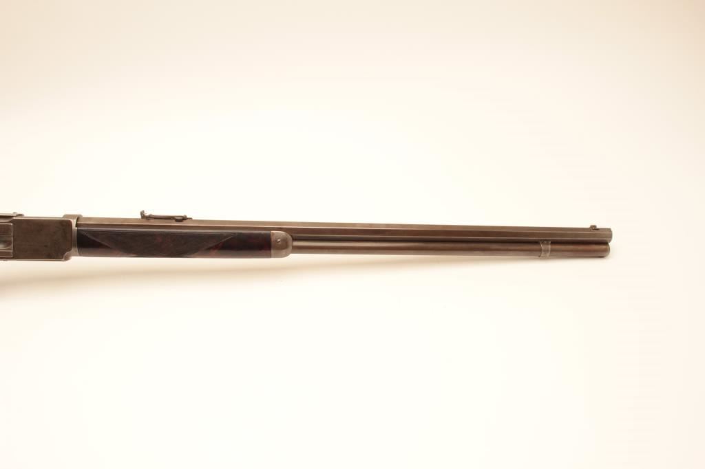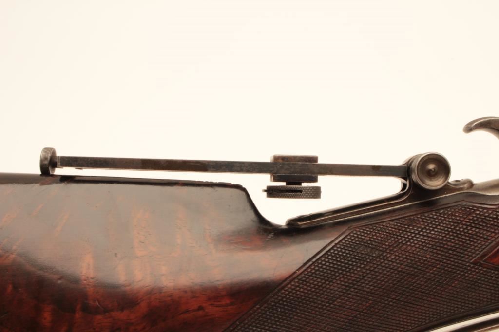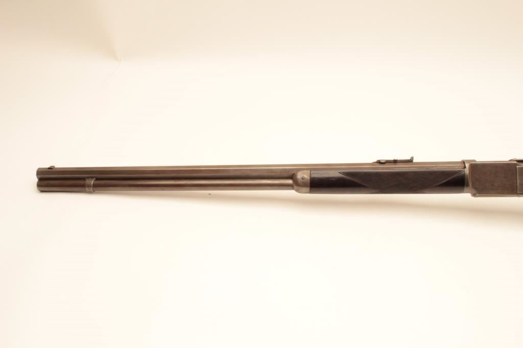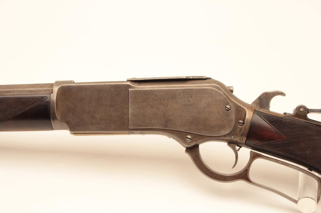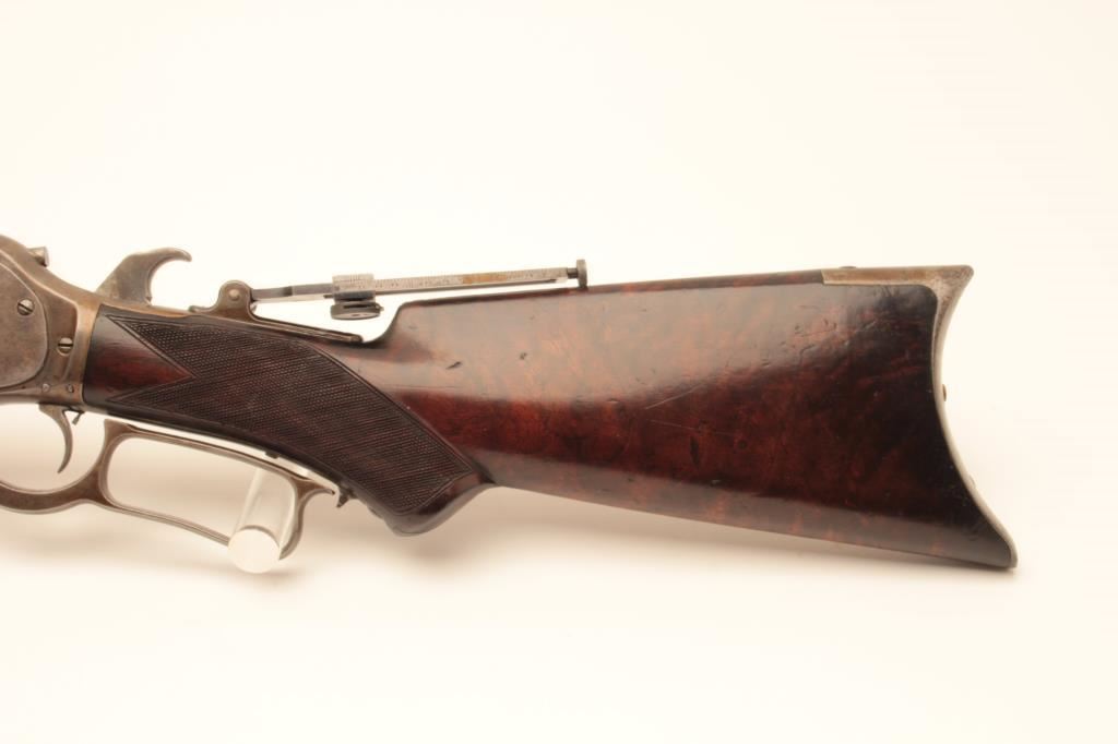 Winchester Deluxe Model 1876 lever action rifle, .45 caliber, 28” octagon barrel, brown patina, deluxe checkered semi-pistol grip butt stock with beautiful graining, adjustable tang sight, S/N 33775; overall very good + condition with a good bore, good markings and very good wood; action is crisp however single set trigger is not working and does not drop hammer when trigger pulled. (Antique). Est.: $6,000-$12,000.