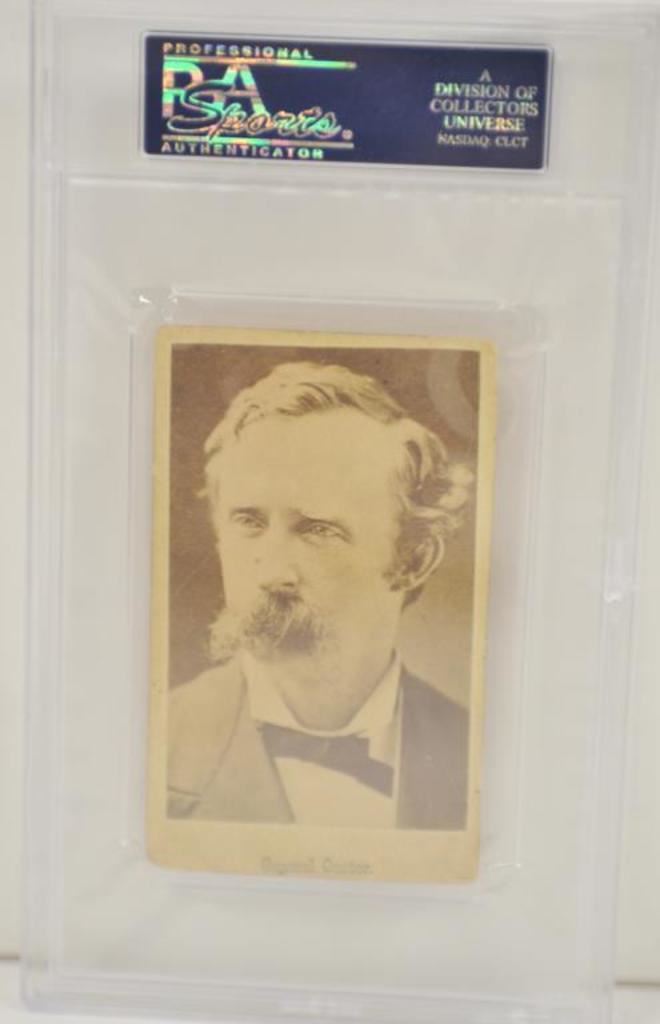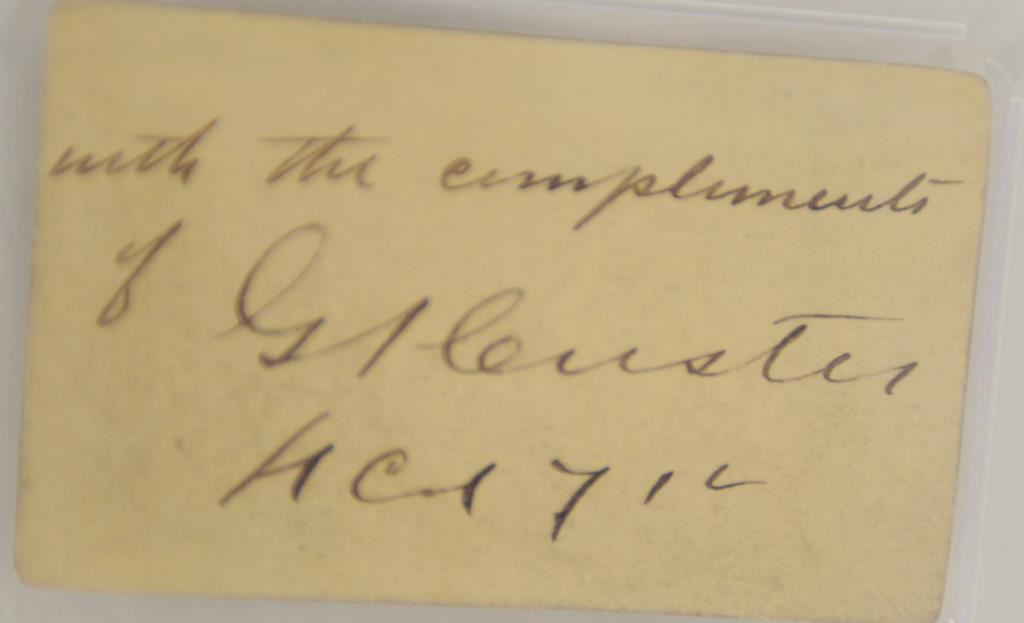 Original Carte D’ Visite of General Custer hand signed on reverse “with compliments of G.A. Custer, L.C. (Lt. Col. 7th Cav) and in P.S.A. (Collector’s Universe) slab. Certified authentic signature. Very rare to find George Armstrong Custer’s signature and Lt. Col. Also desirable with 7th Cav and rare. The only such signature and inscription we have seen offered in 50 years! Period shortly before The Little Big Horn Battle. Est.: $7500-$15,000+.