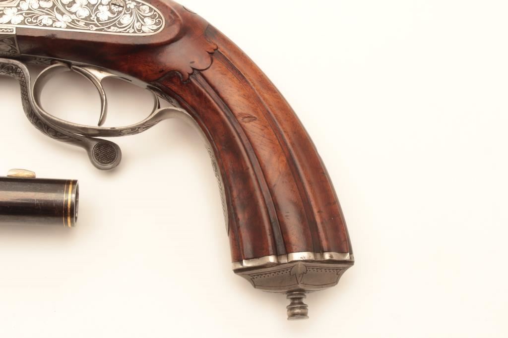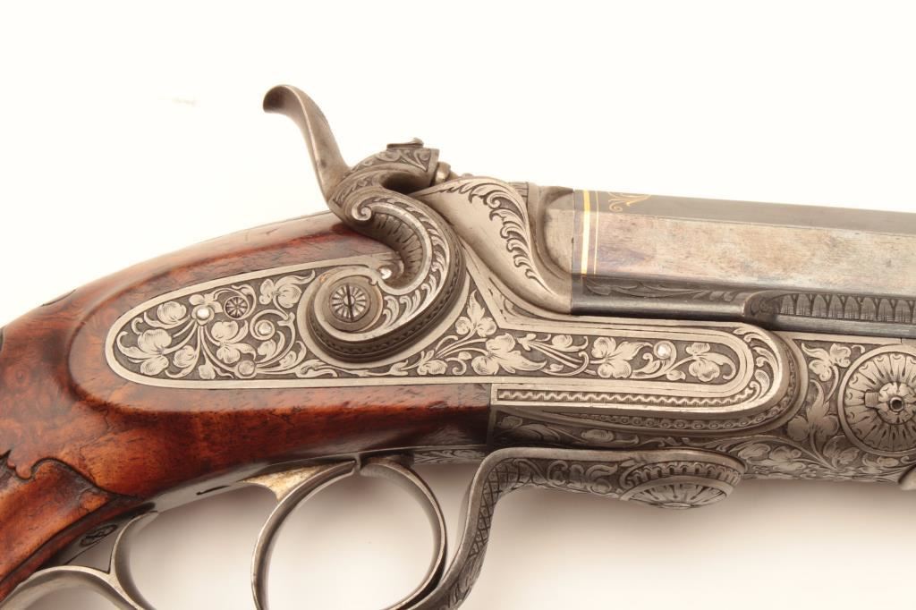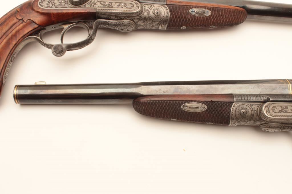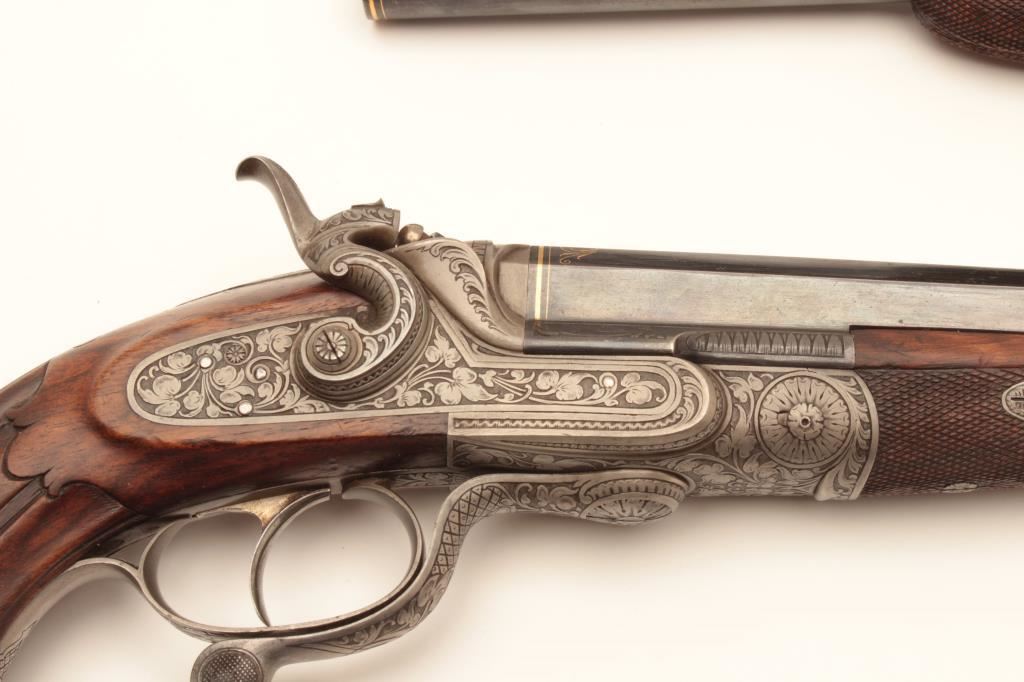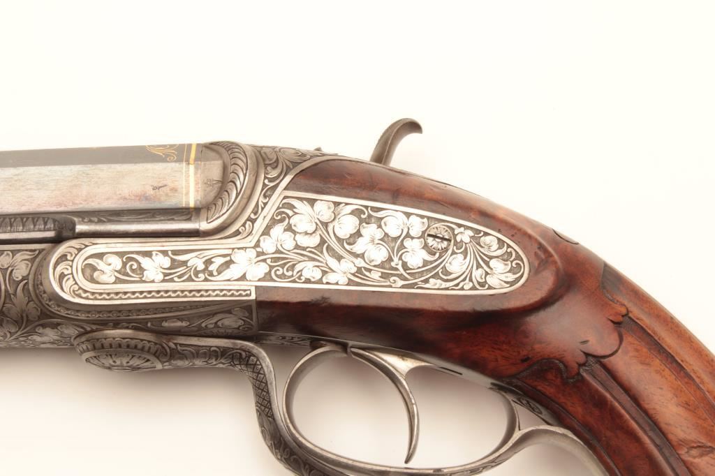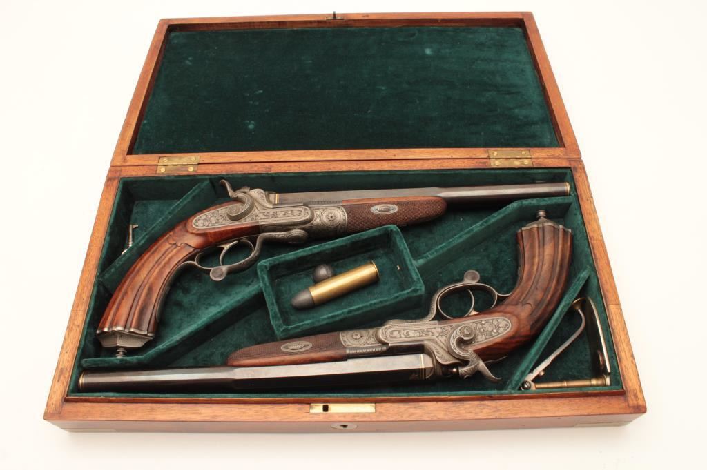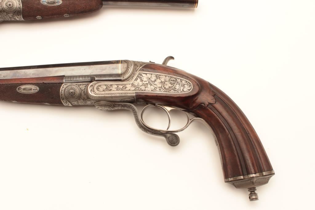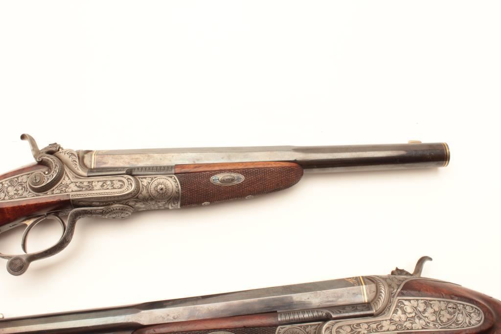 Presentation wood cased pair of massive German single shot pistols, approximately .67 caliber, 11.25” blued barrels marked in gold “G. E. Nies, Hanau”; floral engraved frames, side plates, hammers and under lever barrel release; finely grained and checkered wood forend and grip stock; overall fine to excellent condition with excellent bores, crisp actions and fine wood; majority of bright blue original finish remains and beautifully accomplished engraving. Casing is overall fine with brass corners and brass escutcheon in middle of lid; accompanied by one round of ammunition and brass and steel accessory. (Antique). Est.: $9,000-$18,000.
