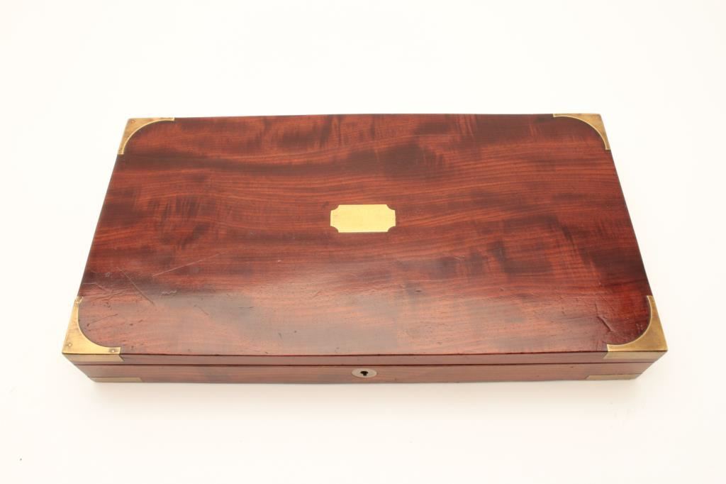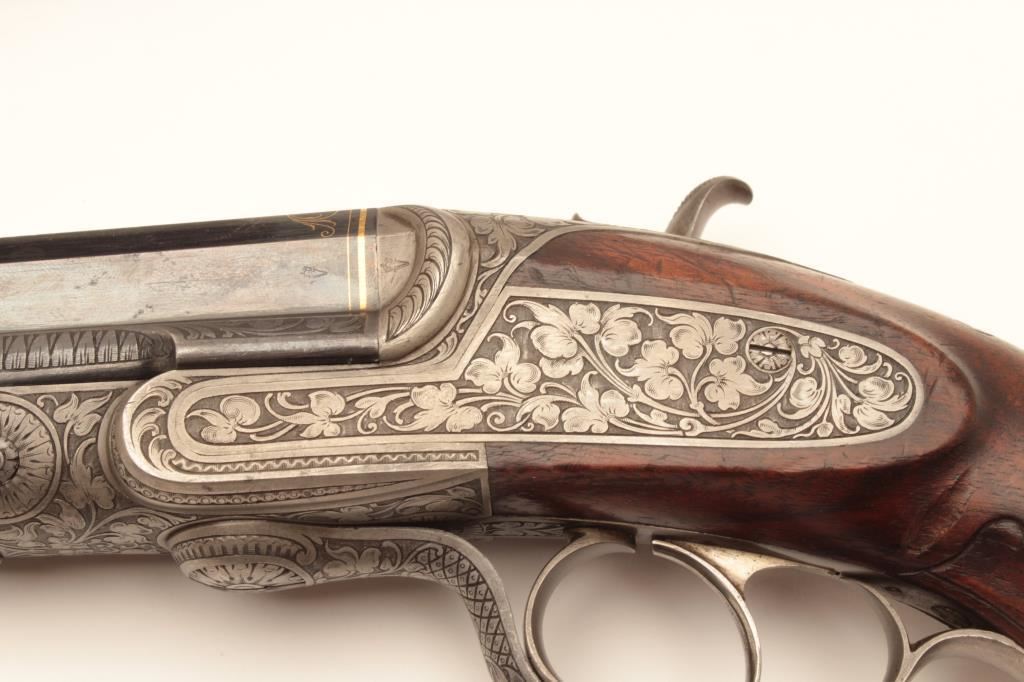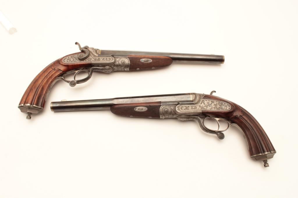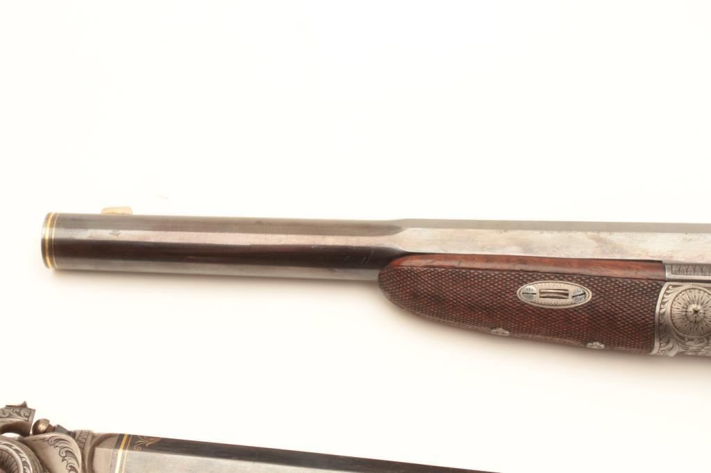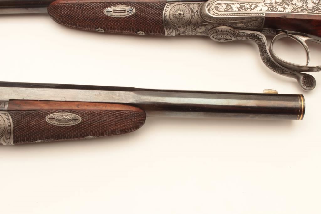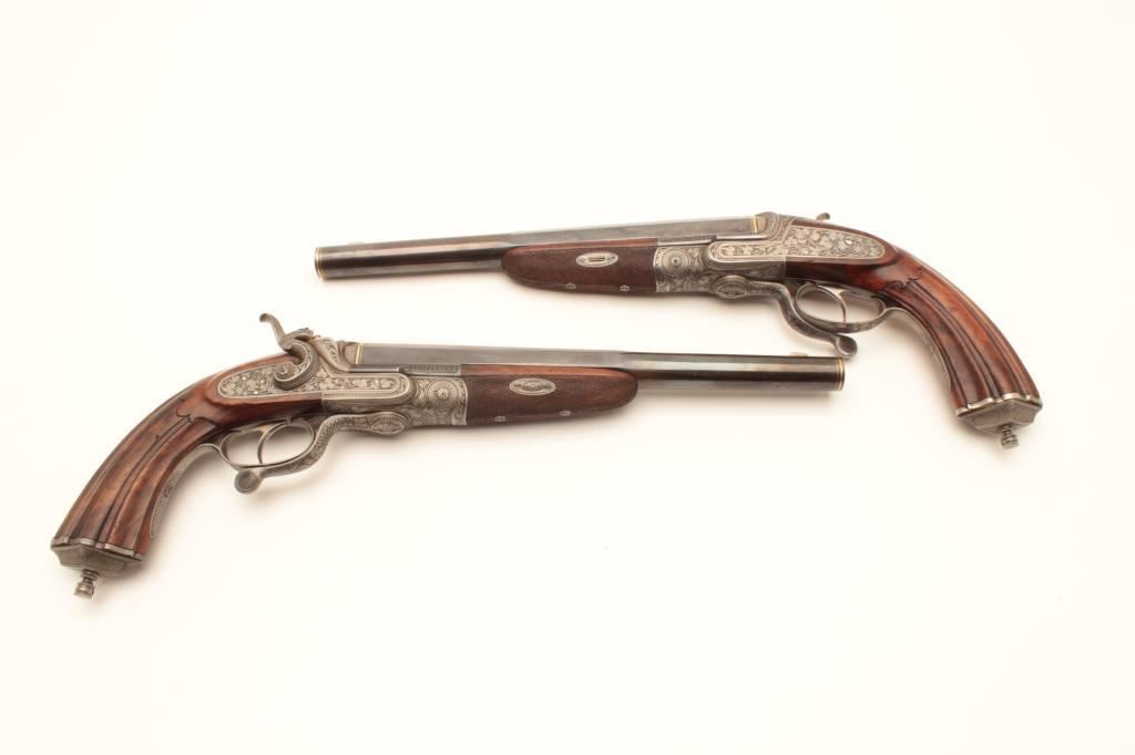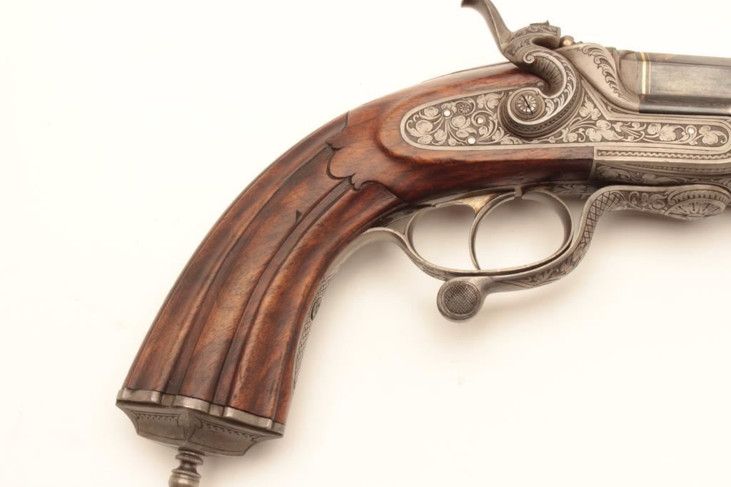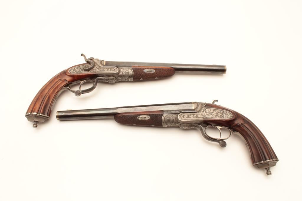 Presentation wood cased pair of massive German single shot pistols, approximately .67 caliber, 11.25” blued barrels marked in gold “G. E. Nies, Hanau”; floral engraved frames, side plates, hammers and under lever barrel release; finely grained and checkered wood forend and grip stock; overall fine to excellent condition with excellent bores, crisp actions and fine wood; majority of bright blue original finish remains and beautifully accomplished engraving. Casing is overall fine with brass corners and brass escutcheon in middle of lid; accompanied by one round of ammunition and brass and steel accessory. (Antique). Est.: $9,000-$18,000.