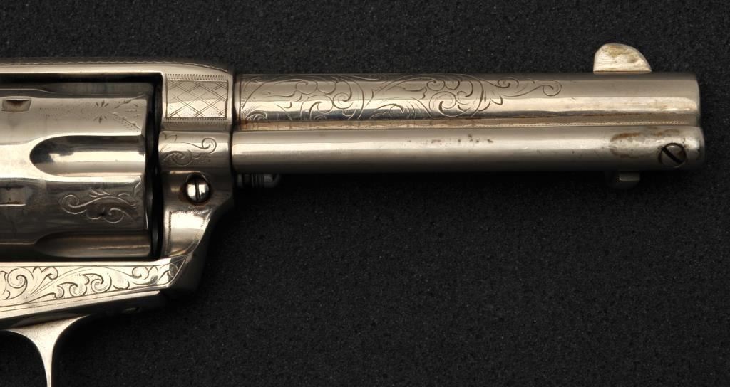 Colt Single Action Army in .38-40 caliber with a 4 ¾” barrel, Nickel plated, pearl grips, factory engraved, sold to Victoria Hardware, C/O Simmons Hardware, St. Louis, Missouri, Aug 21, 1909, 1 gun in shipment. Victoria hardware was thought to be in Victoria, TX but not verified. This Colt retains 95%-98% old re-nickeled finish. The markings and engraving are somewhat light from heavy polishing. The thick pearl grips fit impeccably and have iridescent hues and are very good plus. Good action with fair bore. Factory engraved .38-40s with a 4 ¾” barrels are not common. (C&R/No PPT) Est.: $6,000-$12,000