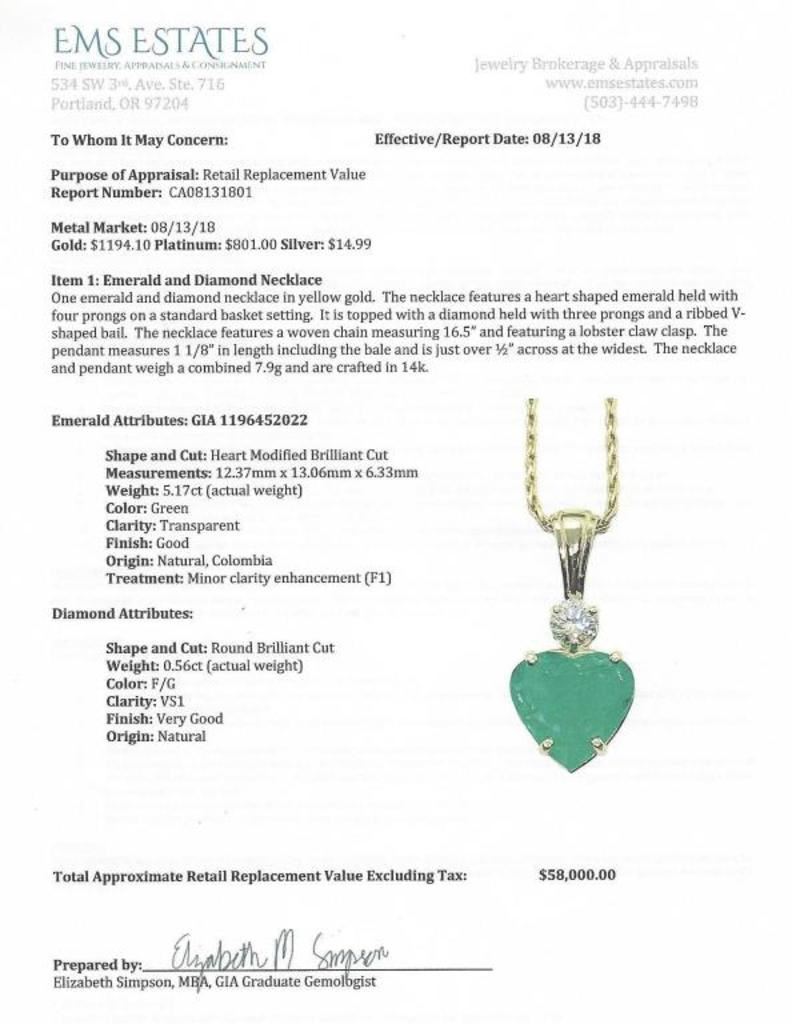 Show Shopping Fine Luxury Piece - G.I.A. certified 5.17 carat Natural Colombian Emerald and Diamond Pendant featuring a gorgeous heart shaped Emerald with vivid color perfectly accented with a Fine round cut Diamond weighing 0.56 carats with F-G color and VS1 clarity set in 14 karat yellow gold setting. Exceptional Fine Quality Collectors Piece. Full Appraised Value $58,000.00 Estimates $15,000-$20,000