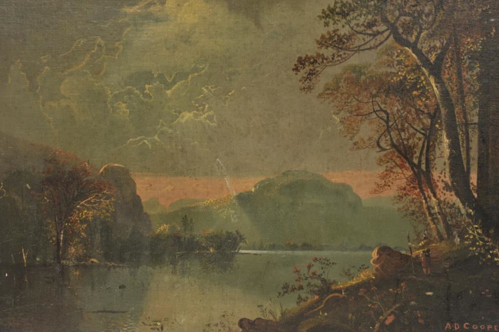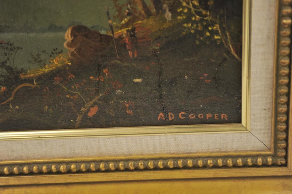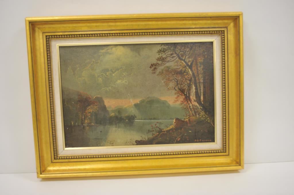 Framed oil on canvas of lake scene by A.D. Cooper, approximately 23” x 29” overall. Est.: $500-$1,000.