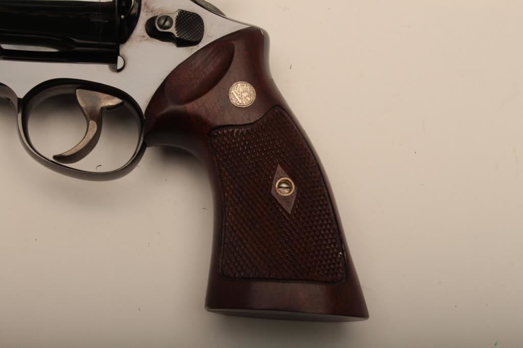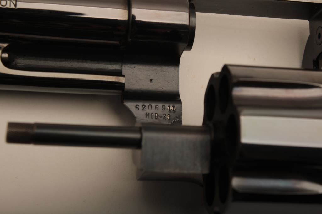 Smith & Wesson 29 4 screw double action revolver in .44 Mag caliber with a 6 ½” barrel, target sights and features, early checkered wood grips, S/n S206911. Fine to near excellent condition with 96%-98% original blue and a slight index line on the cylinder. 75%-85% case colors on the hammer and trigger. Sharp lettering and S&W logo. The grips are almost fine with slight cleaning but sharp checkering. Tight action and fine bore. A 9 on a 1-10 scale. Dirty Harry’s favorite! (C&R/PPT) Est.: $1500-$3000