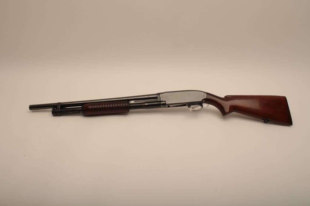 Winchester Model 12 U.S. Marked 12GA riot shotgun with 20” cylinder choked barrel, S/N 984652. 80%-90% original thinning blue finish with polishing to the edge of operating rod attached to pump mechanism. Stock lightly refinished showing outline of cartouche and R.I.A. Fire bomb proof at the breech and two Winchester proofs on the barrel and frame. Some minor pitting and erosion. Military type sling swivels. Original butt plate. Extended thumb safety with fancy knurling added (Probably P.D. as these were bought surplus and used by police agencies nationwide after WWII). A good example that’s genuine U.S. issue. (C&R). Est.: $500-$1000