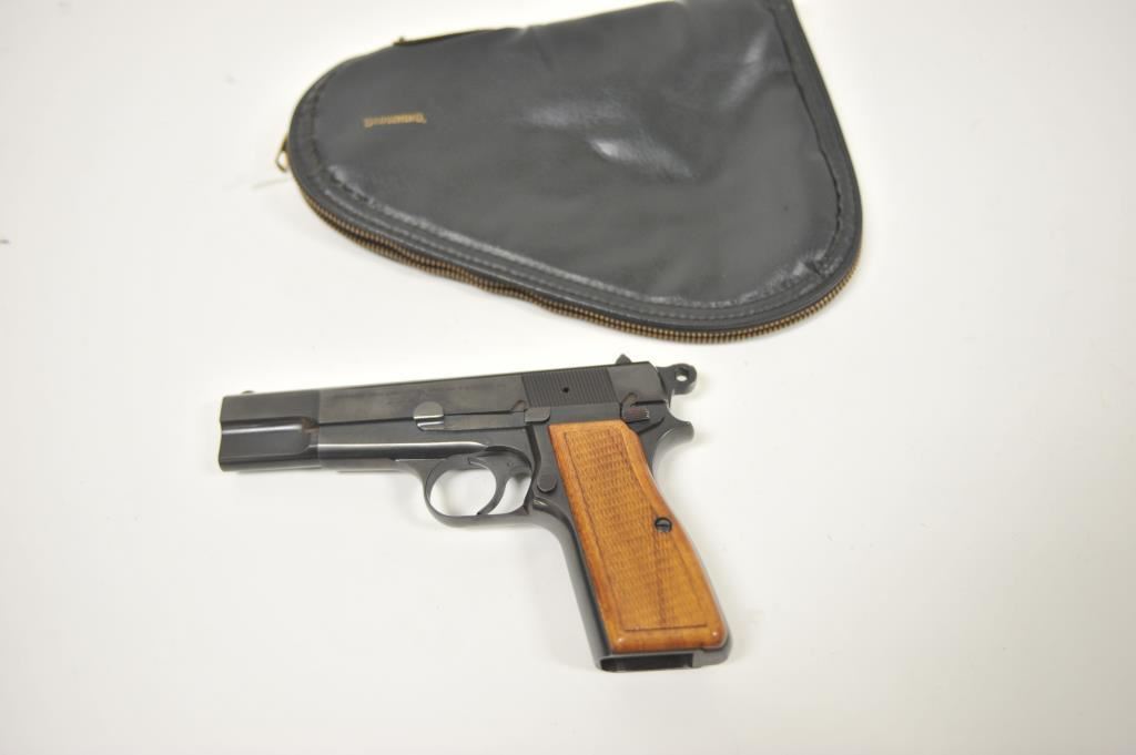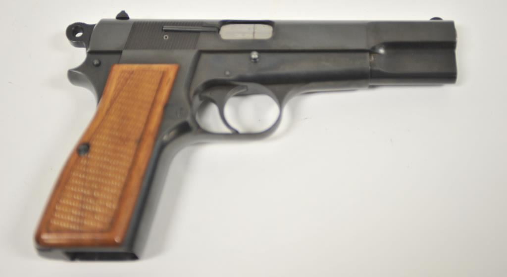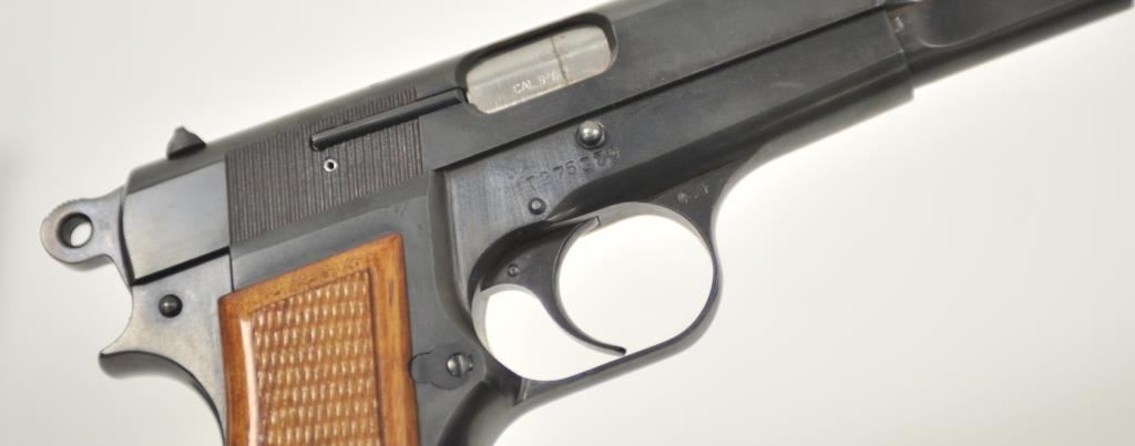 Belgian Browning Hi-Power semi-automatic pistol, 9mm caliber, Serial #T275379. The pistol is in excellent overall condition with a 4 ½” barrel with a blade front and standard rear sights. The pistol retains approximately 98%-99% plus of its original blue finish with only light storage and handling marks. The checkered wood grips are in excellent condition as well with sharp checkering and red interior. The lot includes a black leather Browning marked boot, and one correct magazine. The bore is very good, the action is crisp and markings are sharp on this desirable Browning. Est.: $800-$1,600. (Modern/PPT).